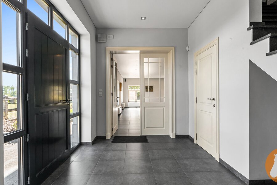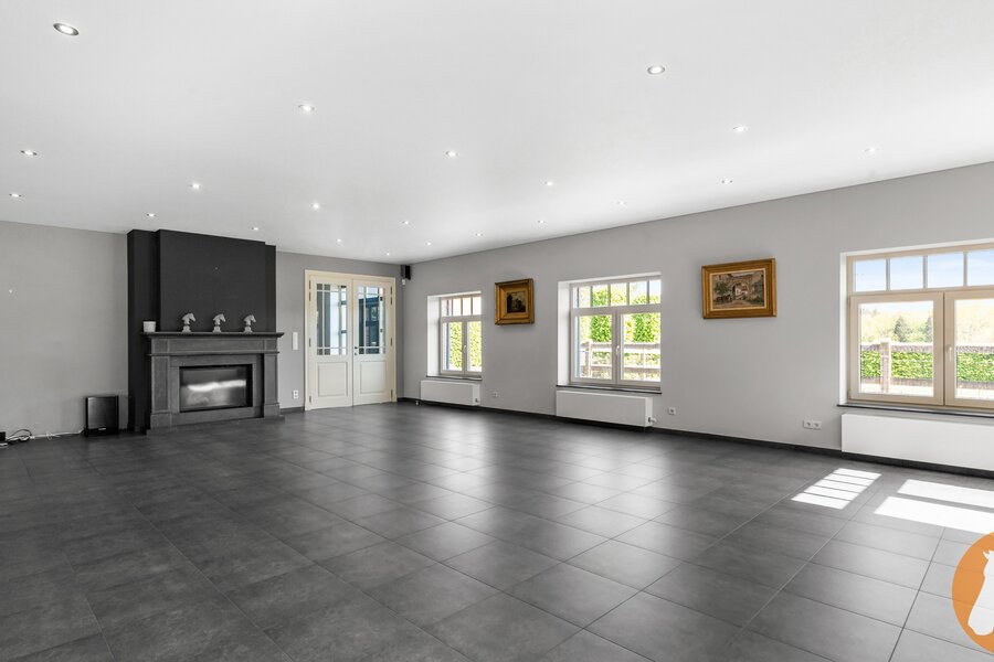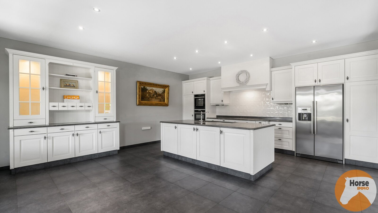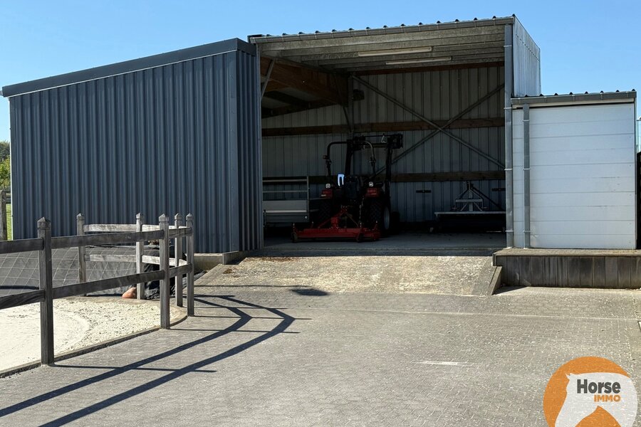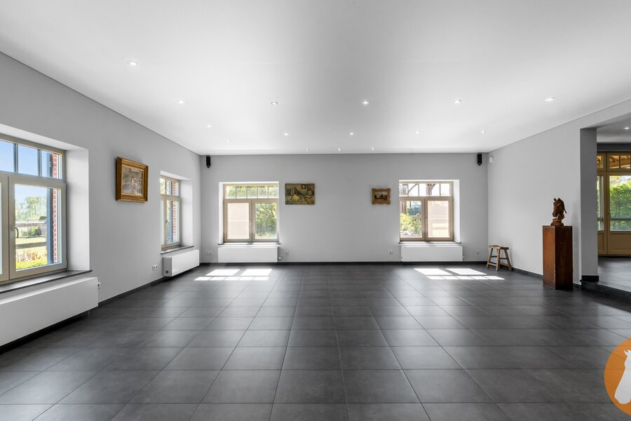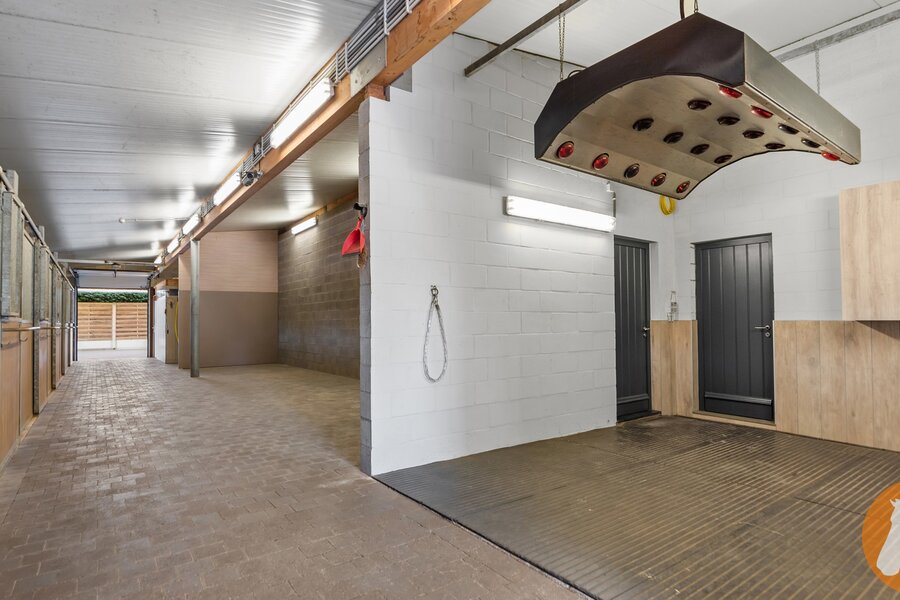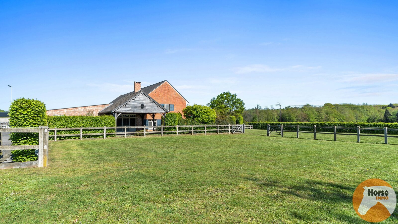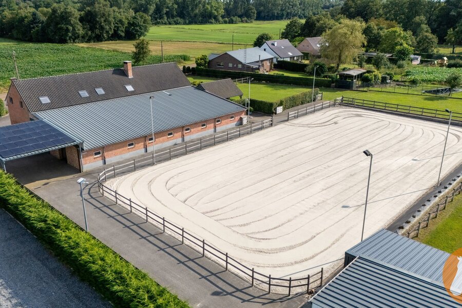 Deze statige hoeve onderging in 2008 een totaalrenovatie waarbij er veel aandacht werd besteed aan kwalitatieve materialen. De hoeve is zeer groot en omvat momenteel aan de linkerzijde het woongedeelte en aan de rechterzijde een 2e woongedeelte (momenteel kantoor). Direct aanpalend aan de achterzijde van de hoeve en met een directe toegang vanuit de woning werd er in 2008 een stalgebouw aangebouwd waarin diverse opslagruimtes en zadelkamer, een wasplaats met solarium en 8 nette paardenboxen. Er is tevens ruimte om nog 4 bijkomende boxen te plaatsen in dit gebouw alsook treffen we hier nog een zeer praktisch garage met hoge poort.