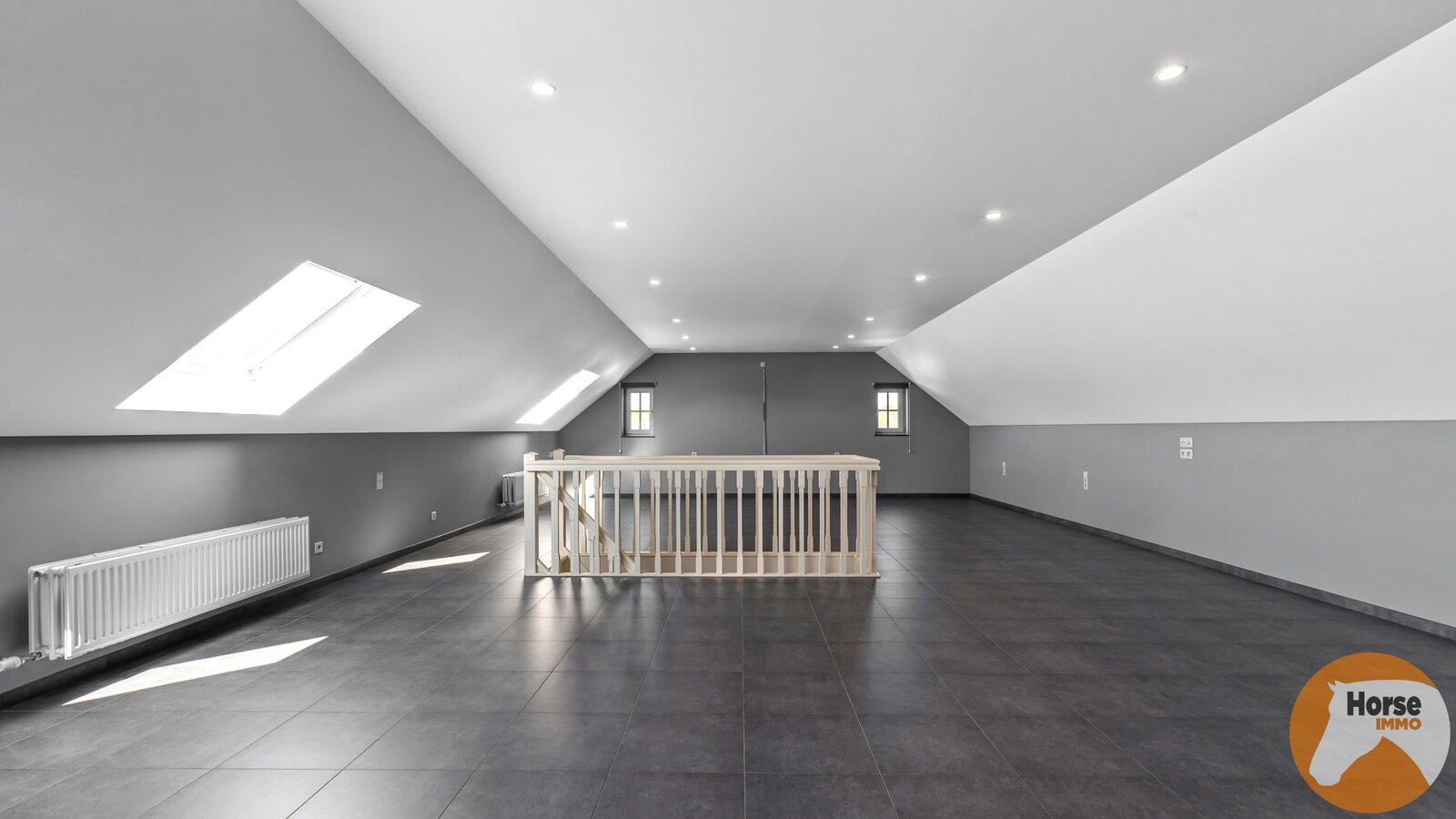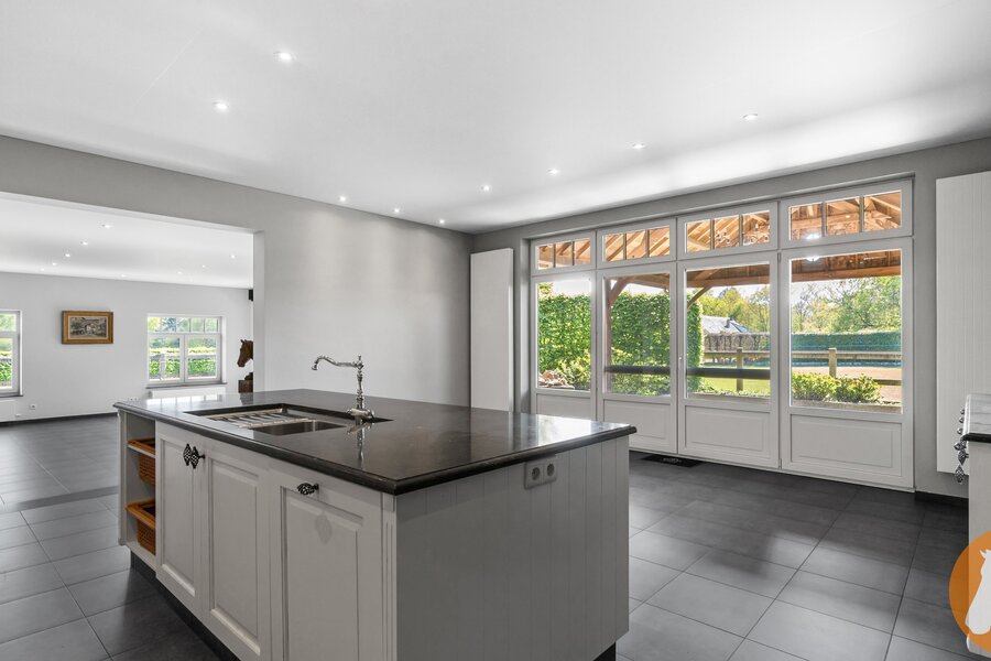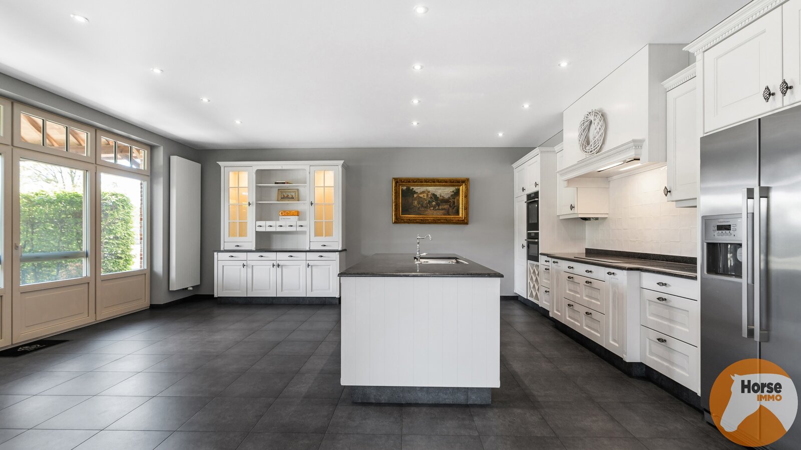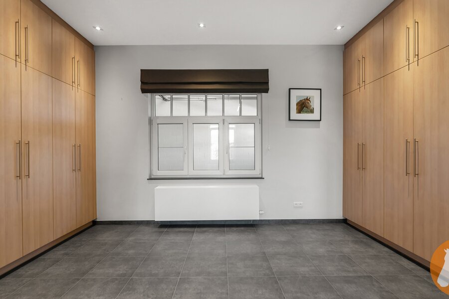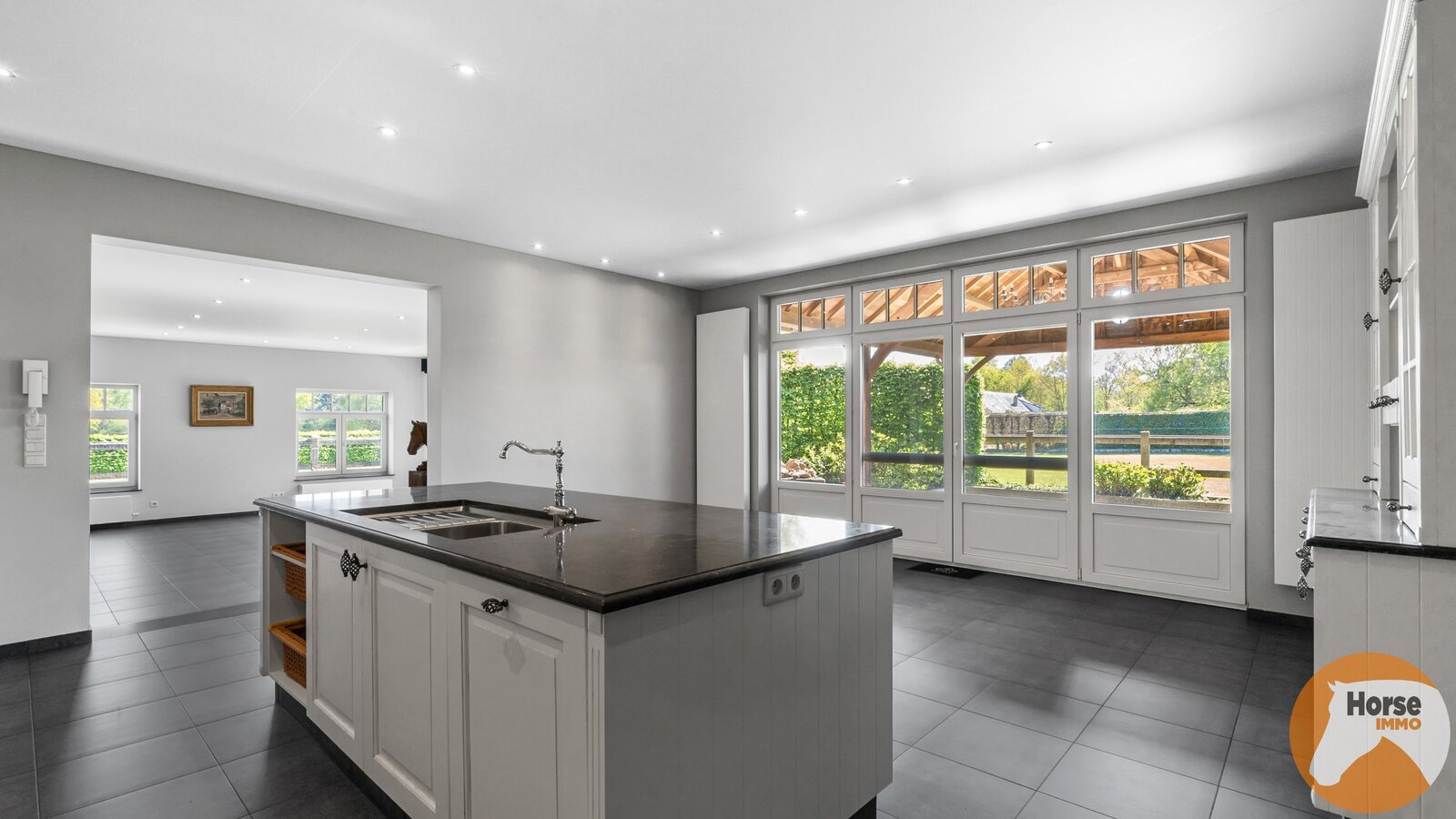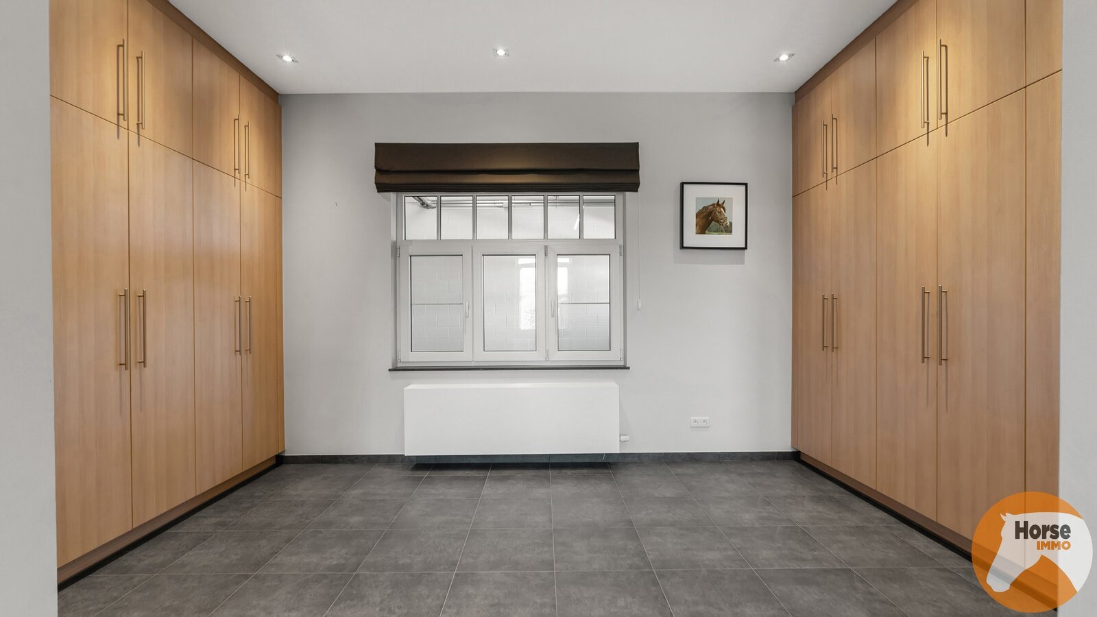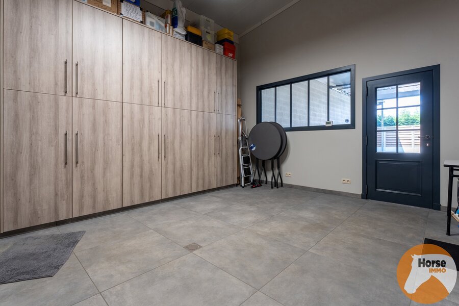 Deze statige hoeve onderging in 2008 een totaalrenovatie waarbij er veel aandacht werd besteed aan kwalitatieve materialen. De hoeve is zeer groot en omvat momenteel aan de linkerzijde het woongedeelte en aan de rechterzijde een 2e woongedeelte (momenteel kantoor). Direct aanpalend aan de achterzijde van de hoeve en met een directe toegang vanuit de woning werd er in 2008 een stalgebouw aangebouwd waarin diverse opslagruimtes en zadelkamer, een wasplaats met solarium en 8 nette paardenboxen. Er is tevens ruimte om nog 4 bijkomende boxen te plaatsen in dit gebouw alsook treffen we hier nog een zeer praktisch garage met hoge poort.