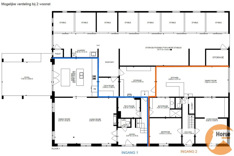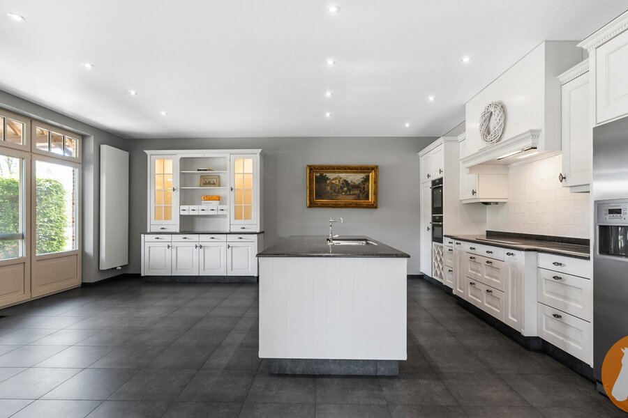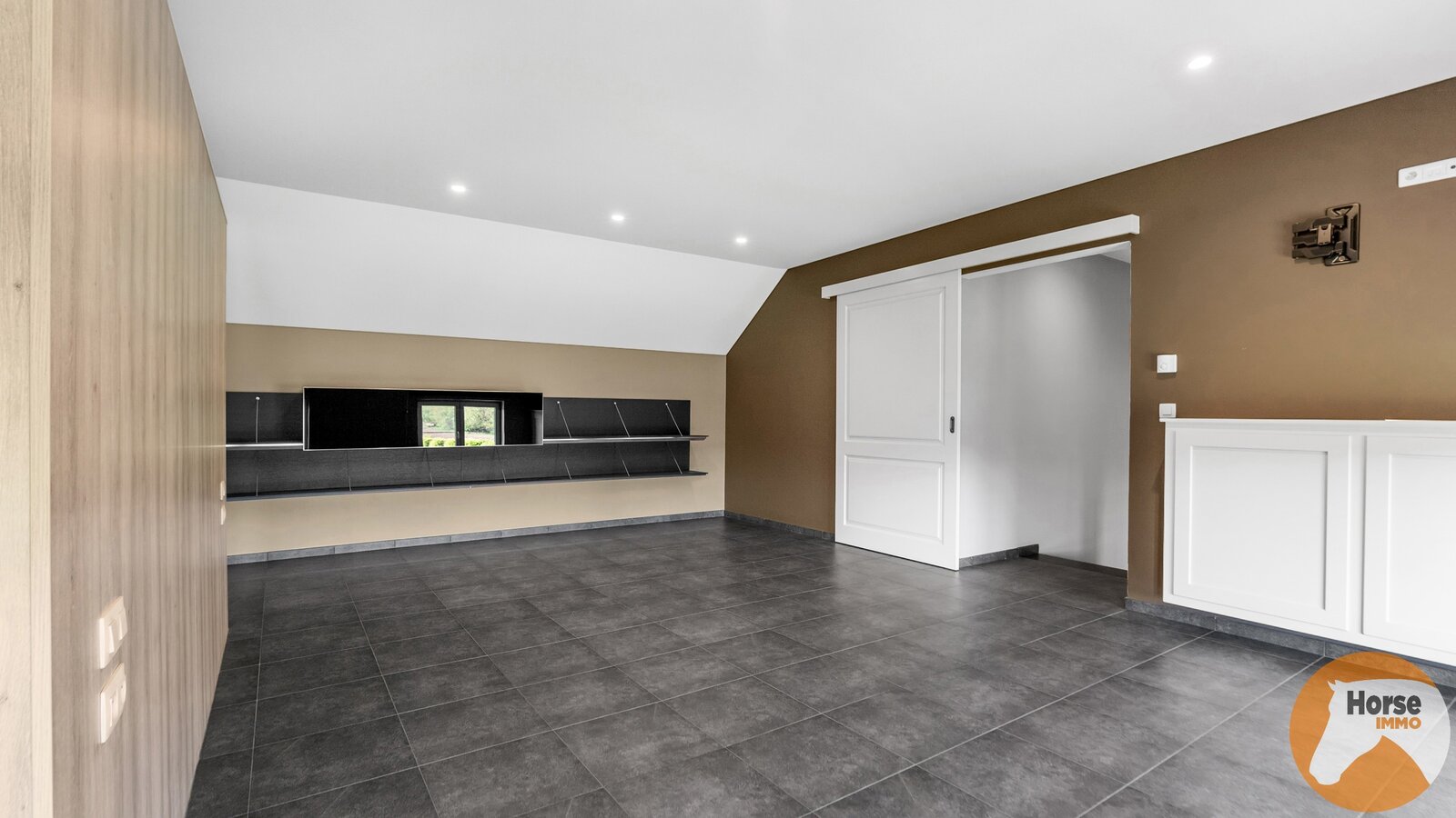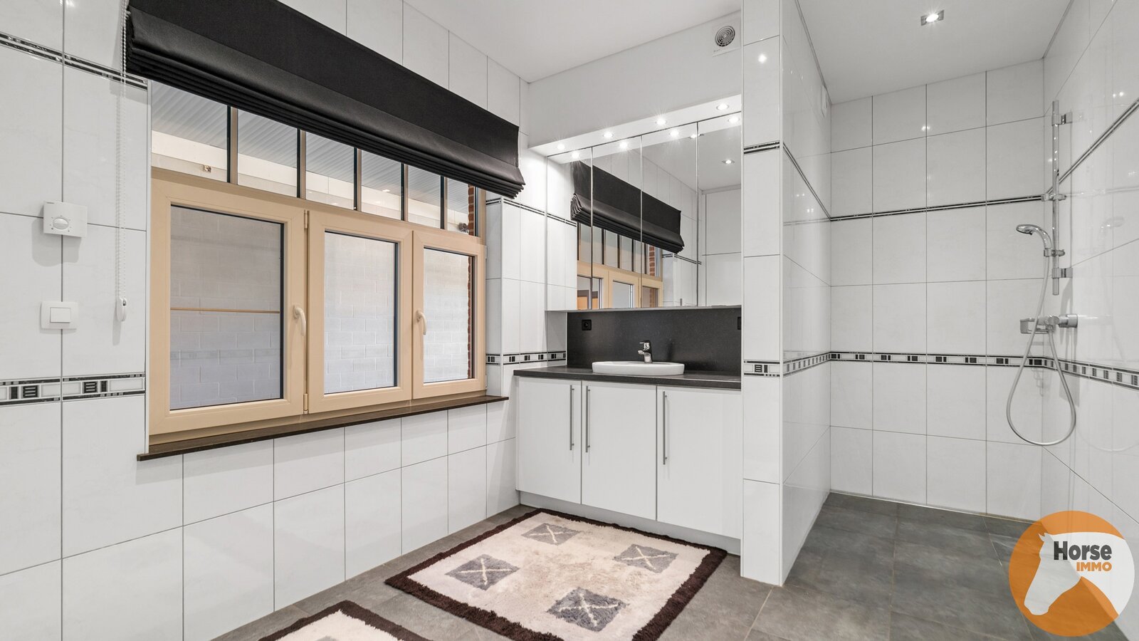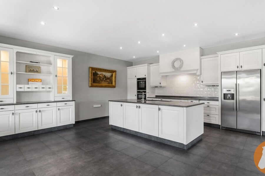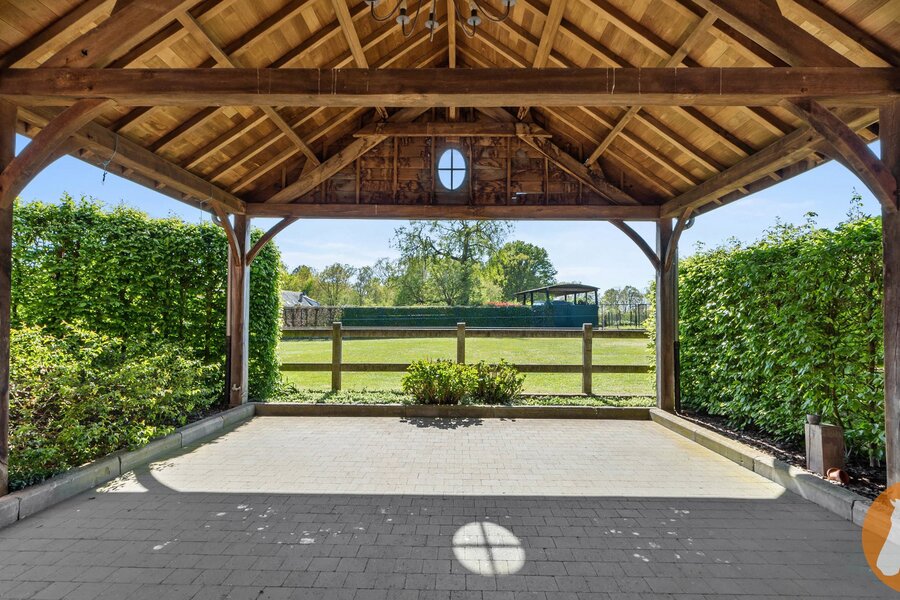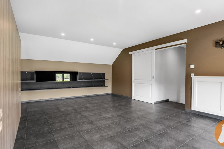 Deze statige hoeve onderging in 2008 een totaalrenovatie waarbij er veel aandacht werd besteed aan kwalitatieve materialen. De hoeve is zeer groot en omvat momenteel aan de linkerzijde het woongedeelte en aan de rechterzijde een 2e woongedeelte (momenteel kantoor). Direct aanpalend aan de achterzijde van de hoeve en met een directe toegang vanuit de woning werd er in 2008 een stalgebouw aangebouwd waarin diverse opslagruimtes en zadelkamer, een wasplaats met solarium en 8 nette paardenboxen. Er is tevens ruimte om nog 4 bijkomende boxen te plaatsen in dit gebouw alsook treffen we hier nog een zeer praktisch garage met hoge poort.
