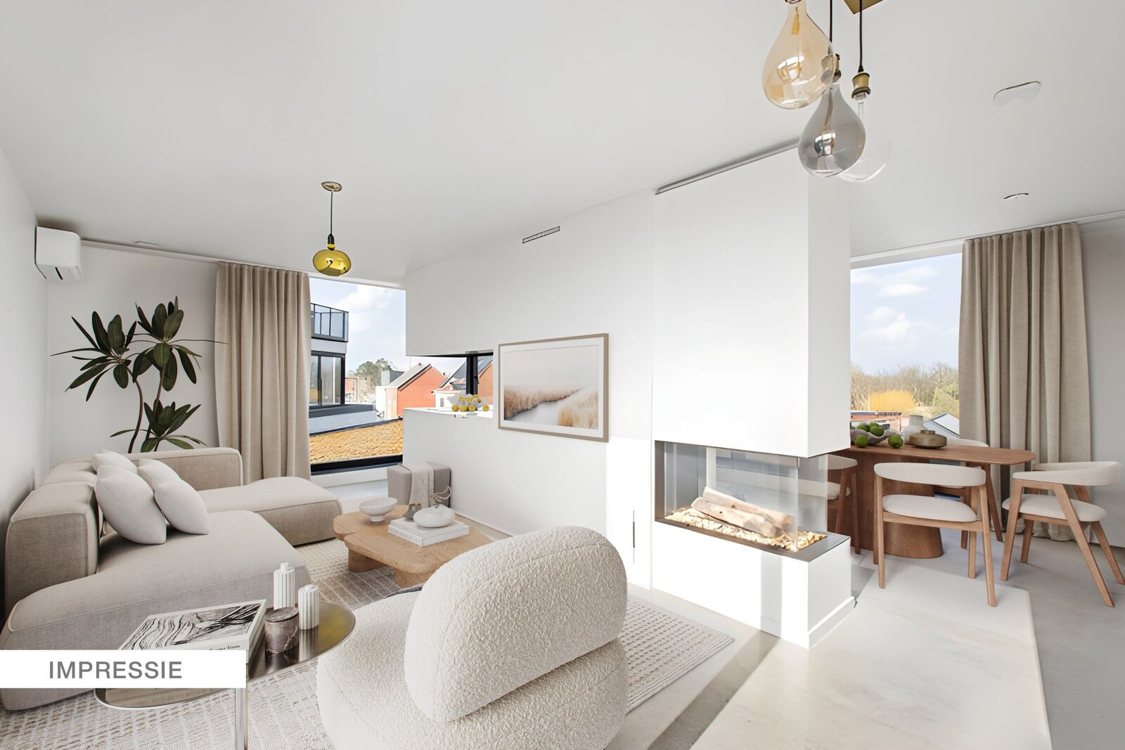 Via de privélift kom je rechtstreeks binnen in het penthouse, waar een lichtrijke leefruimte met open indeling je verwelkomt. De gashaard vormt een gezellige blikvanger en zorgt voor een natuurlijke verbinding tussen de leefruimte, eetplaats en keuken.