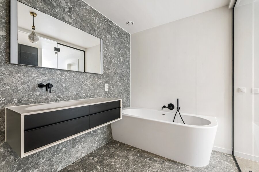 Het penthouse beschikt verder over twee ruime slaapkamers en een moderne badkamer met ligbad en inloopdouche, afgewerkt met duurzame materialen.