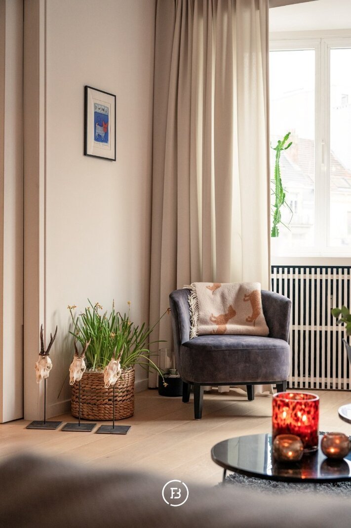 Disposition : grand hall d'entrée avec vestiaire, toilettes invités et un débarras séparé. Le salon lumineux se connecte parfaitement à la salle à manger et à un grand coin bureau. Grâce à une porte coulissante, le salon et la salle à manger peuvent être séparés au besoin. La cuisine moderne est équipée de tous les appareils nécessaires et donne accès à une petite terrasse. En outre, l'appartement compte deux chambres à coucher complètes, dont une chambre principale avec salle de bains attenante comprenant double vasque, baignoire et toilettes. Dans le couloir de nuit se trouvent également une pièce supplémentaire (idéale comme chambre d'enfant ou dressing) et une buanderie pratique.
