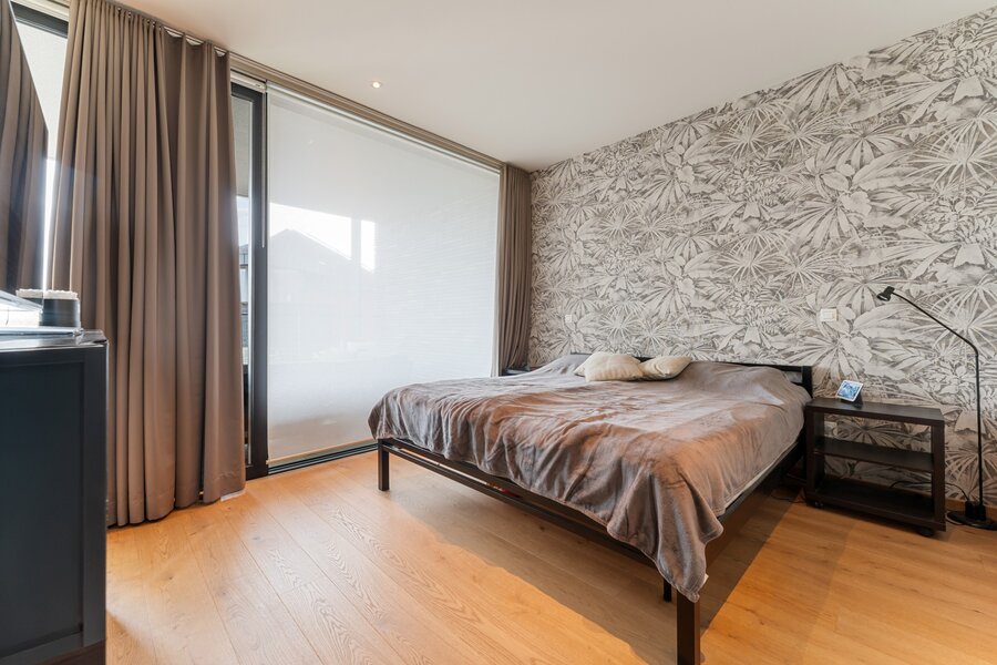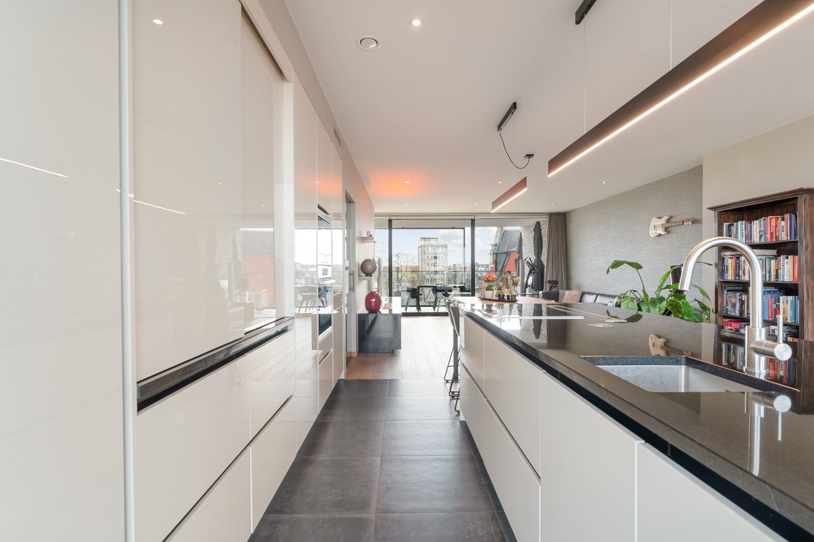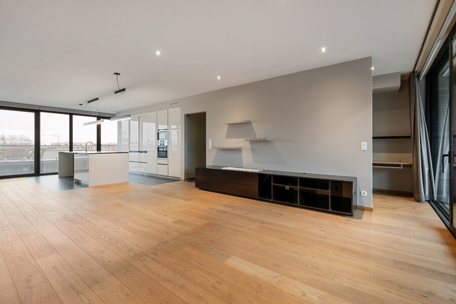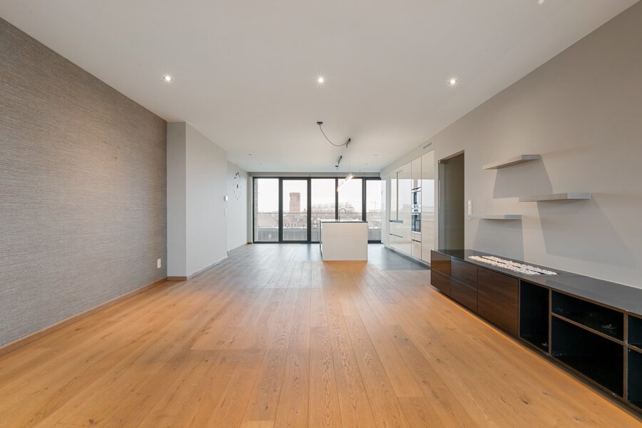Het appartement is toegankelijk via trap en lift, per verdieping bevinden zich slechts 2 appartementen die gebruik maken van de lift. Via de veiligheidsdeur betreden we de inkomhal van het appartement. Van hieruit gaan we verder naar de leefruimte van 78m² met open keuken. In de leefruimte is er een op maat gemaakte bureau gecreëerd. Wat meteen opvalt is de zee van licht die gecreëerd wordt dankzij de kamerbrede en plafondhoge ramen. De kwalitatieve materialen wo. de parketvloer geven het geheel een luxueuze uitstraling. Er is een waterdamphaard aangesloten aan de waterleiding en deze zit verwerkt in het tv/audio meubel.