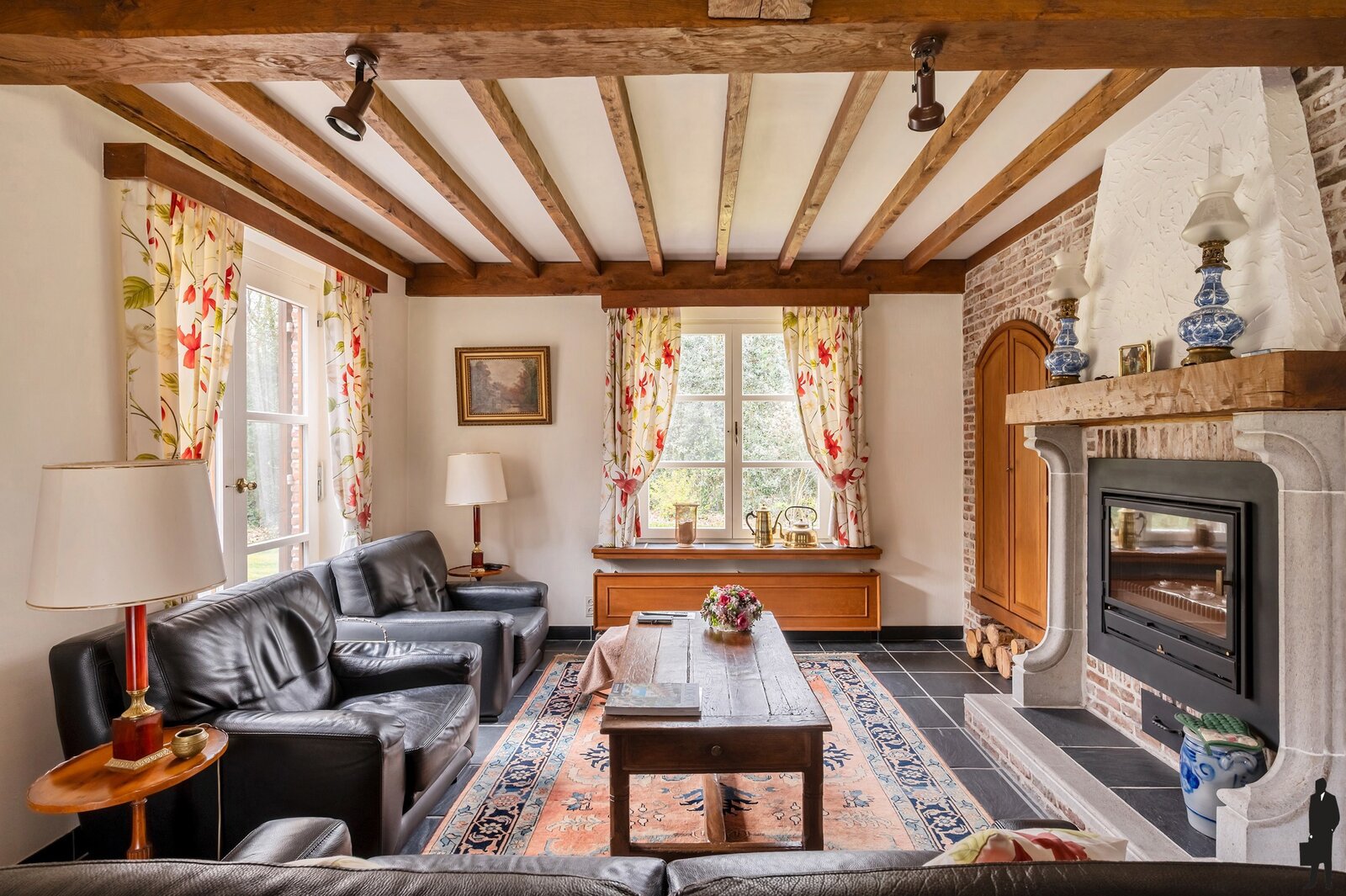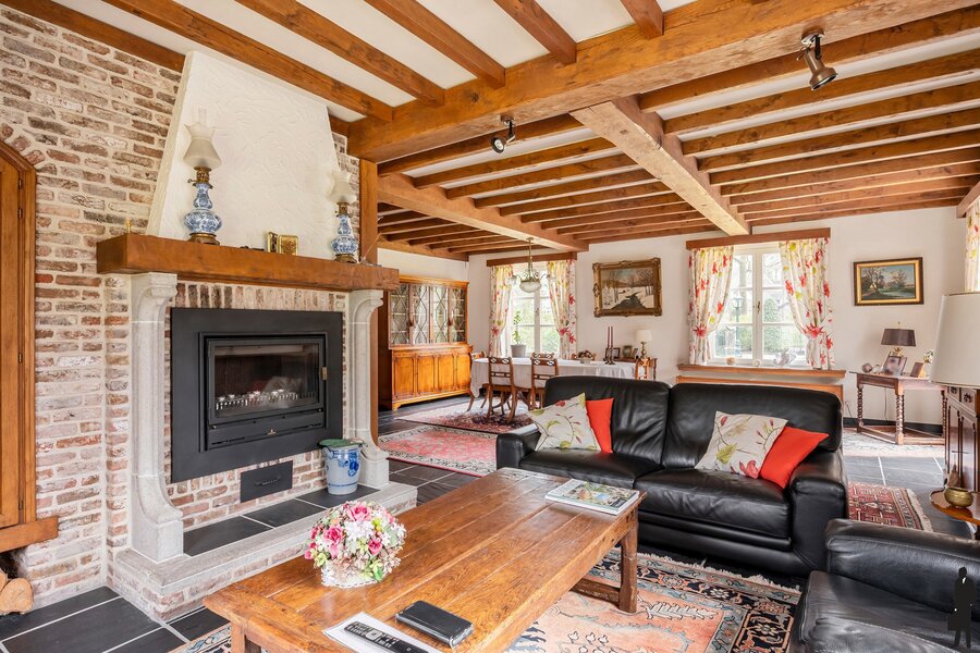 - Sfeervolle en lichtrijke leefruimte met zichtbare houten balken en houtkachel