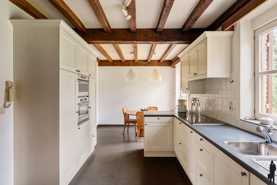 - Landelijke leefkeuken met veel lichtinval, uitgerust met inductiekookplaat, combi-oven, stoomoven en ingebouwde koelkast