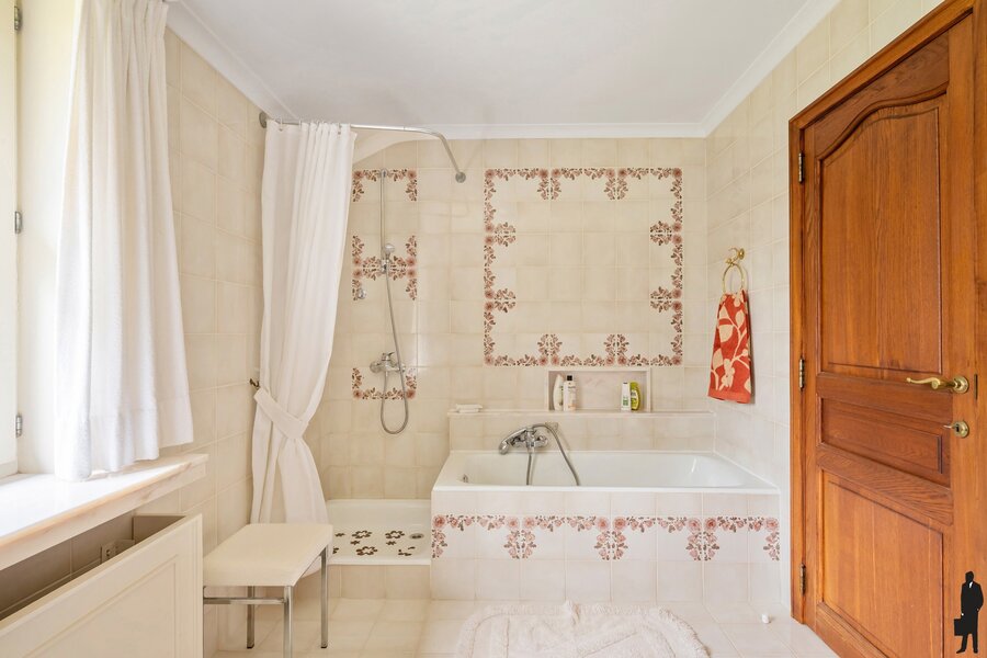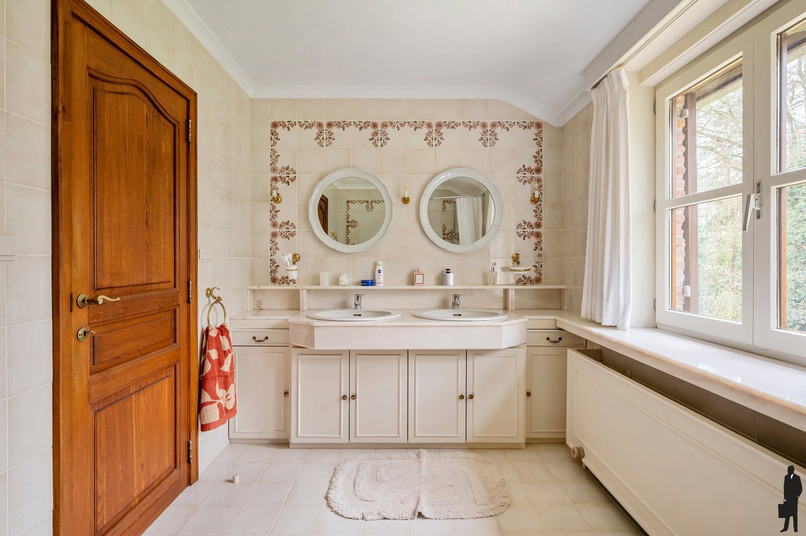 - Badkamer met 2 wastafels met marmerblad en ingemaakte kasten, aanwezigheid van douche en bad.