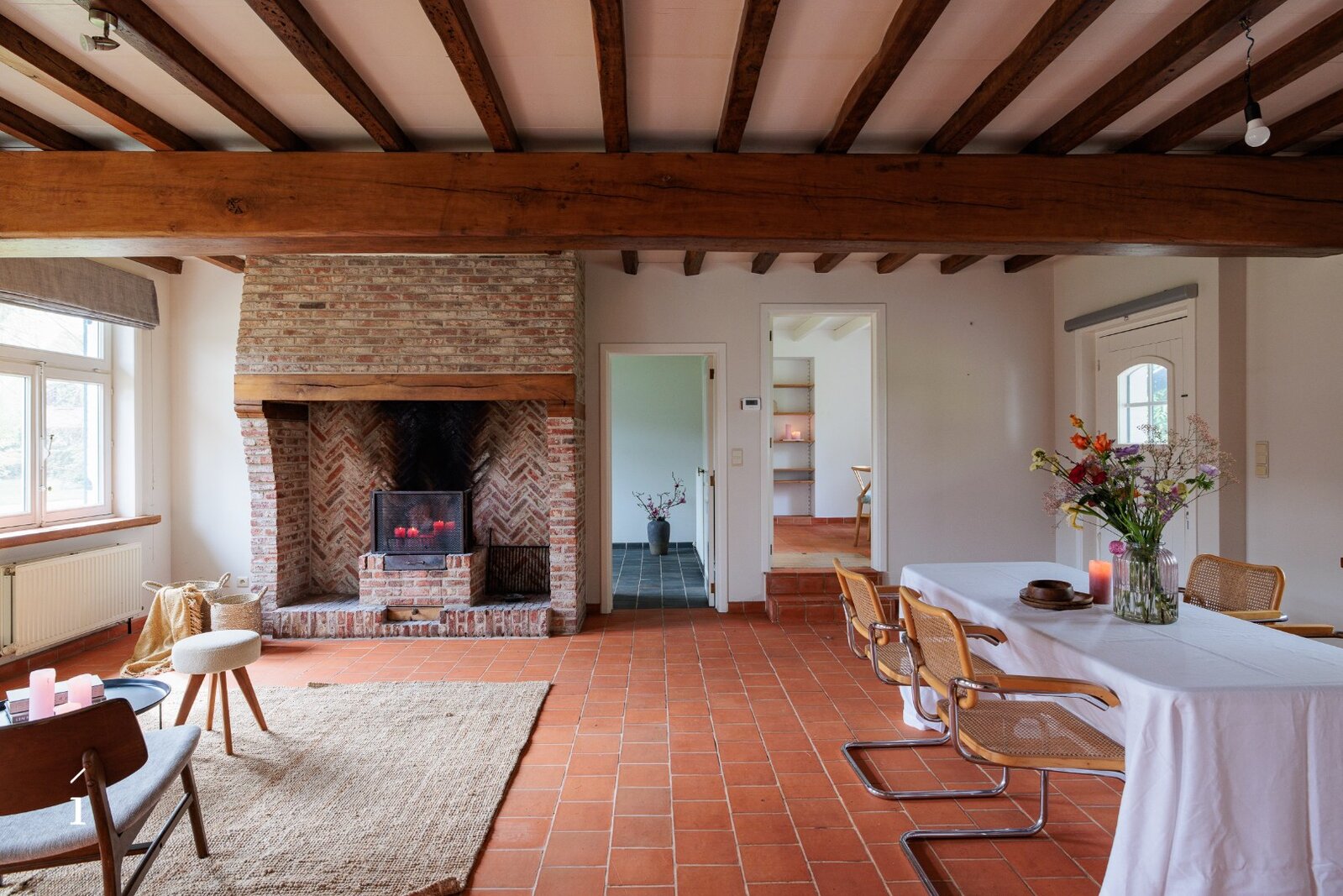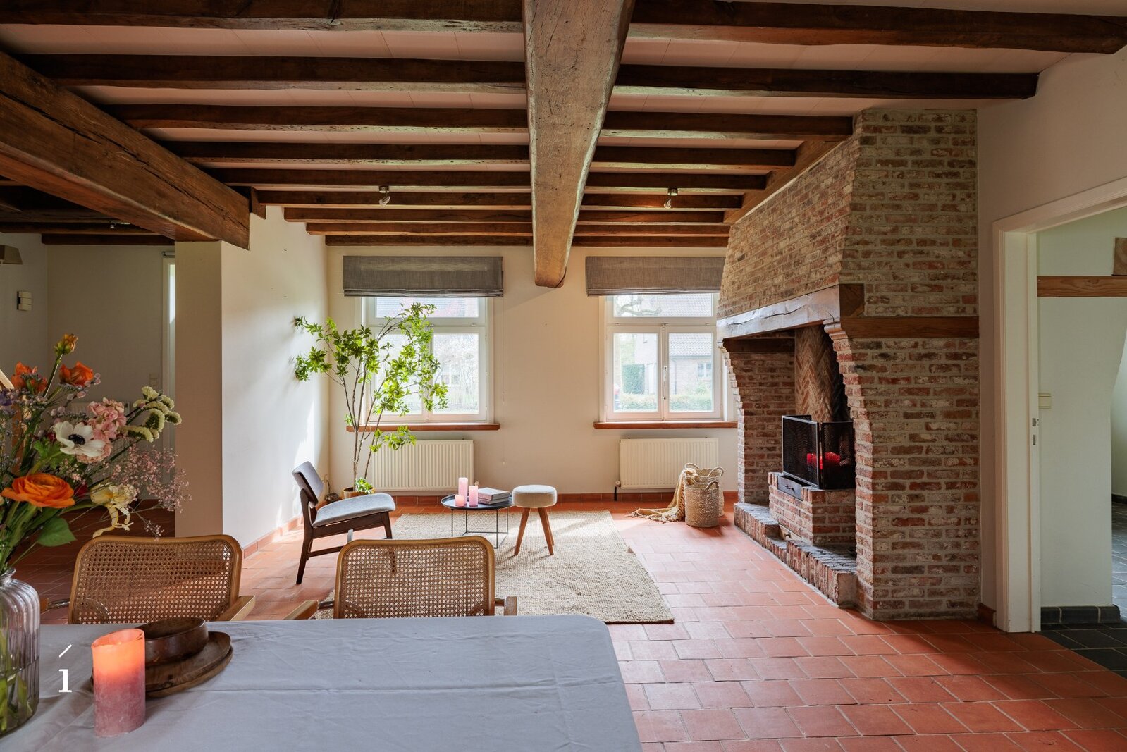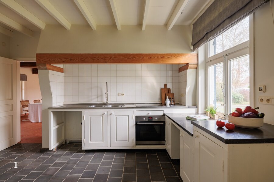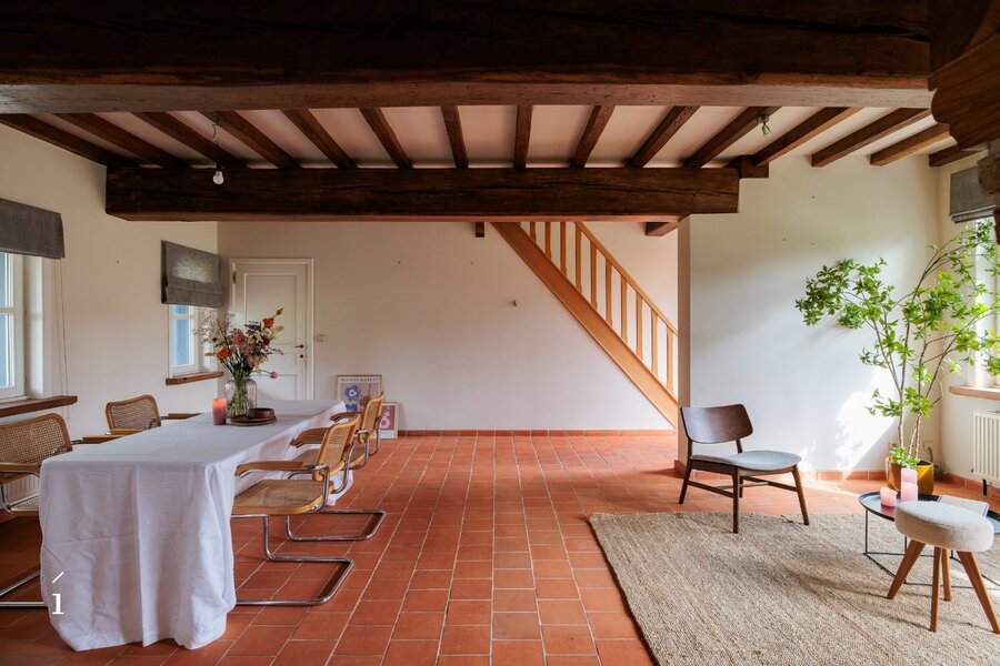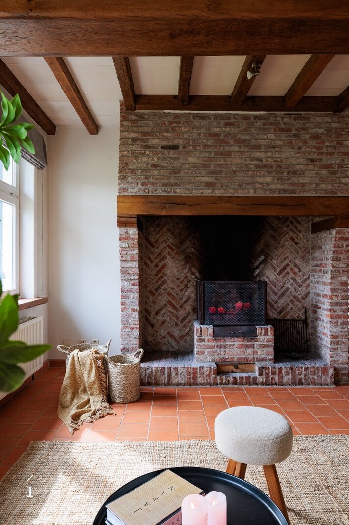 De woning beschikt over een bewoonbare oppervlakte van ca. 226 m² en heeft een doordachte indeling. Op het gelijkvloers bevindt zich een inkomhal, een sfeervolle leefruimte met open haard en een eetplaats die uitgeeft op de tuin. De aparte leefkeuken biedt ruimte voor een ontbijthoek en sluit aan op een praktische wasplaats/berging. Daarnaast is er een bureau met toegang tot de wijnkelder, een dubbele garage en een buitenberging.