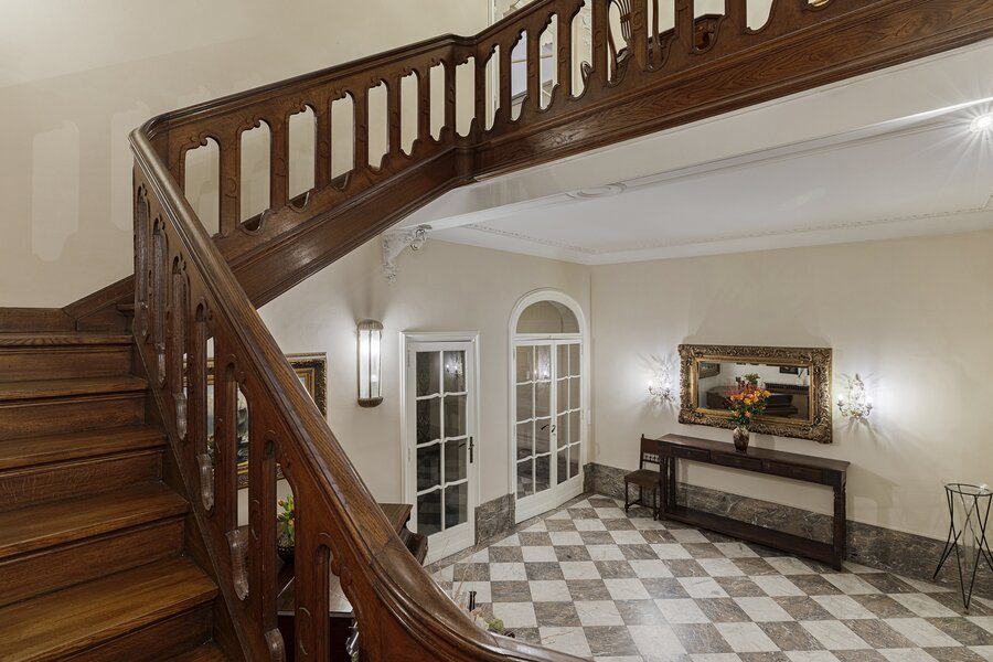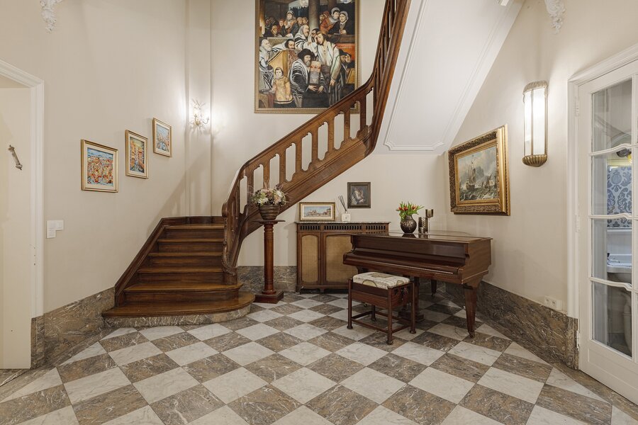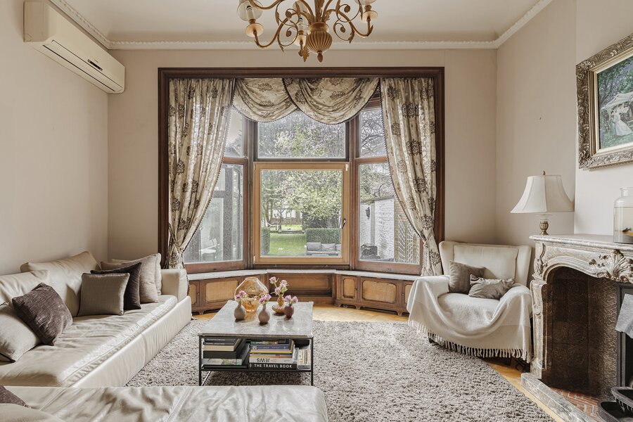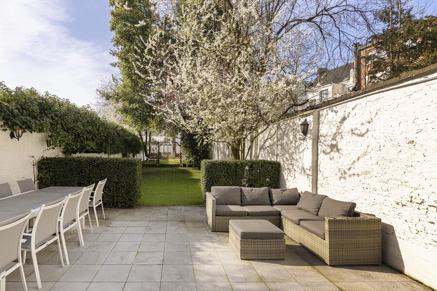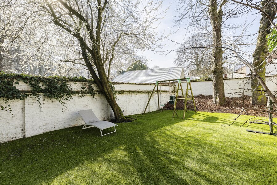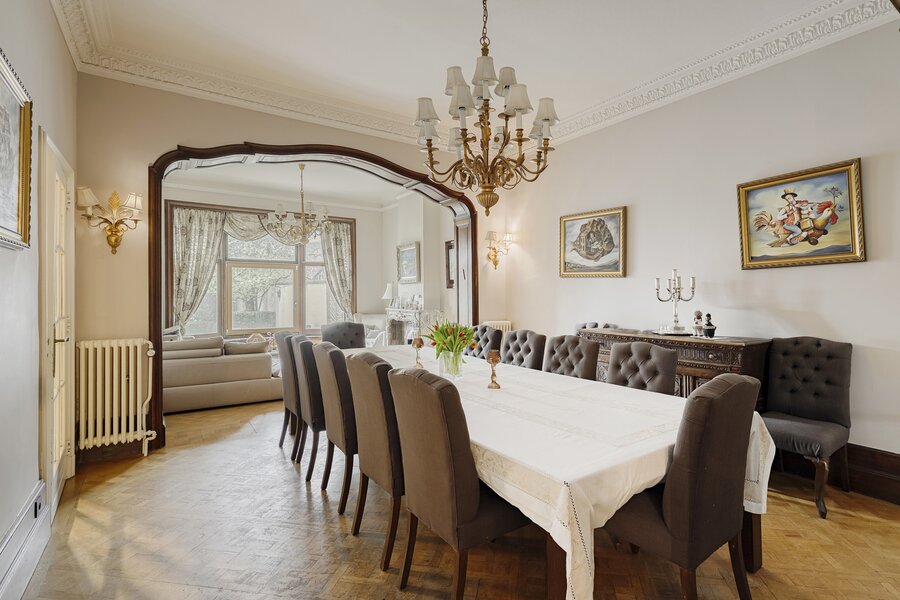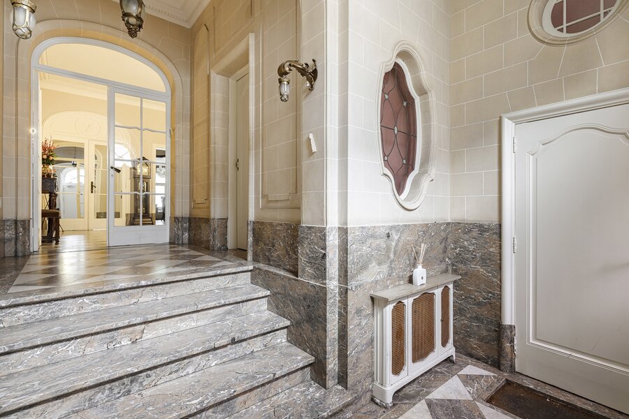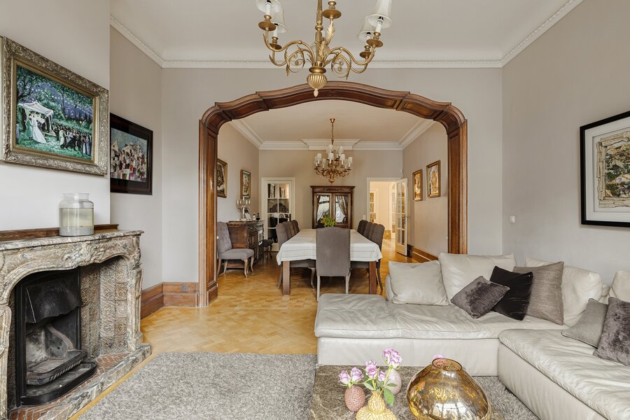 Cette charmante maison de maître vous accueille via un hall d’entrée élégant, doté d’un magnifique escalier en bois, de hauts plafonds, de moulures raffinées et d’une verrière qui apporte une sensation exceptionnelle d’espace et de lumière. Au rez‑de‑chaussée se trouvent la cuisine avec un coin salon convivial et un accès direct à la terrasse ainsi qu’au jardin ensoleillé. On y trouve également un salon chaleureux, idéal comme espace de vie ou de réception.