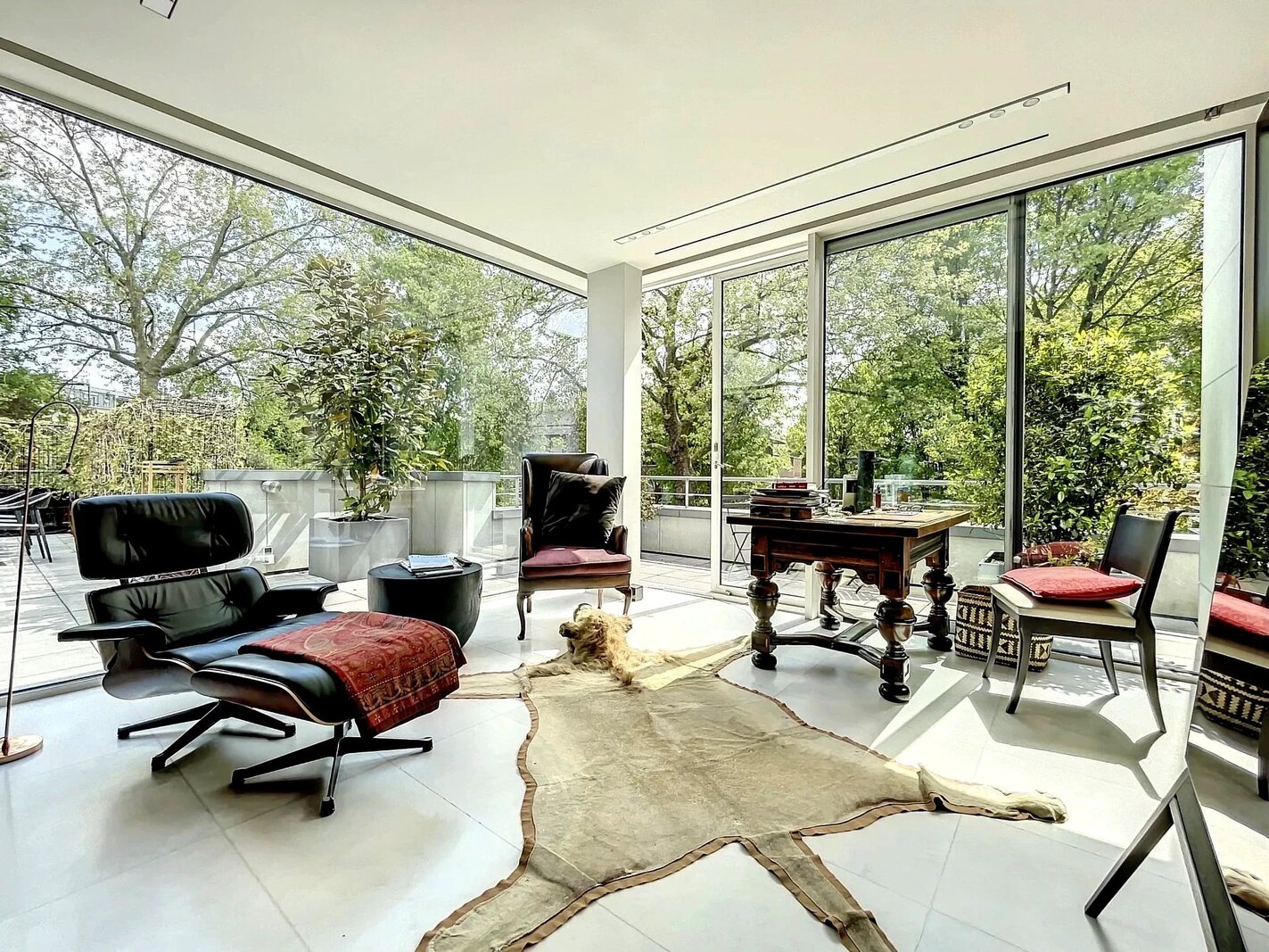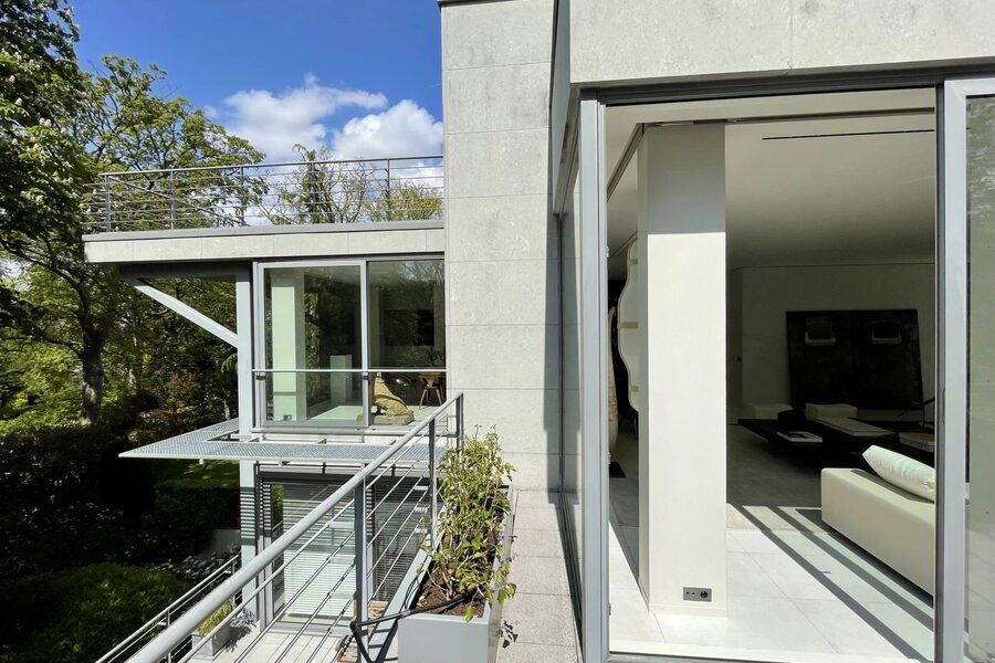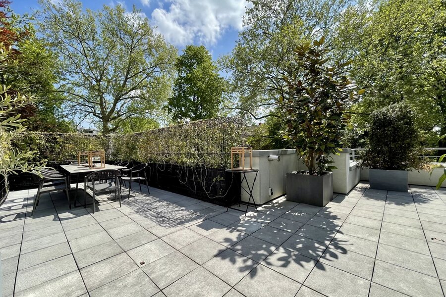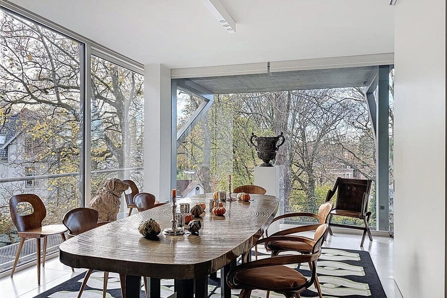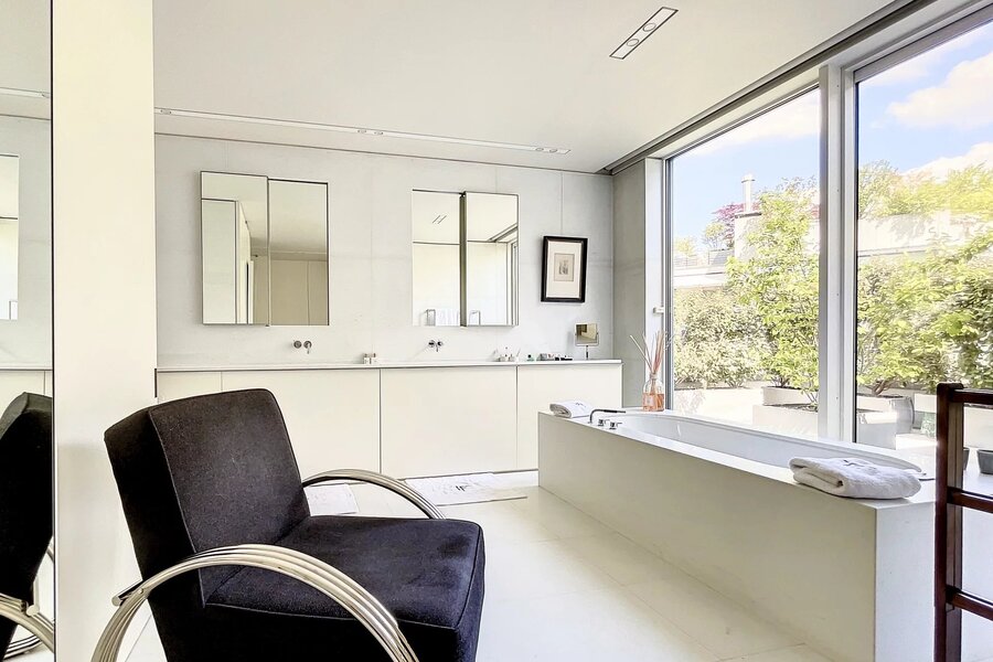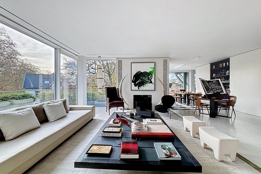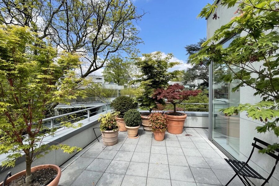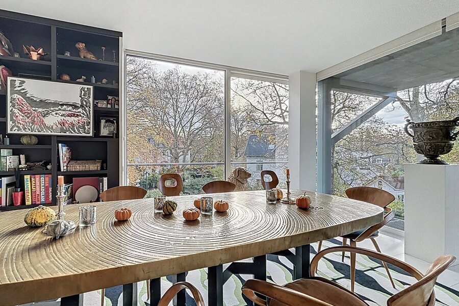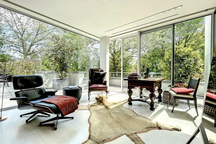 Extraordinaire et très exclusif Penthouse avec grandes baies vitrées et vue sur les arbres.