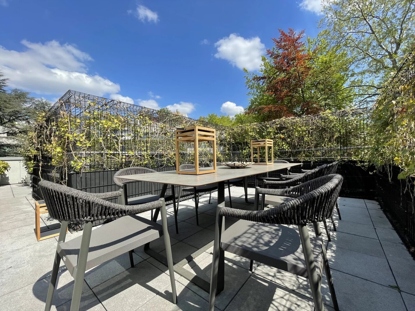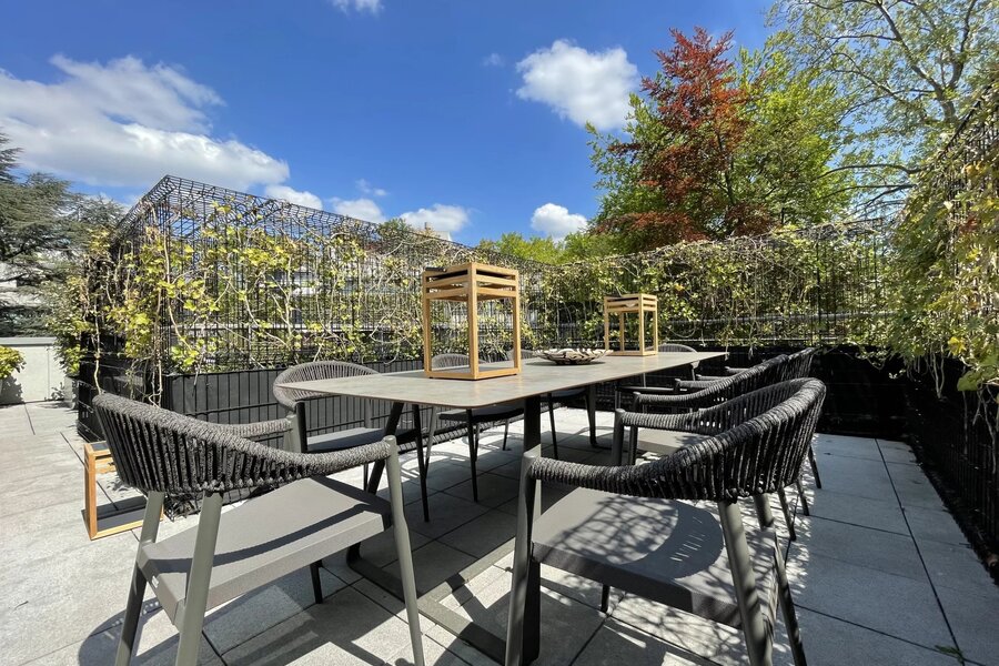 Situé au dernier étage sur 3, il se compose comme suit : Salle à manger pour jusqu'à 14 convives et grand séjour de 64m2 avec accès à la terrasse de 150m2 orientée plein sud et contournant complètement l'appartement, cuisine équipée séparée, Bureau, chambres avec dressing et sa grande salle de bains en marbre, une seconde chambre avec salle de douche et un bureau ou chambre supplémentaire. Une cave fait partie de la vente. Trois garages box ( un double et un simple) sont en supplément.