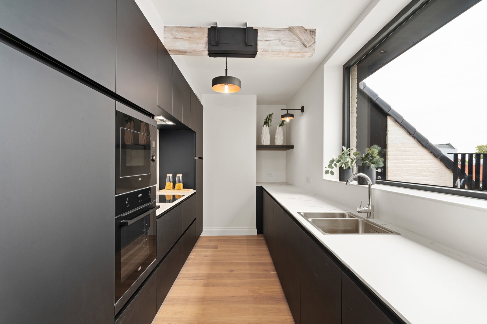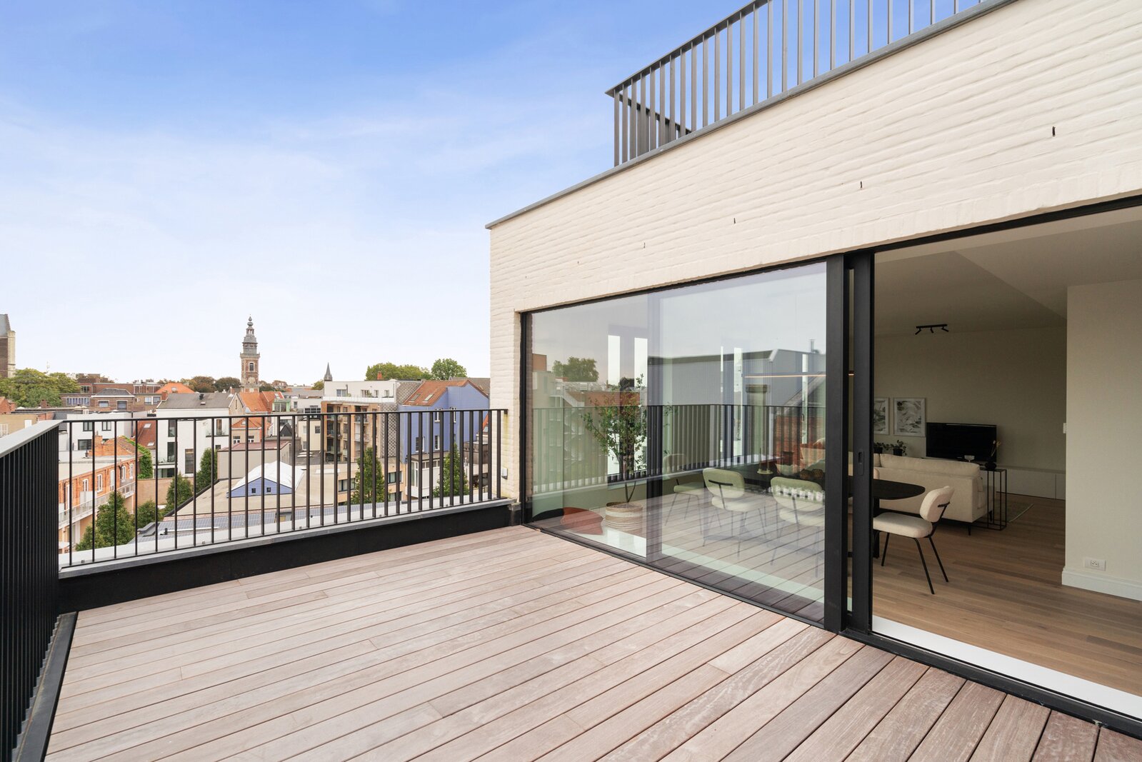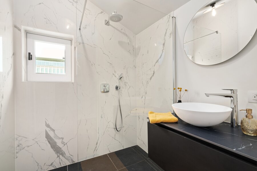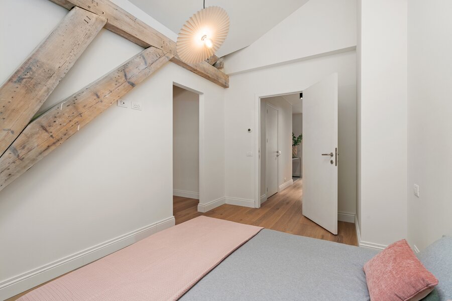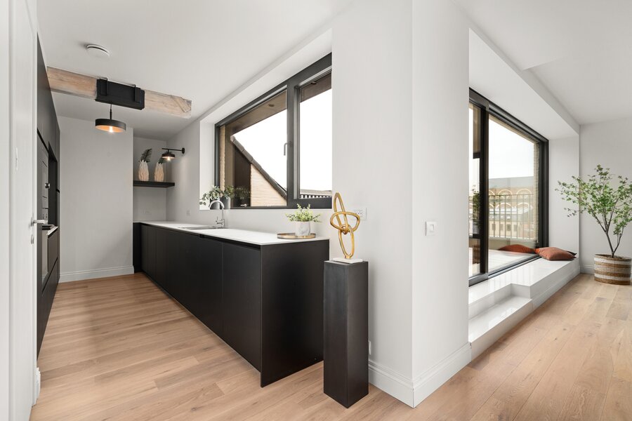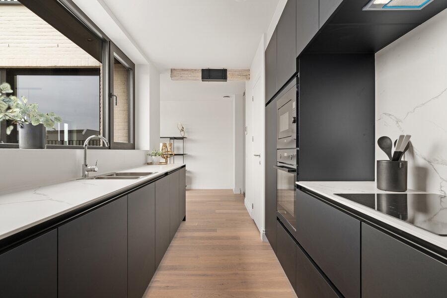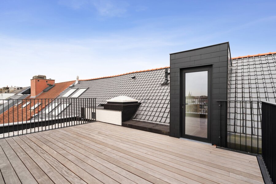 Deze unieke dakloft op de vierde verdieping omvat inkomhal met apart toilet, twee ruime slaapkamers met dressing en en suite badkamer. Aan de achterzijde vinden we de lichtrijke leefruimte met bureauhoek, berging, halfopen keuken met zicht op het schitterend terras met buitenberging. Via de vaste trap komen tot een extra zolderruimte en tweede terras met schitterende verzichten. Laat u verrassen door deze fenomenale dakloft en contacteer ons voor een afspraak. Het appartement is volledig afgewerkt en instapklaar. Onder bepaalde voorwaarden is 6 % btw mogelijk.