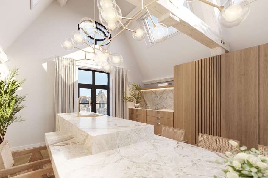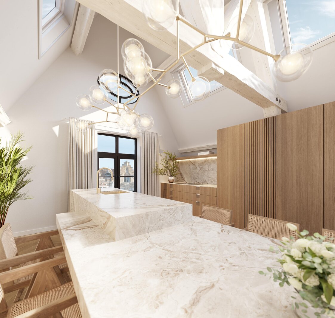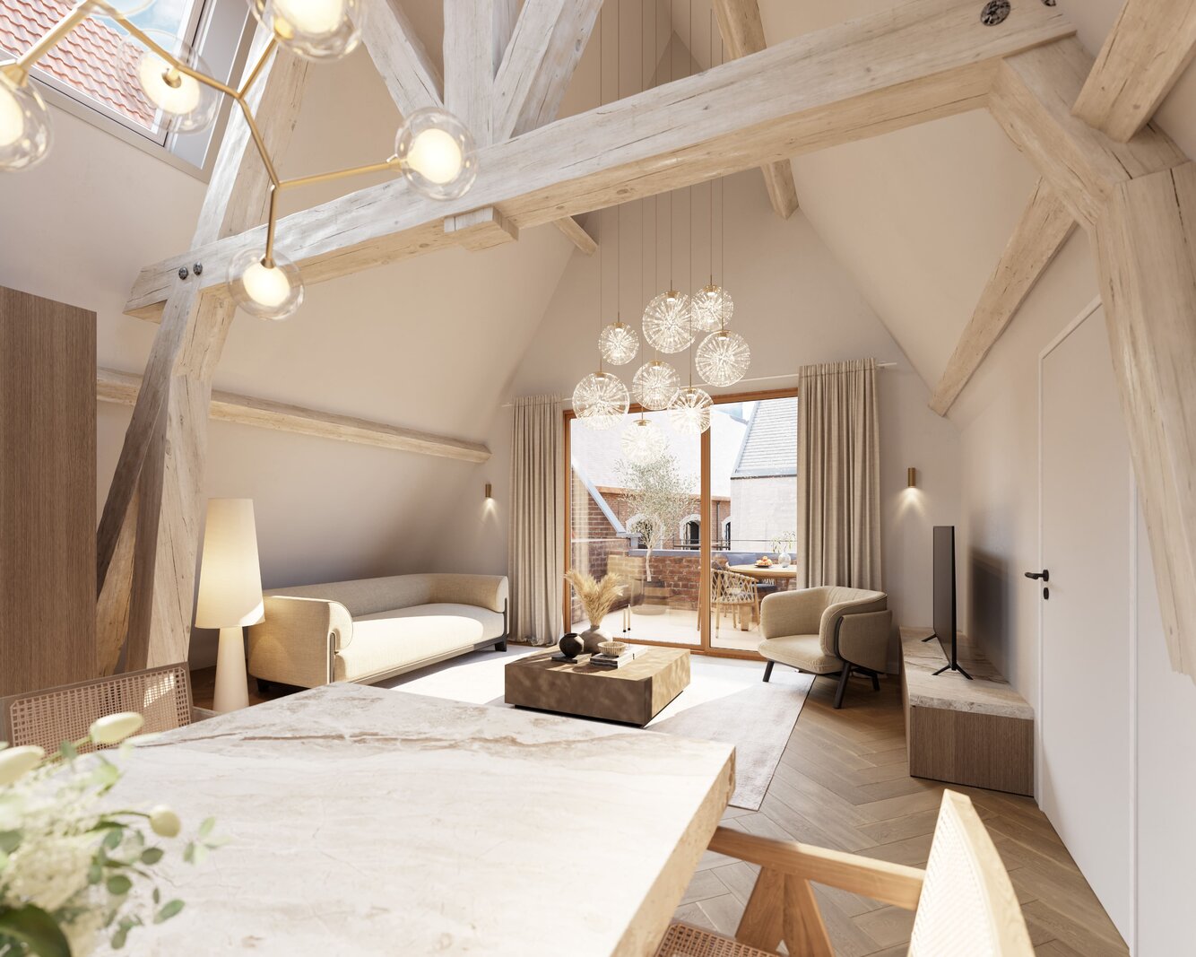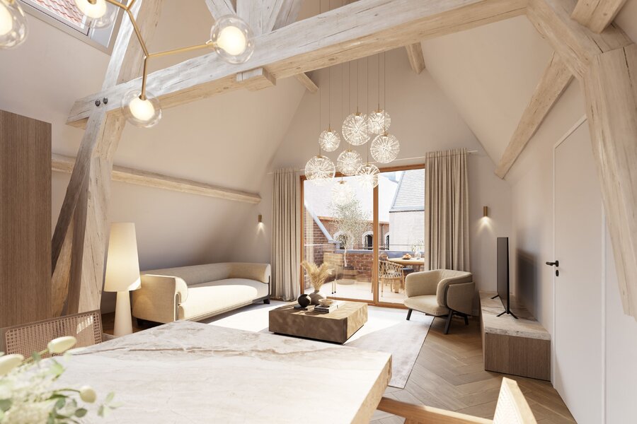 Deze penthouse is voorzien van een ruime leefruimte met dakramen en dakgebinten.