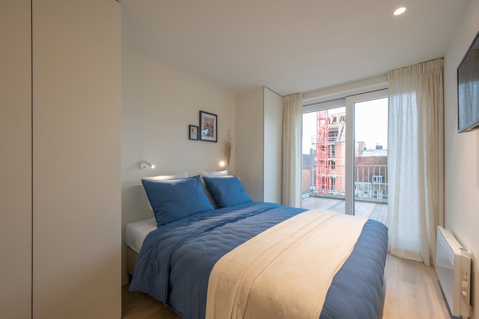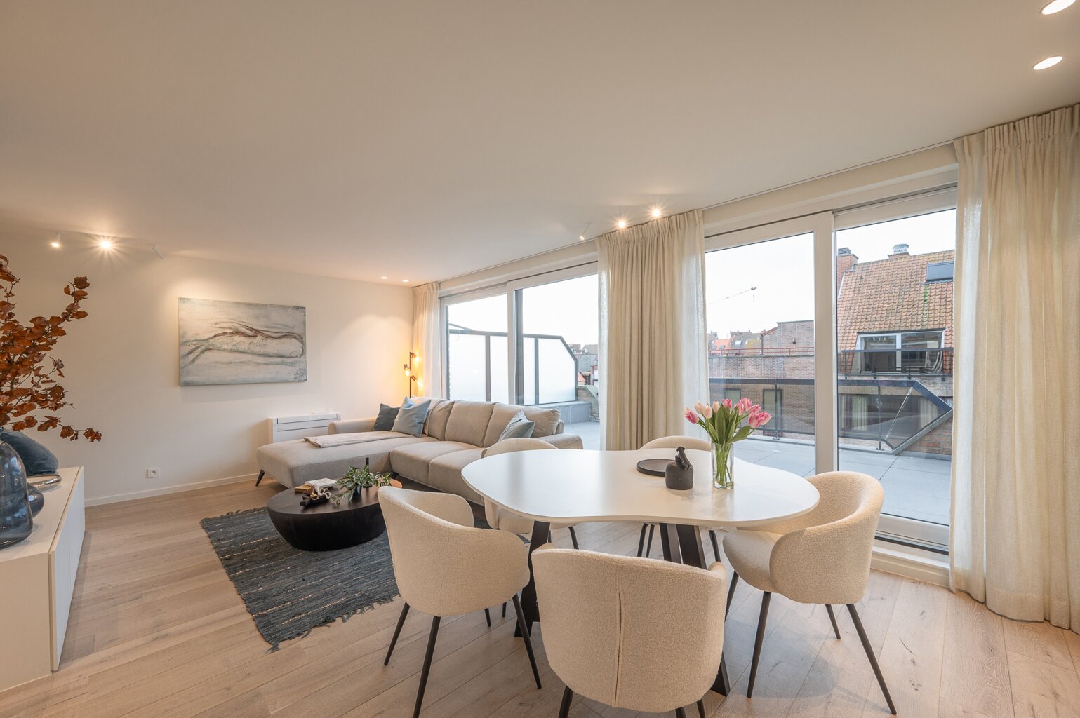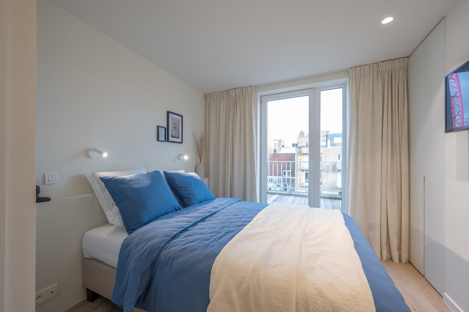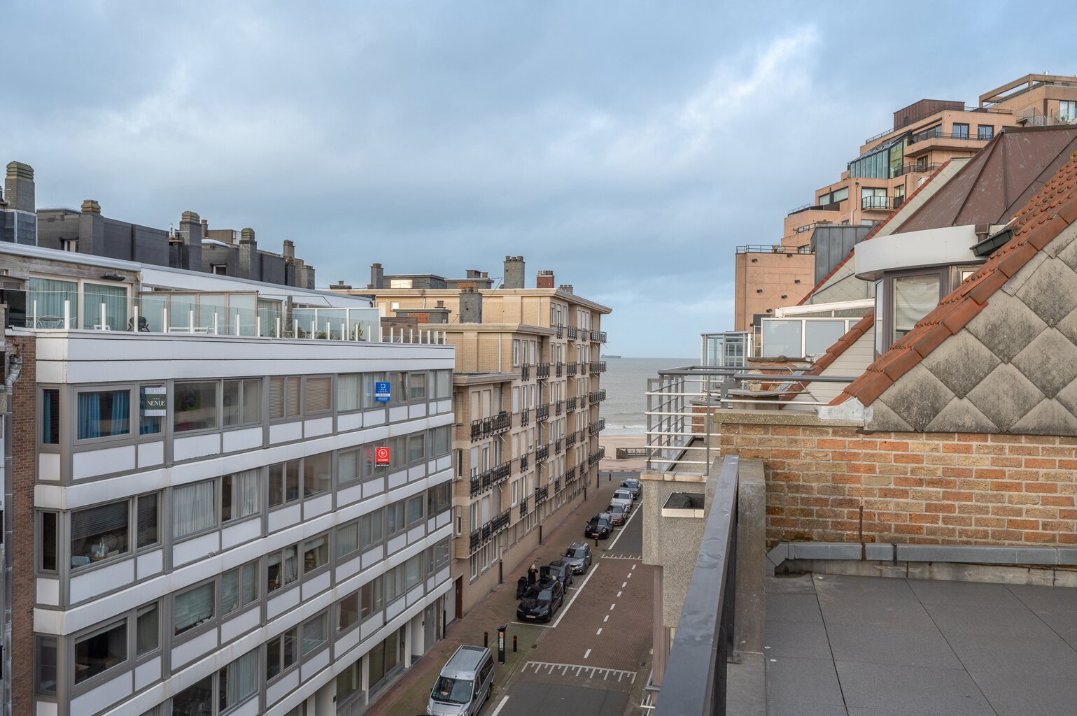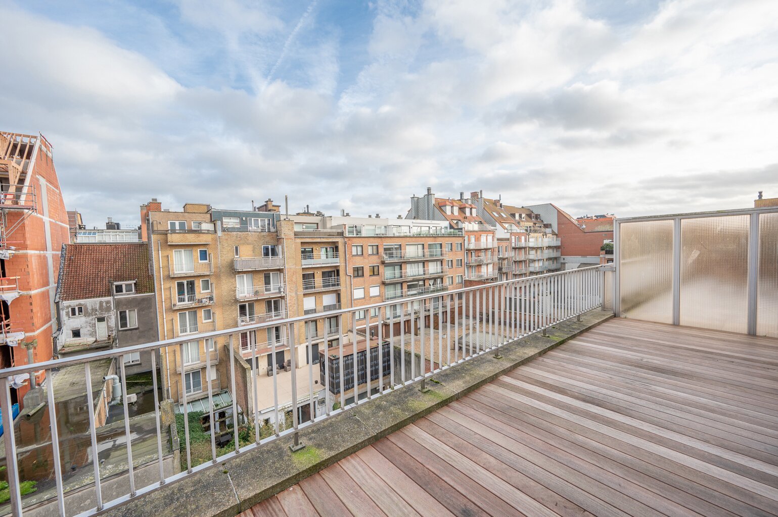 Penthouse lumineux, très bien situé de la digue, près de l'Avenue Lippens et à courte distance de la Place Rubens. Composition: hall d'entrée avec wc. Séjour - salle à manger ensoleillé donnant sur agréable terrasse avec vue latérale sur la mer. Cuisine américaine. Chambre à coucher avec salle de douche Deuxième chambre à coucher avec salle de douche. Les deux chambres à cocuher donnent sur la terrasse arrière. Possiblilté de louer un emplacement de voiture dans la résidence (150€ p/m). 100€ provision sur les frais. Visites volontiers après rendez-vous en nos bureaux.