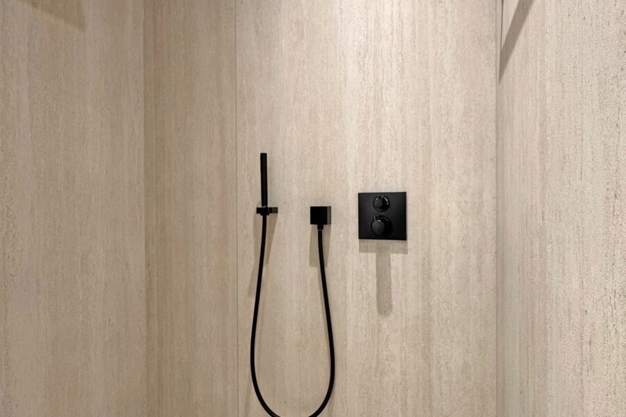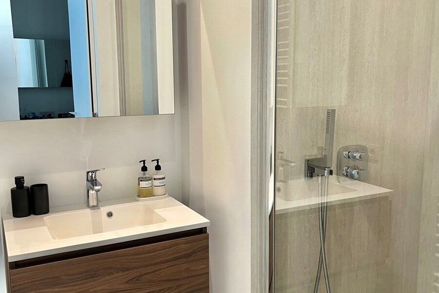 L'agencement de l'appartement est parfaitement adapté aux exigences de vie modernes. La chambre principale dispose d'une salle de bain attenante équipée d'un lavabo simple, d'une grande douche à l'italienne et d'un WC. La deuxième chambre dispose également d'une salle de douche attenante et offre un accès à la terrasse orientée à l'ouest, idéale pour les invités.