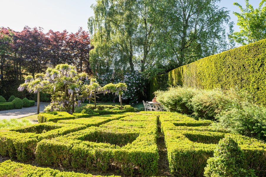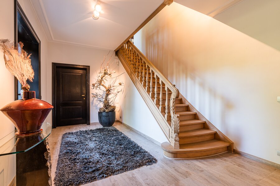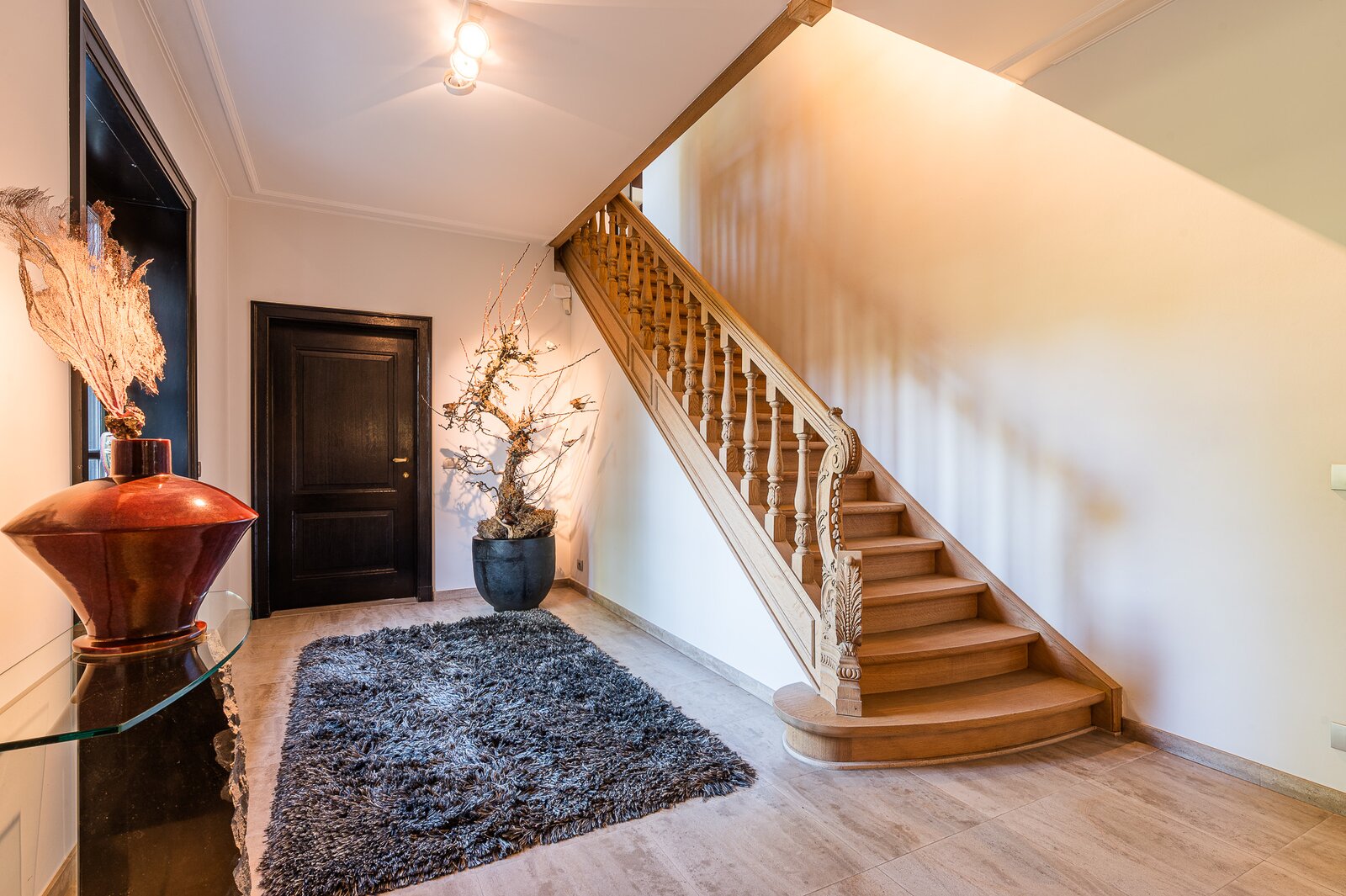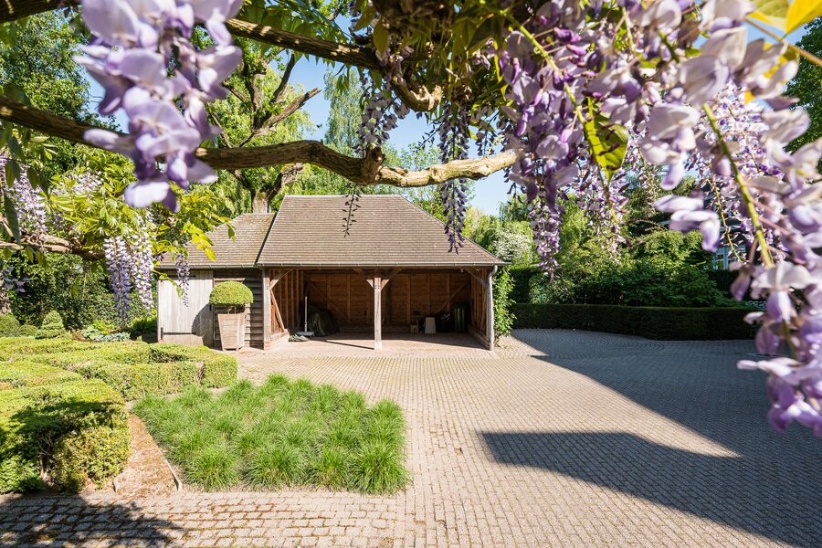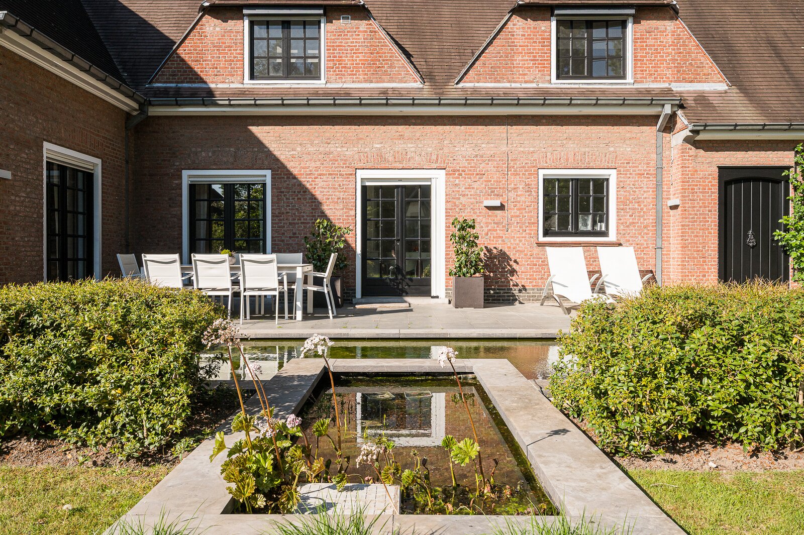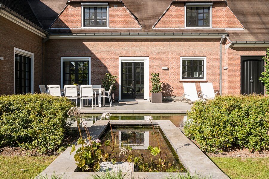 Op een mooi discreet perceel met een prachtig aangelegde voor- & achtertuin met rondom rijpere bomen en kleurrijke bloemenpracht. En een rustgevende terrasvijver. Zowel vooraan als achteraan terrasaangelegenheden. Komt u opgereden op de oprijlaan waarna u de wagen(s) kan stallen onder de dubbele carport of in de dubbele garage. Waarbij, van zodra de inkomhall van de villa is betreden, zowel de luxe afwerking, het karakter als de lichtinval direct een diepe indruk maken.