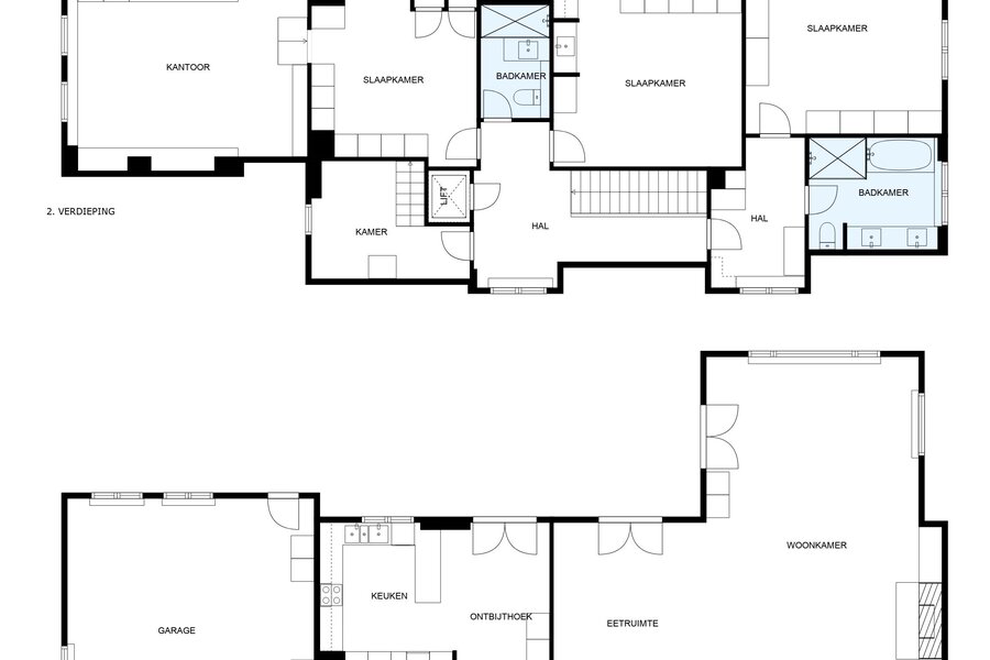 FOTOMEMORANDUM TER BESCHIKKING. De plannetjes geven inzicht in de huidige indelingen. Extra verhoogde plafonds ... . Volledig in te richten 2de verdiep met mogelijkheid van extra slaapkamer, atelier, ... .