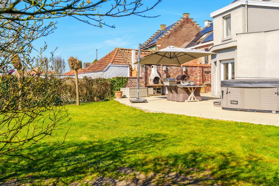 - Jardin paysager (447 m²) avec terrasse ensoleillée, jacuzzi et cuisine extérieure luxueuse équipée d'un barbecue Grandhall et d'une plaque de cuisson au gaz naturel