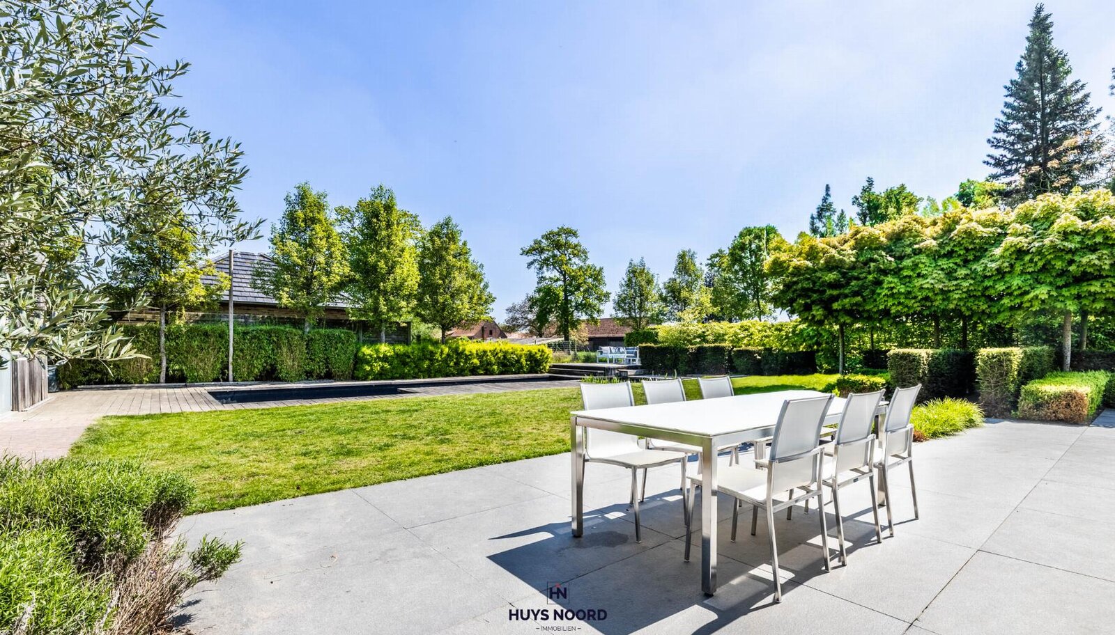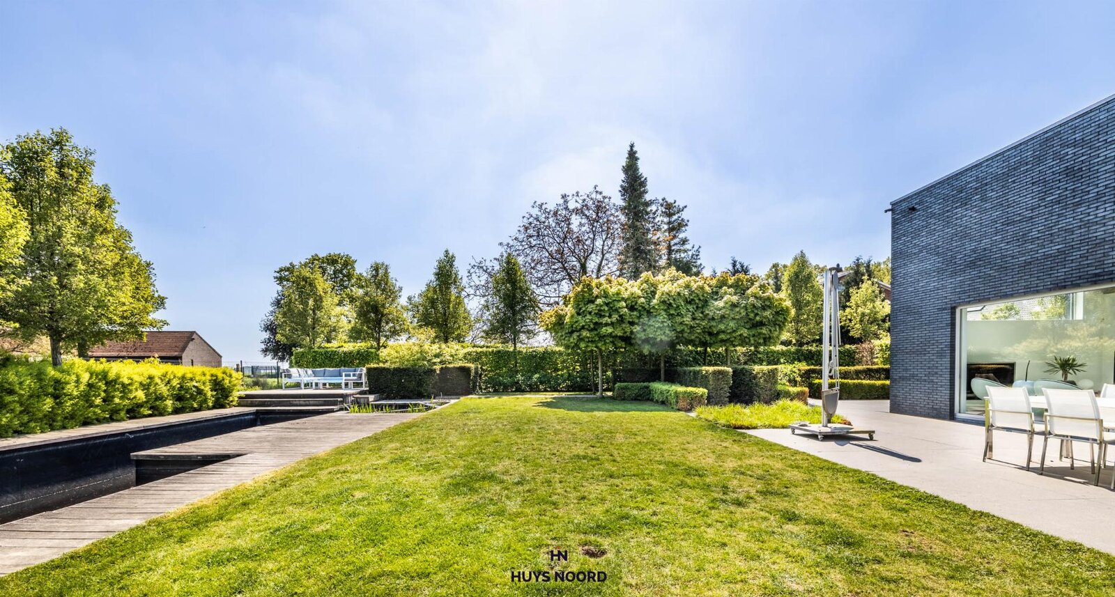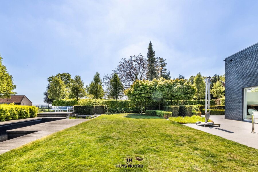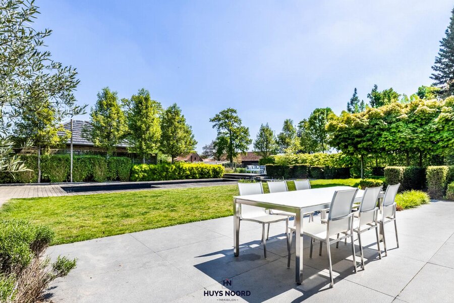 De smaakvol aangelegde tuin beschikt over liefst twee zonneterrassen, een natuurlijk gefilterde zwemvijver (2013) en een poolhouse met keuken en inloopdouche.