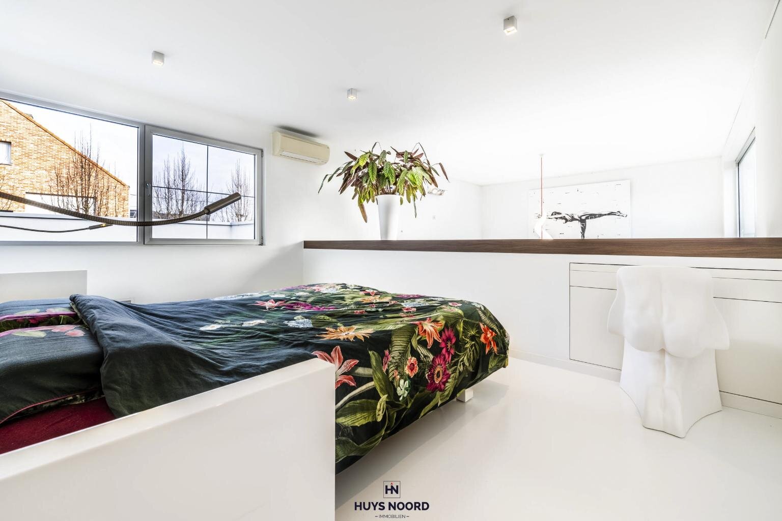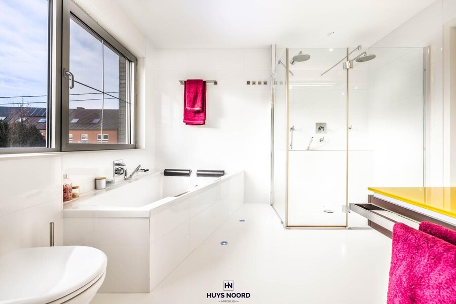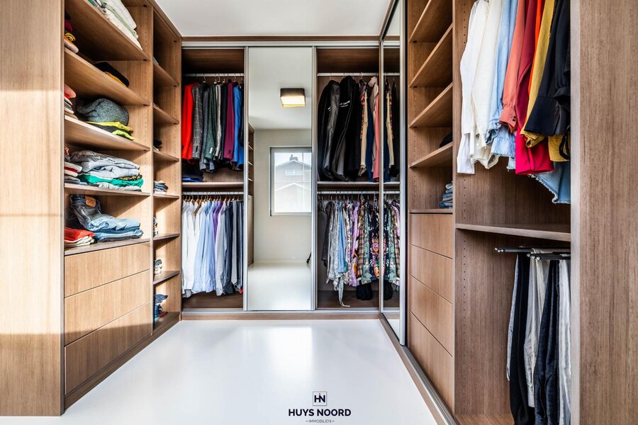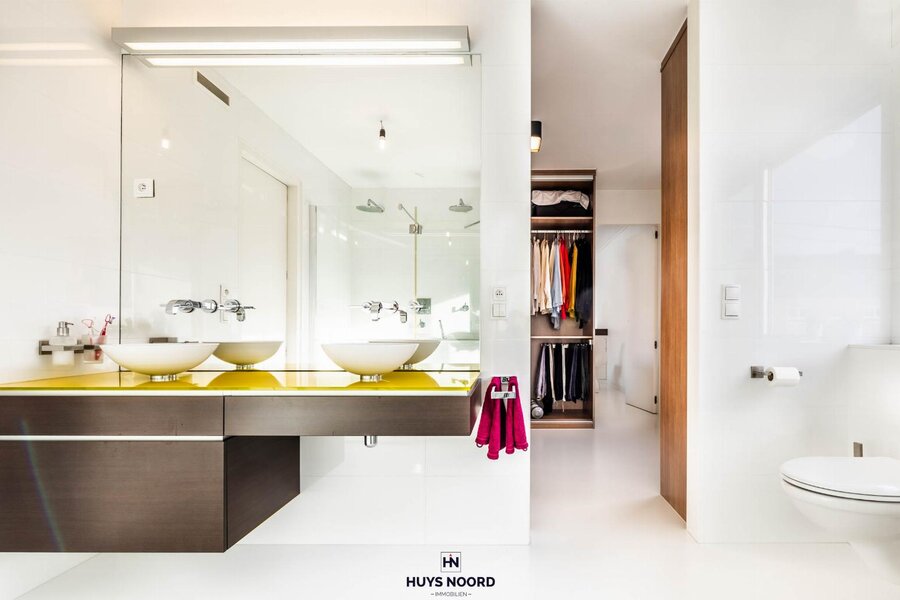 Het eerste verdiep is voorzien van een master-slaapkamer, met aansluitend de maatwerk dressing en de ingerichte badkamer (ligbad, dubbel wastafelmeubel en dubbele douche).