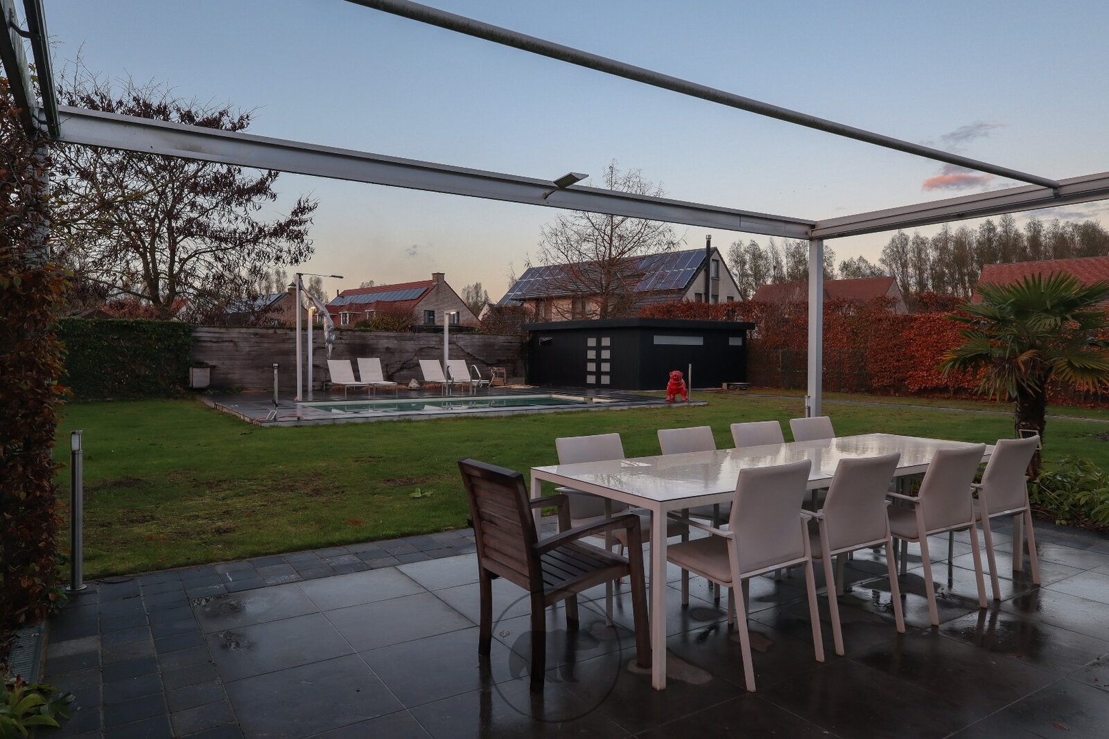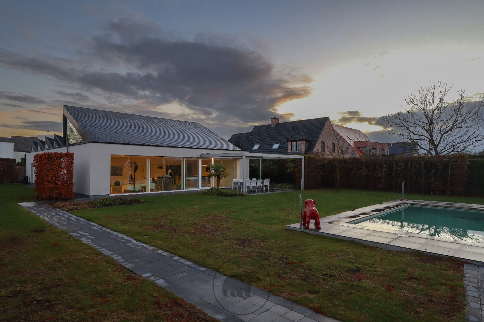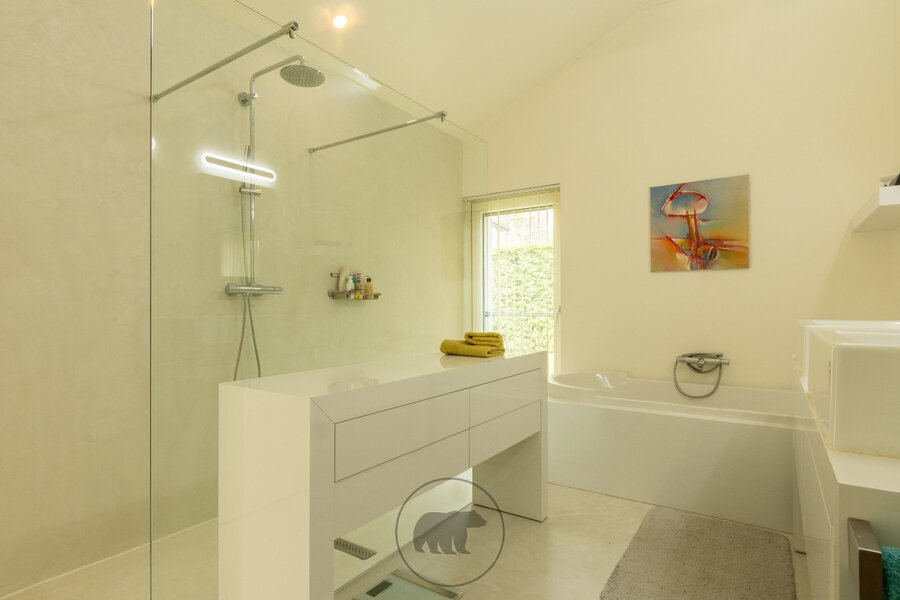 De villa op afgesloten terrein oogt voorin erg discreet en strak. Eens voorbij het automatische toegangspoortje ontdek je de subtiele, minimalistische en unieke designkenmerken van deze villa. De buitenruimte omvat gezellige terrassen, een groot buitenzwembad met lounge-terras en een prachtige koivijver. Het ganse jaar door kan er buiten worden genoten dankzij het open terras aan het zwembad, het afsluitbare tuinterras of de deels afgesloten patio met zicht op de koivijver.