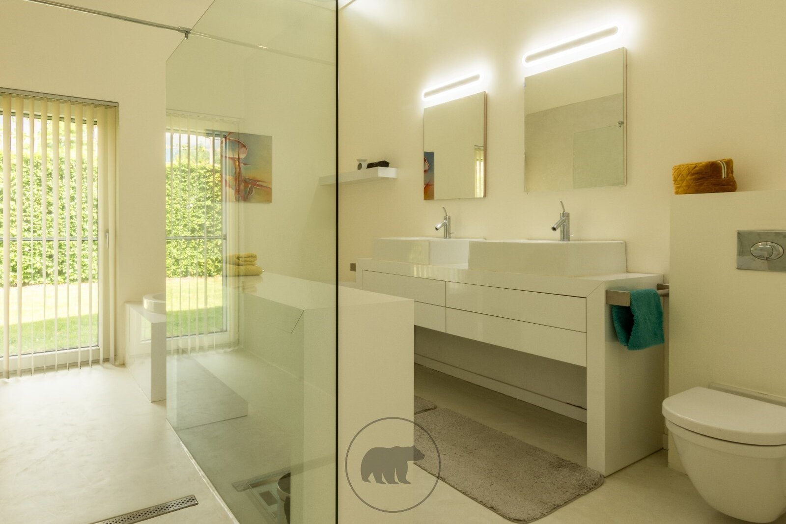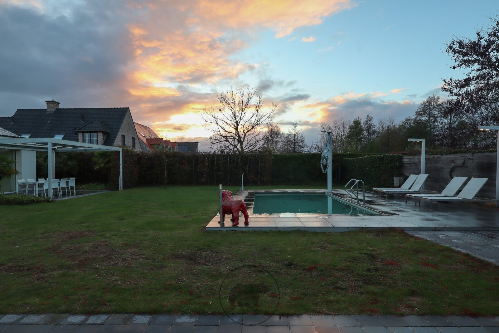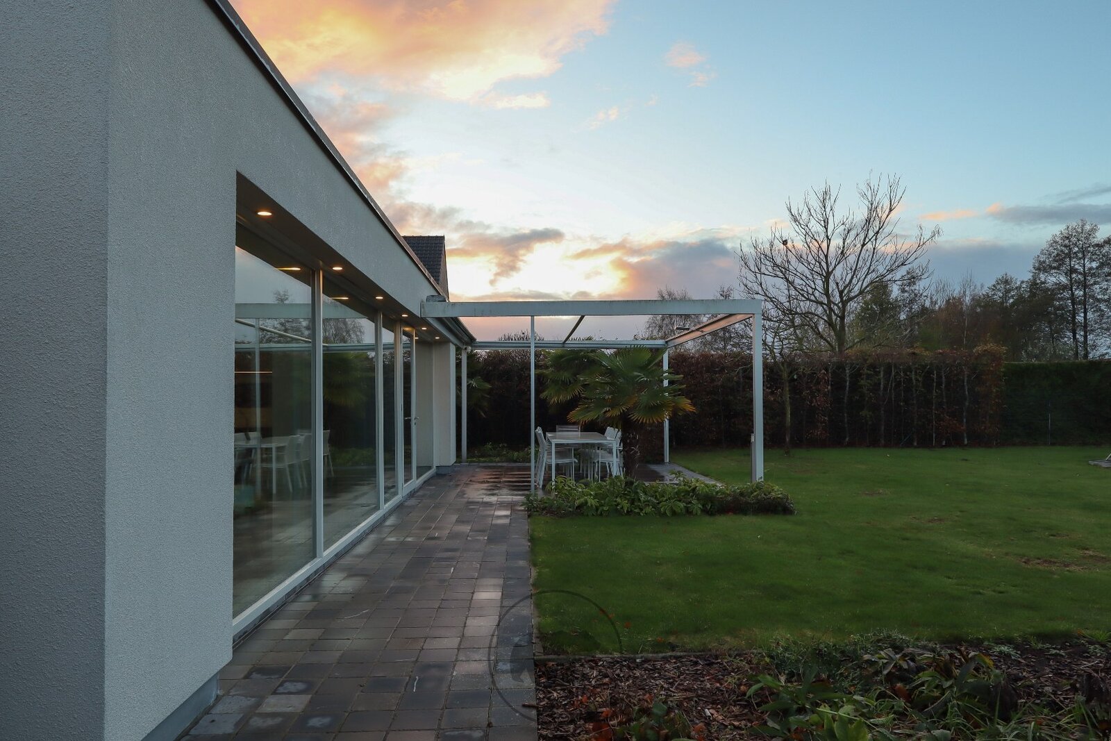 De villa op afgesloten terrein oogt voorin erg discreet en strak. Eens voorbij het automatische toegangspoortje ontdek je de subtiele, minimalistische en unieke designkenmerken van deze villa. De buitenruimte omvat gezellige terrassen, een groot buitenzwembad met lounge-terras en een prachtige koivijver. Het ganse jaar door kan er buiten worden genoten dankzij het open terras aan het zwembad, het afsluitbare tuinterras of de deels afgesloten patio met zicht op de koivijver.