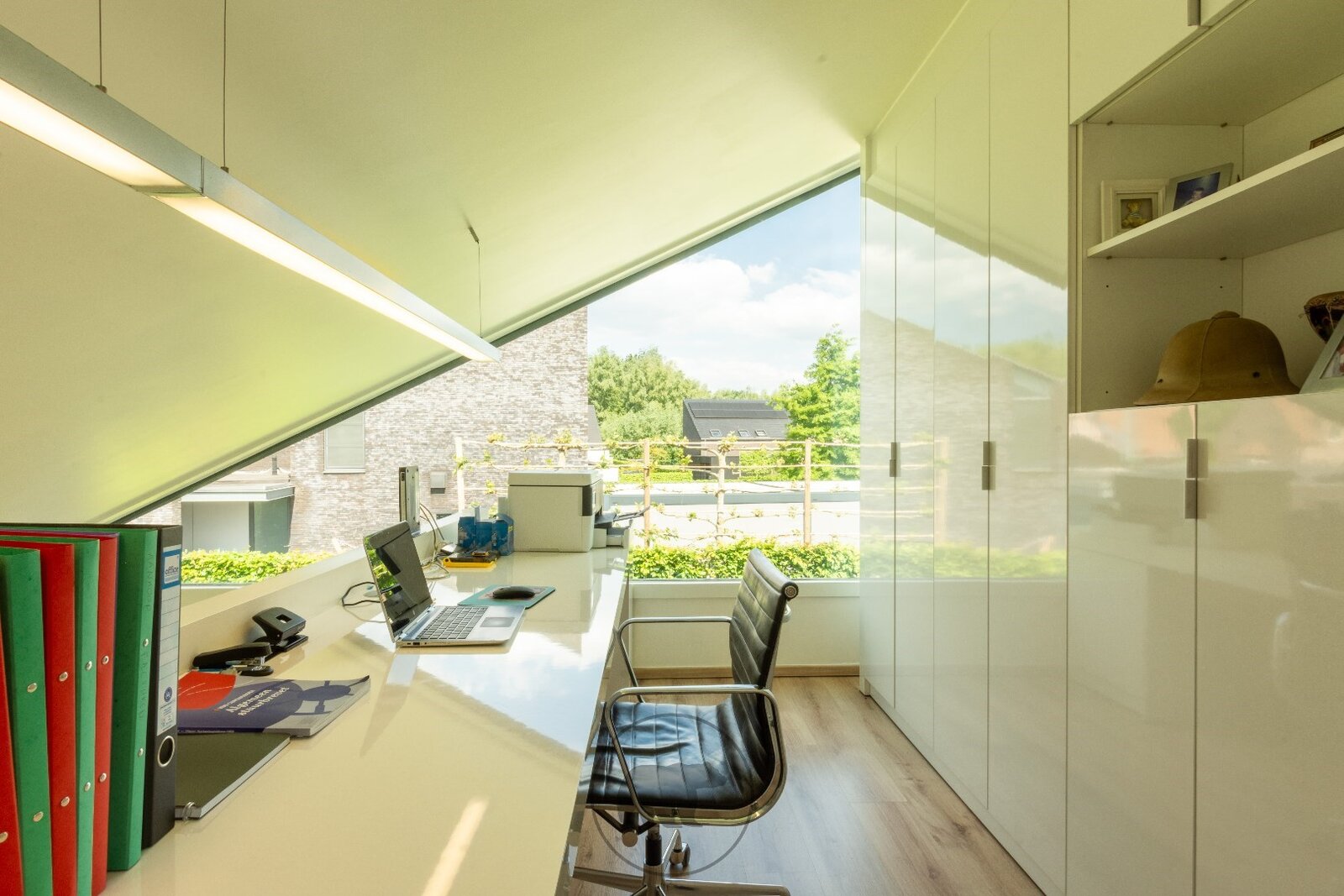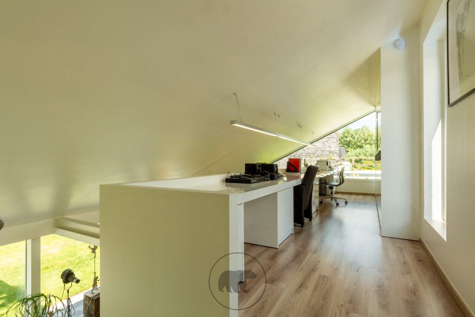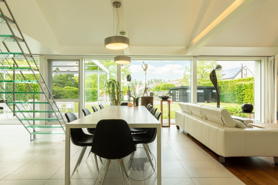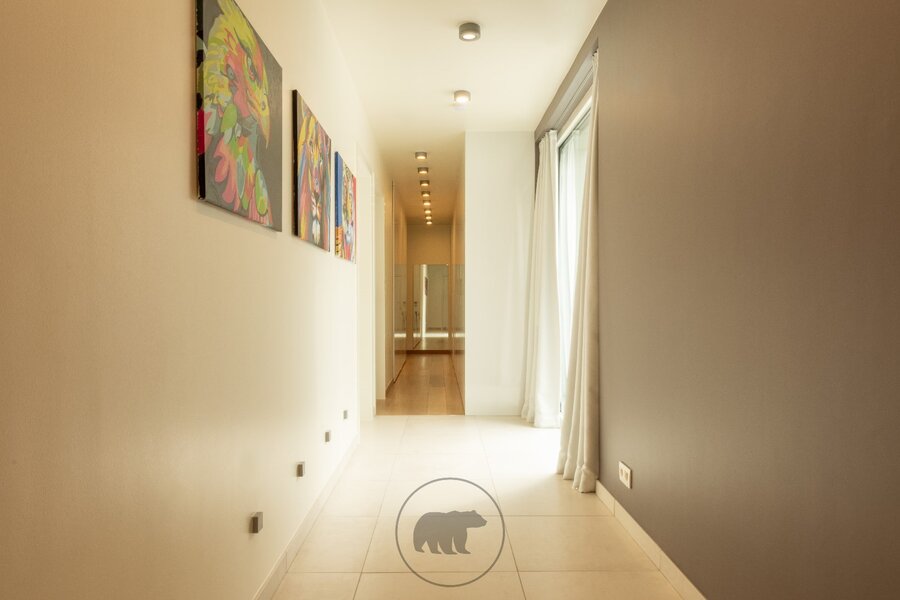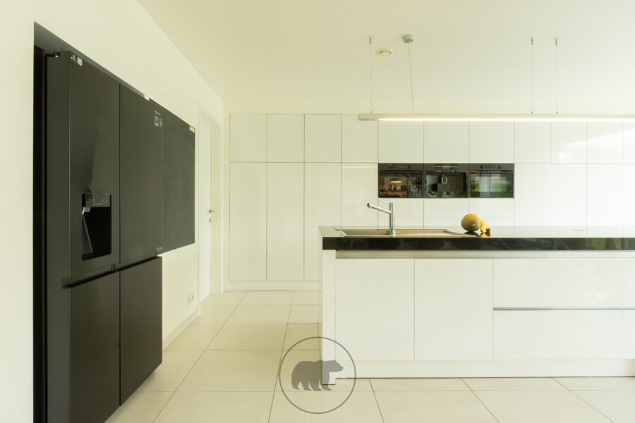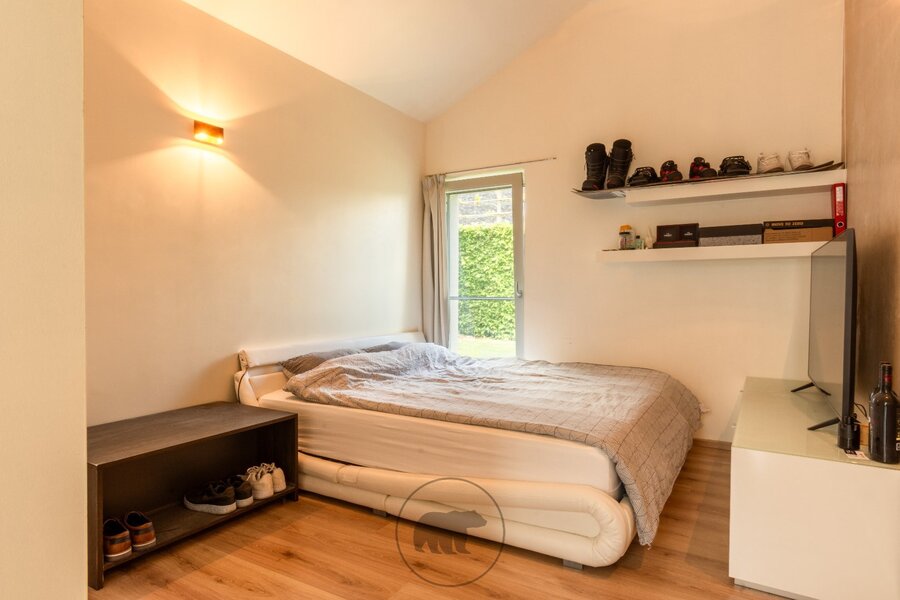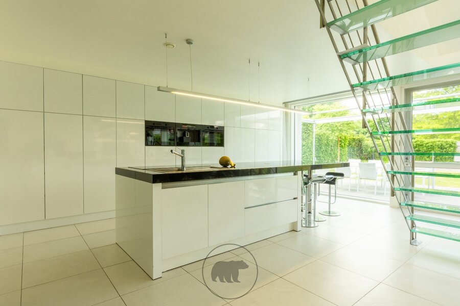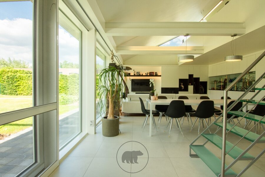 Binnenin de villa kijk je via de 10 meter brede raampartij uit op de tuin. De volumineuze leefruimte, open tot in de nok, bestaat uit een recent vernieuwde en hyper geïnstalleerde design keuken en een gezellige leefruimte met inbouwkasten en een gashaard. Naast de keuken ligt een praktische berging met heelwat kastruimte en toegang tot de kelder. Een centrale open trap in metaal met glazen treden geeft uit op een open bureau-ruimte en een gastenkamer.