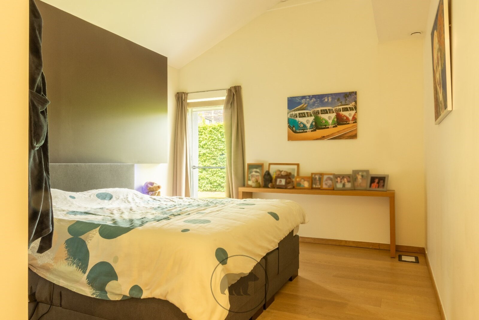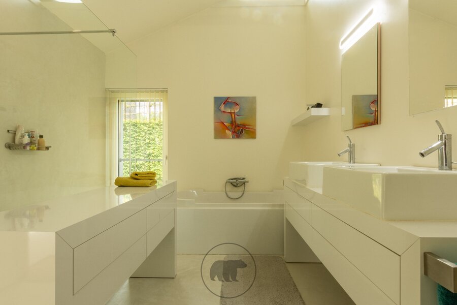 Ook het slaapgedeelte is op zijn minst bijzonder te noemen. Zowel de 3 slaapkamers als de luxueuze en pas vernieuwde badkamer hebben extra volume door de unieke dakconstructie. De ruimtes zijn ruim en lichtrijk en bovendien allemaal voorzien van kasten op maat. Ook de nachthal met zicht op de patio en de koivijver is uitgerust met inbouwkasten.