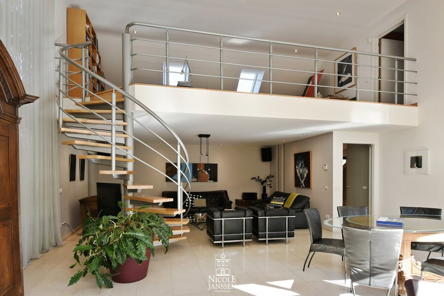 - Ruime zithoek met als eyecatcher: de elegante draaitrap naar de vide
