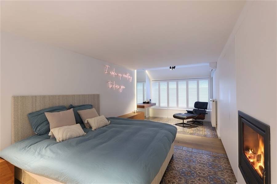 + Slaapkamer op het gelijkvloers met royale afmeting - voorzien van inbouwkasten en dubbelzijdige gashaard die aan de andere zijde uitgeeft op een knappe multifunctionele ruimte