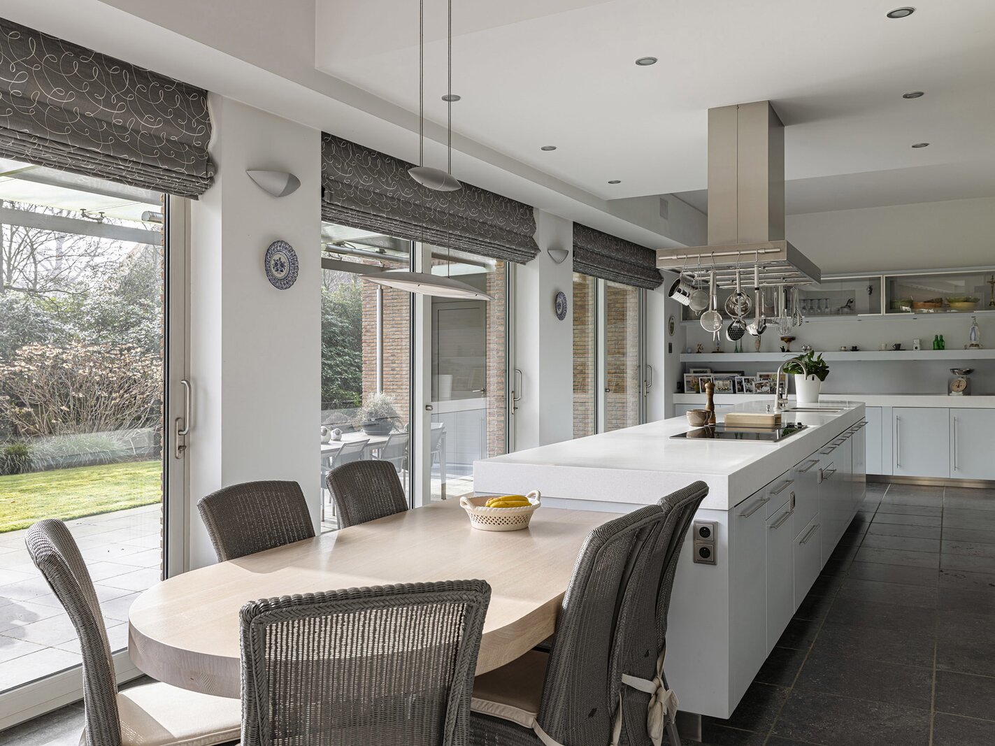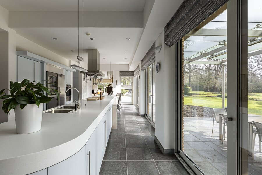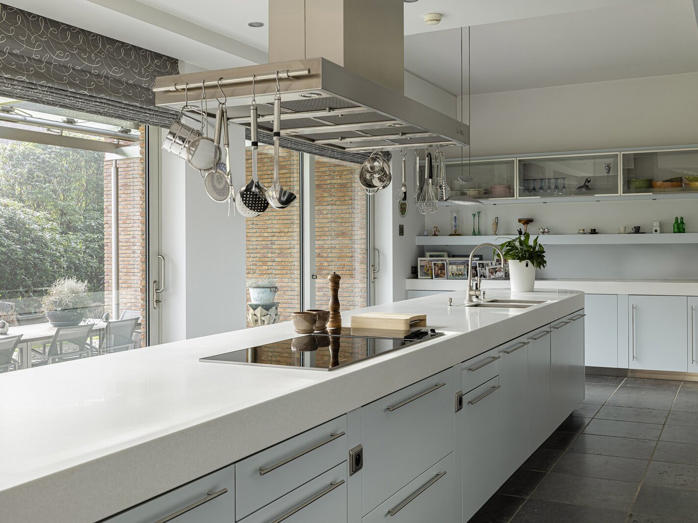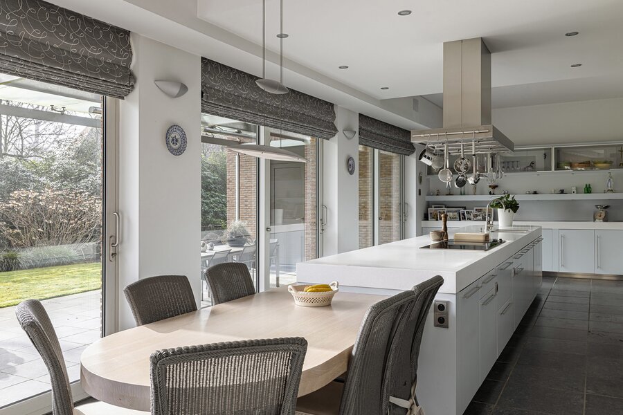 La grande cuisine constitue le cœur de la maison et est équipée d’appareils de qualité ainsi que de nombreux espaces de travail et rangement. Attenants se trouvent notamment un bureau et un salon familial ou TV. La villa dispose également d’un espace de loisirs.