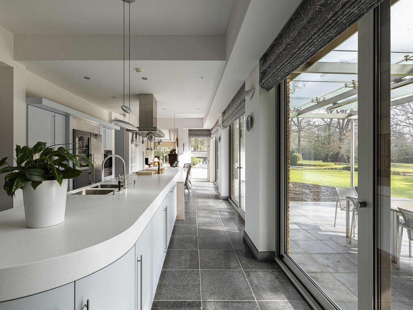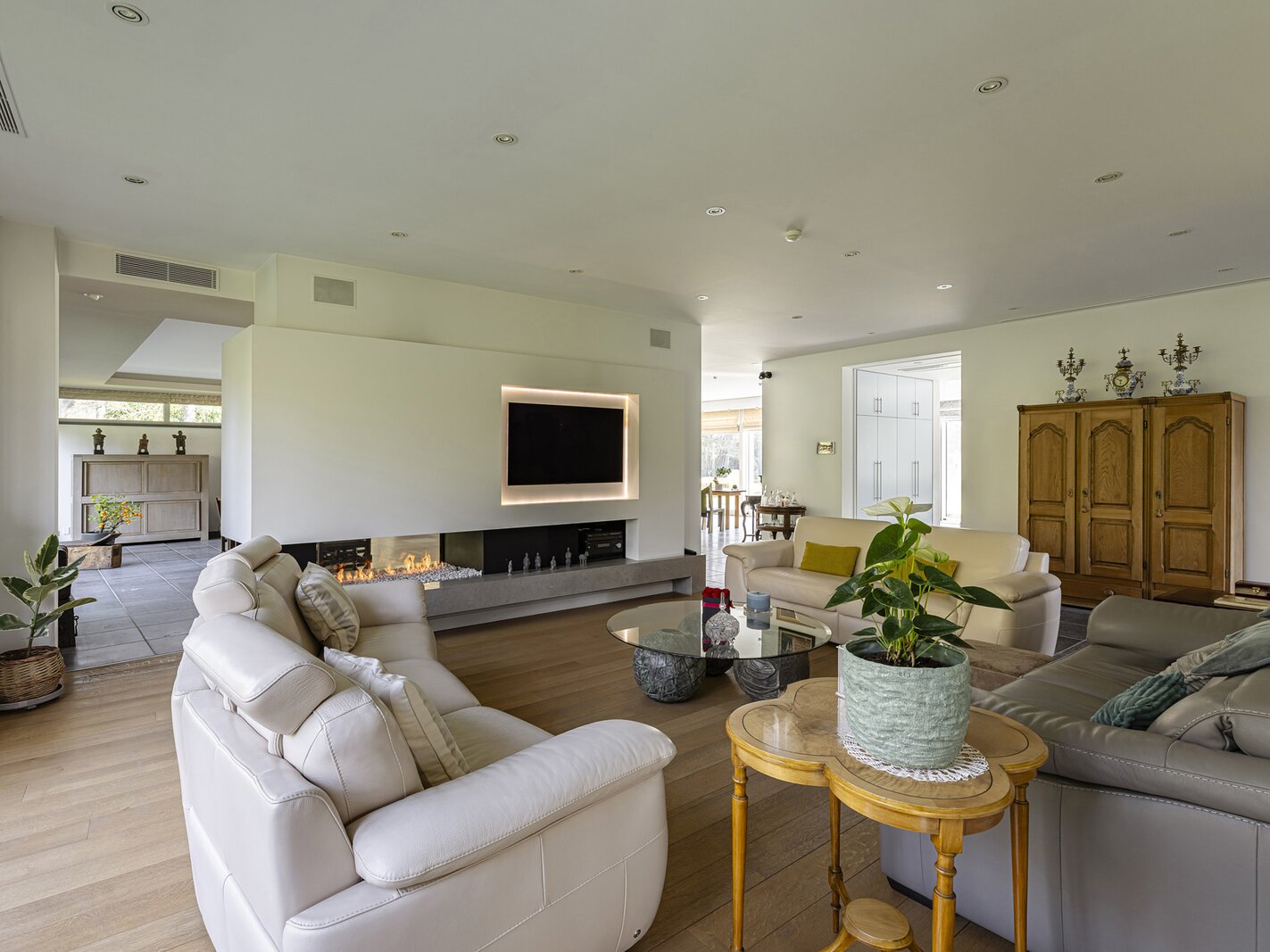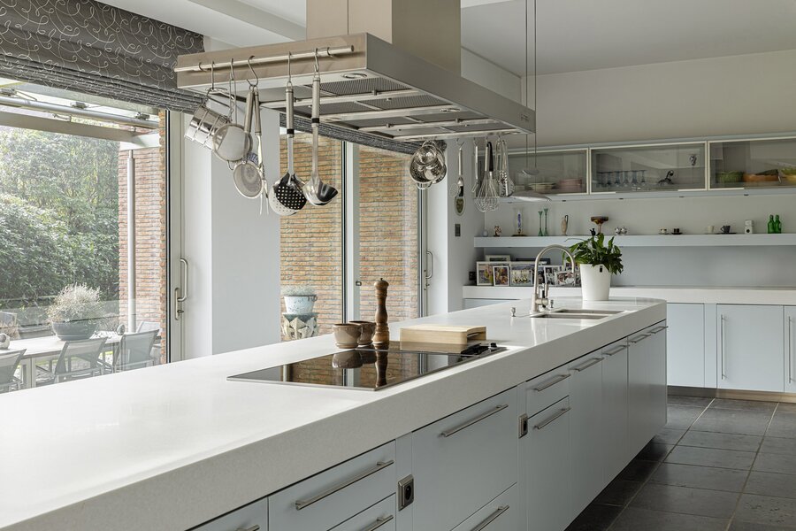 La grande cuisine constitue le cœur de la maison et est équipée d’appareils de qualité ainsi que de nombreux espaces de travail et rangement. Attenants se trouvent notamment un bureau et un salon familial ou TV. La villa dispose également d’un espace de loisirs.