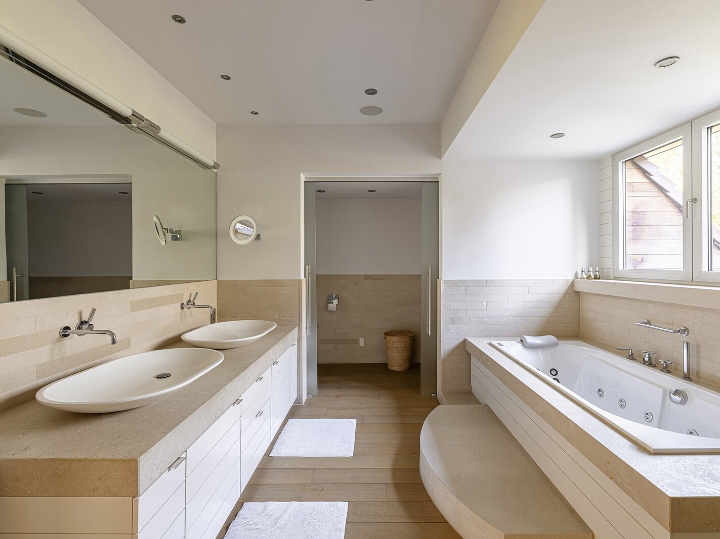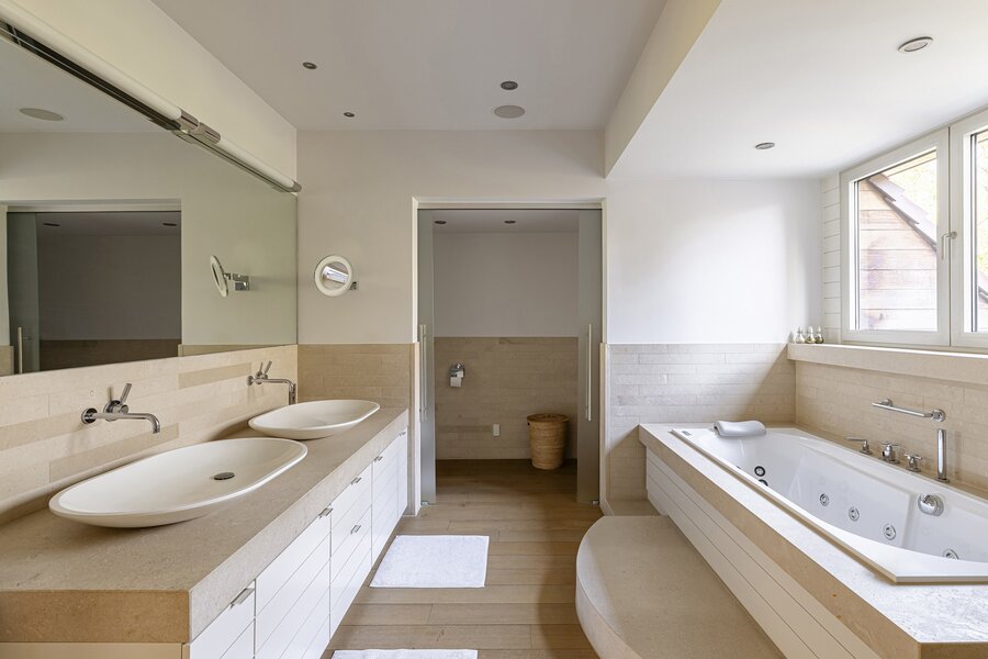 Aux étages se trouvent quatre chambres complètes. La suite parentale bénéficie d’une salle de bains en suite et dressing. La maison compte trois salles de bains.