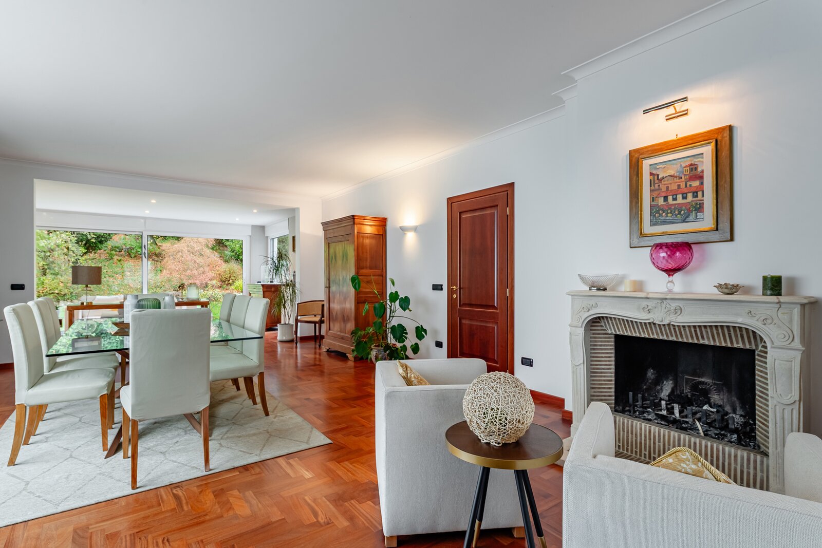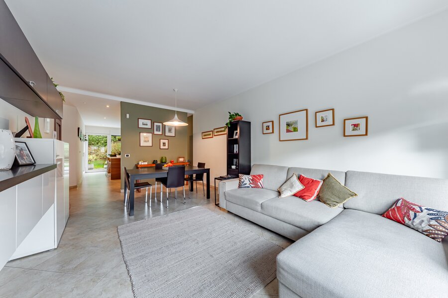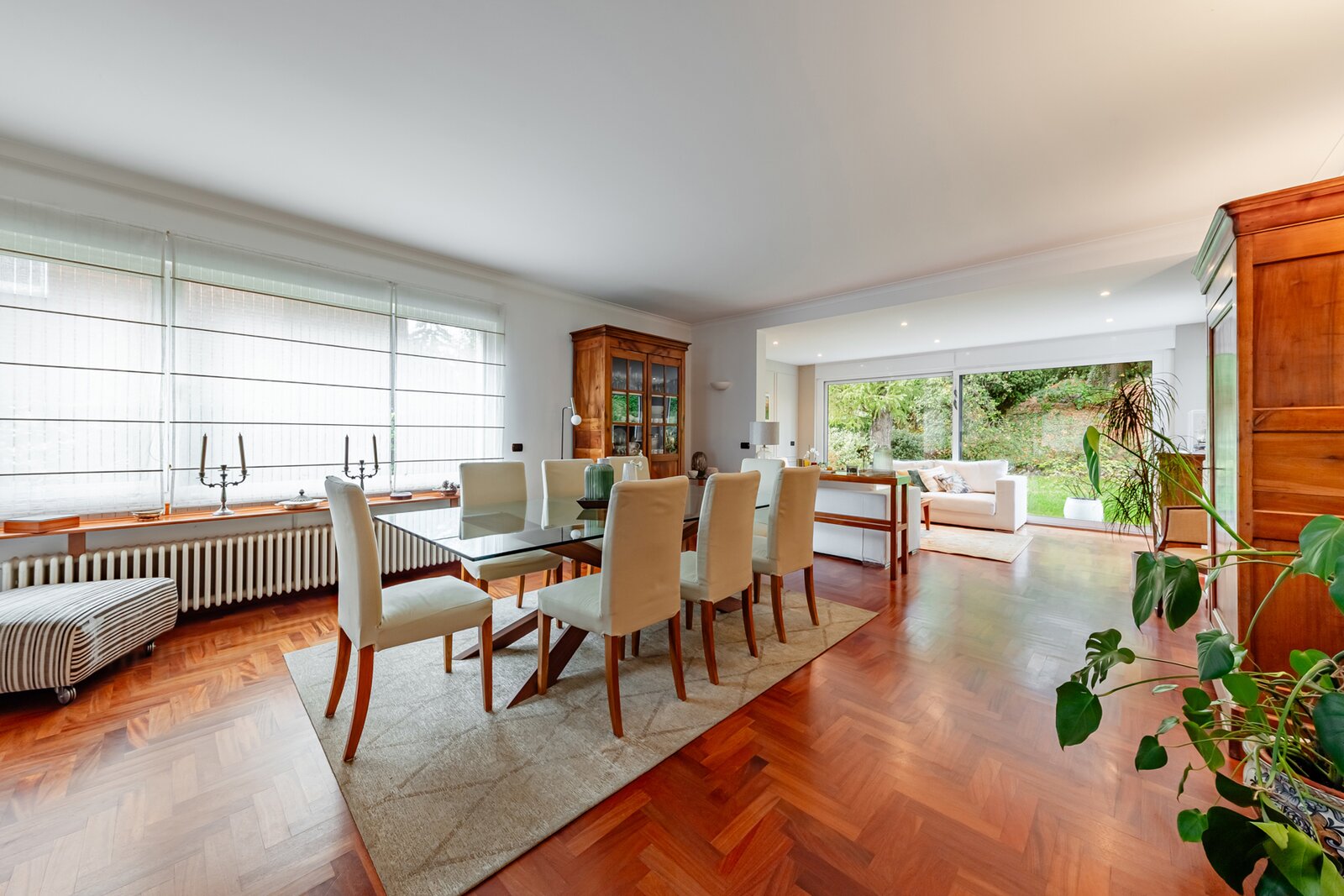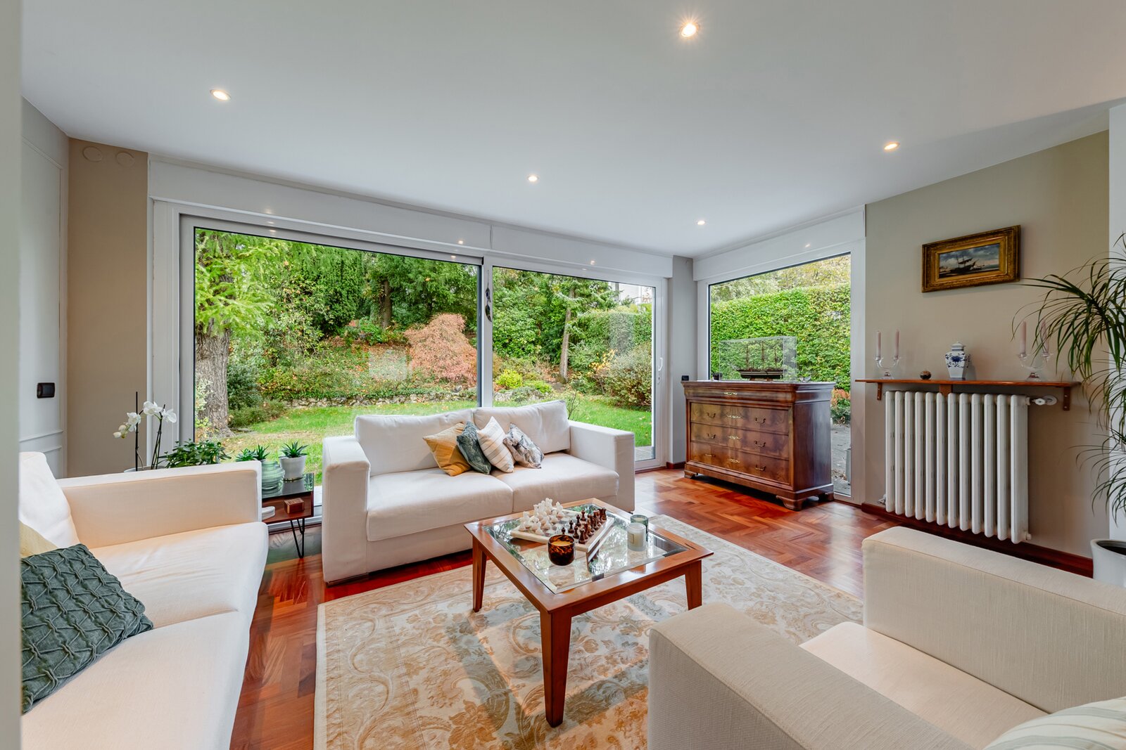 Séjour lumineux de ±55 m², parquet au sol et feu ouvert fonctionnel, offrant une belle vue sur le jardin