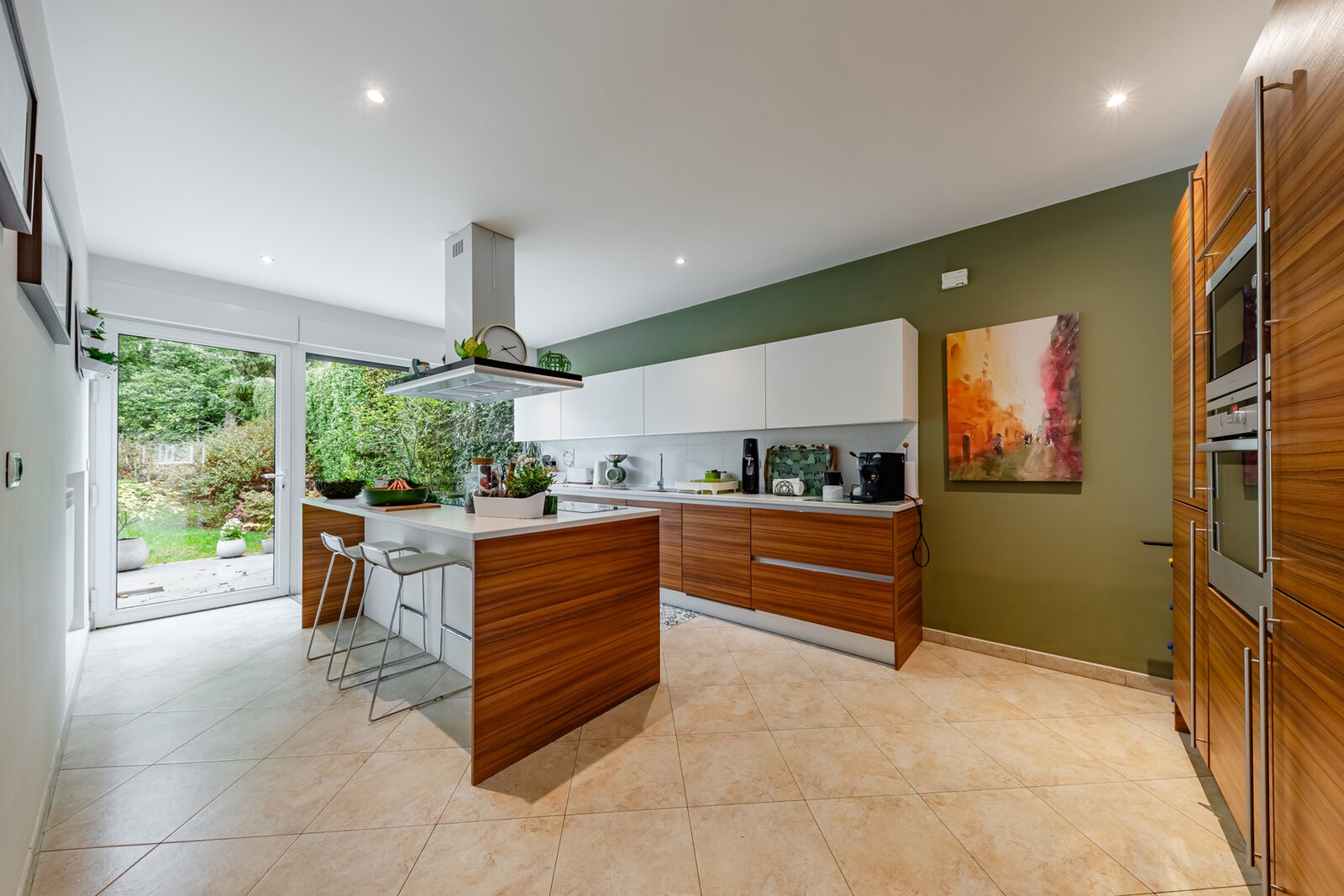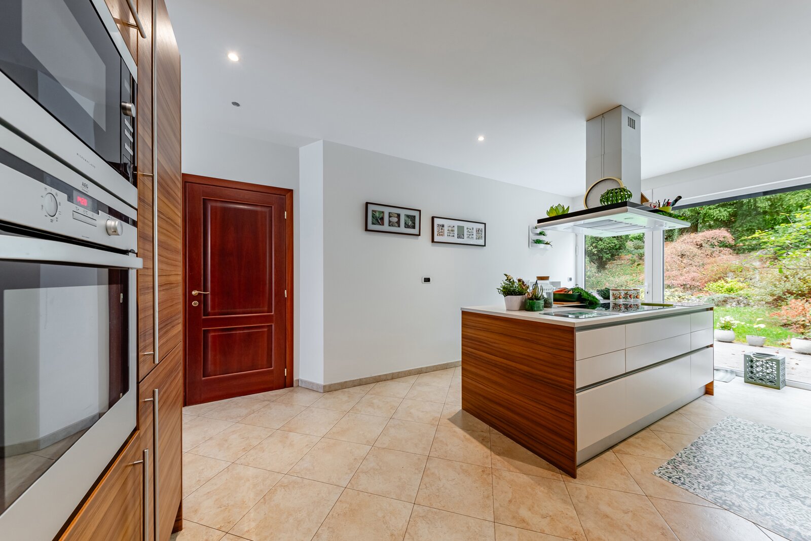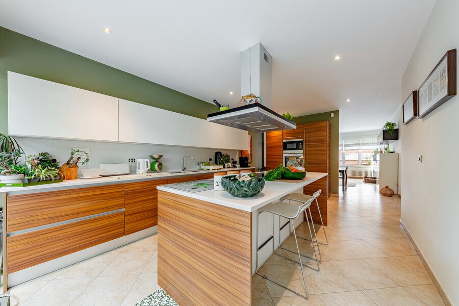 Cuisine dinatoire super équipée en carrelage de ±45 m², avec coin repas et espace “family room” convivial, donnant accès à la terrasse et au jardin