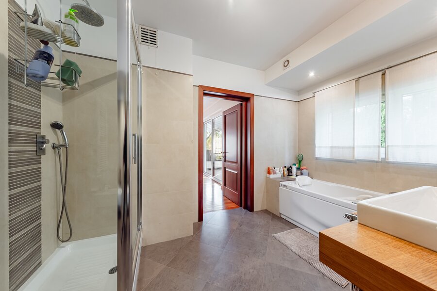 Salle de bains privative attenante à la suite parentale : baignoire, douche, bidet, WC, lavabo (±11 m²)