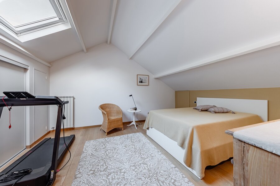 Chambre 4 de ±18 m² avec parquet, placards en mansarde et accès à un petit grenier de rangement
