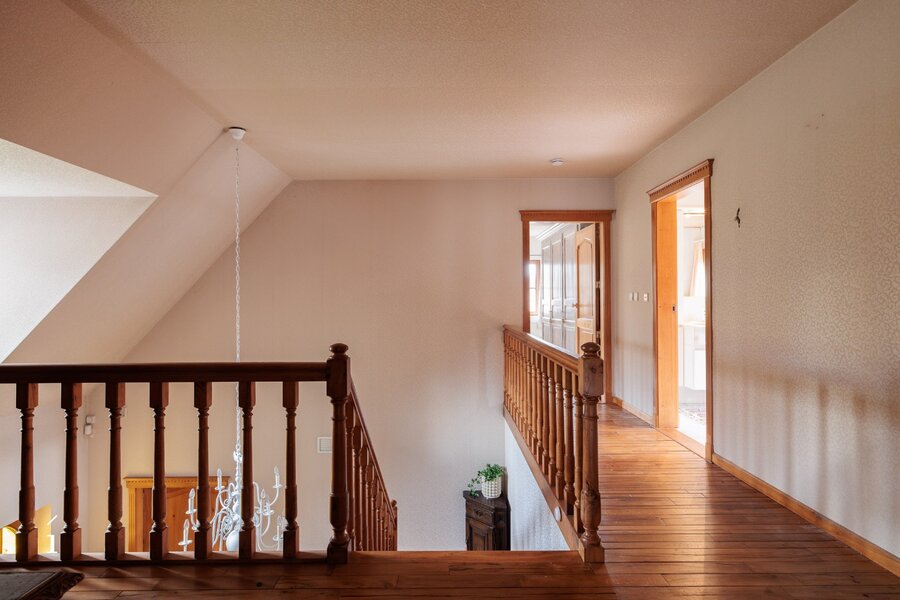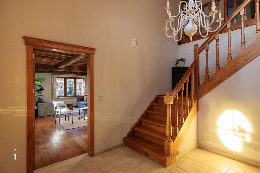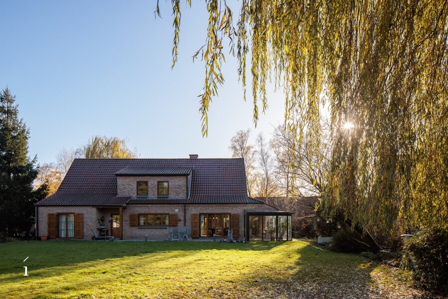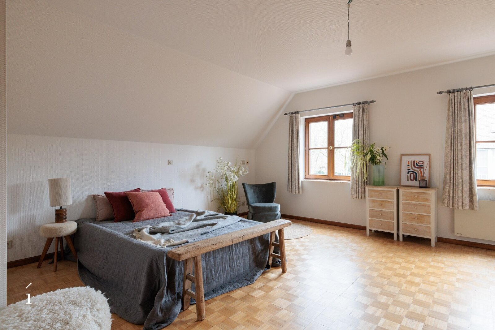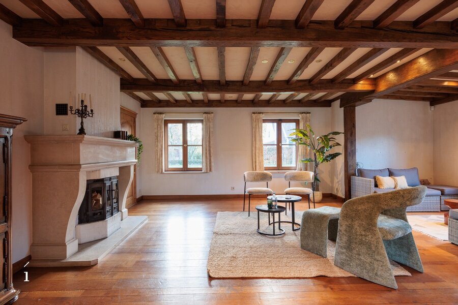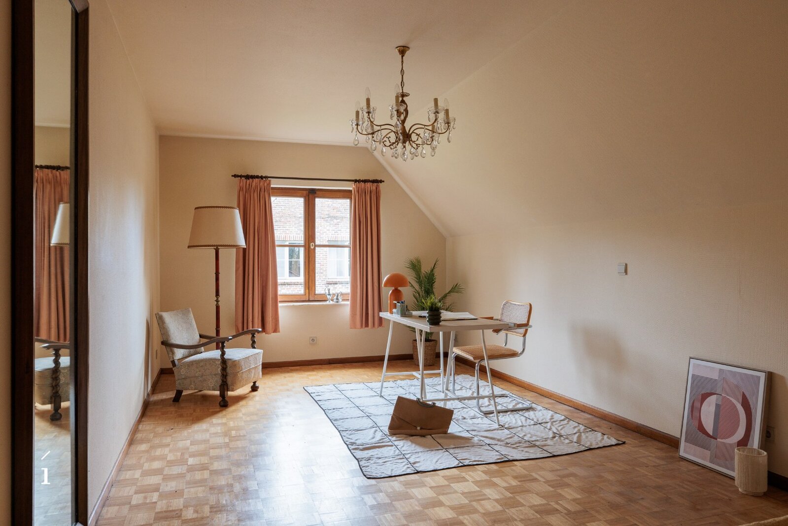 De leefruimte met open haard geniet de hele dag door van zon, dankzij de ideale oriëntatie en grote raampartijen. De leefkeuken sluit rechtstreeks aan op een praktische berging en biedt eveneens toegang tot de kelder, ideaal als extra voorraad- of wijnruimte. Op het gelijkvloers bevindt zich verder een ruime inkomhal met vide, een bureel of slaapkamer, een badkamer en een ruime dubbele inpandige garage met directe toegang tot de woning. Deze indeling maakt de woning bijzonder geschikt voor wie gelijkvloers wil wonen of een extra werkruimte nodig heeft.