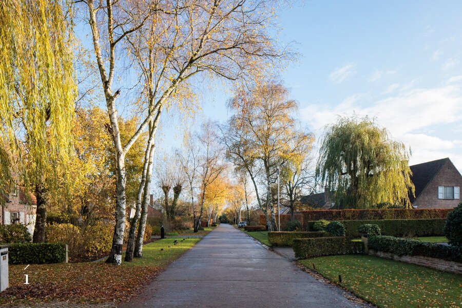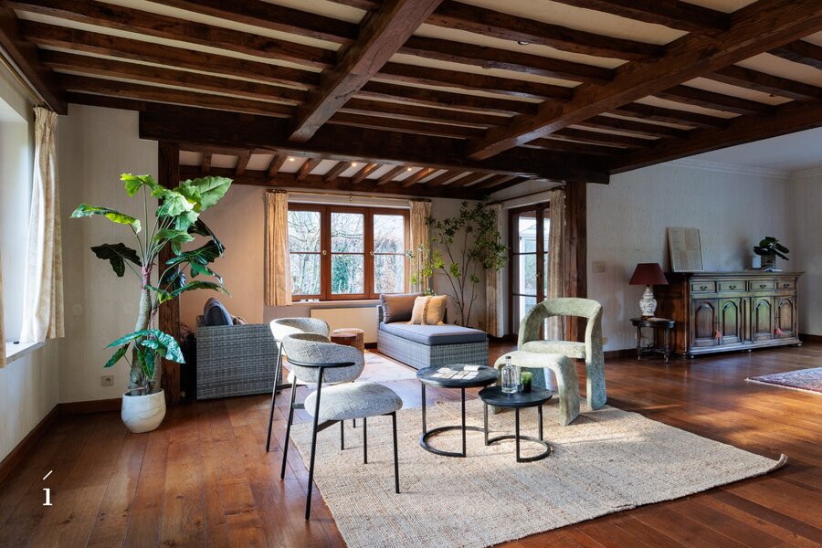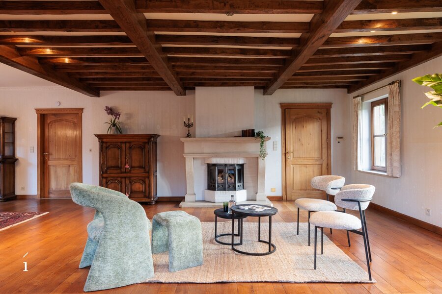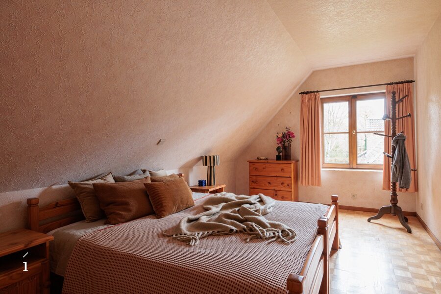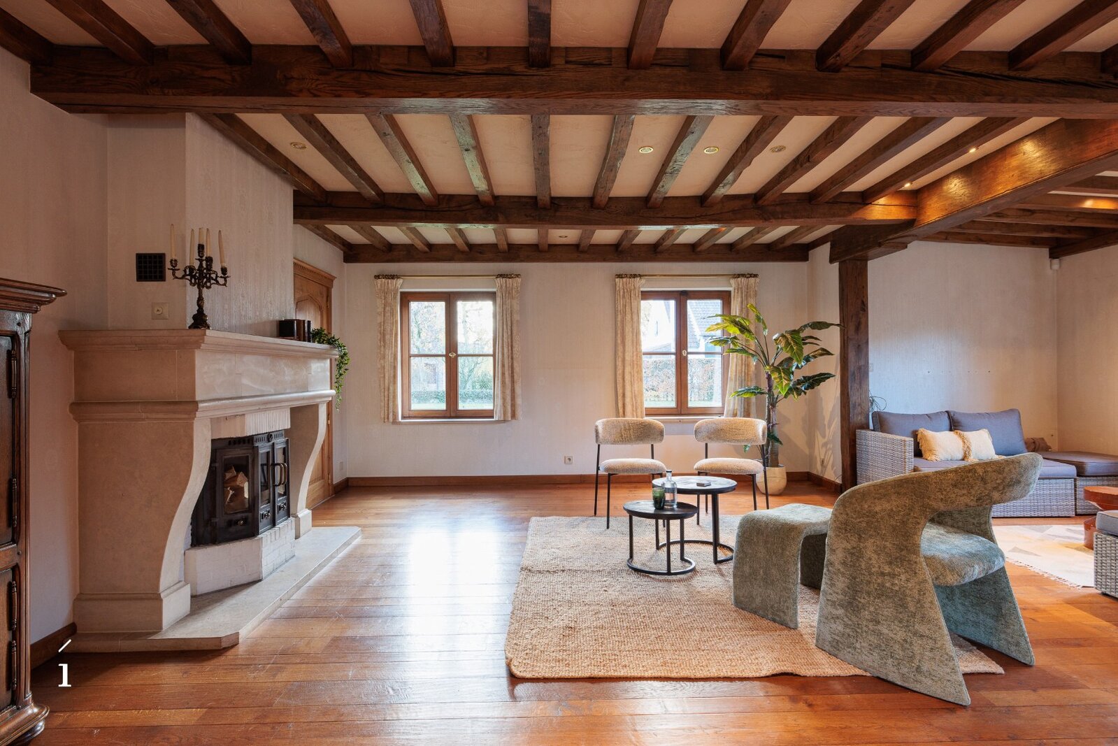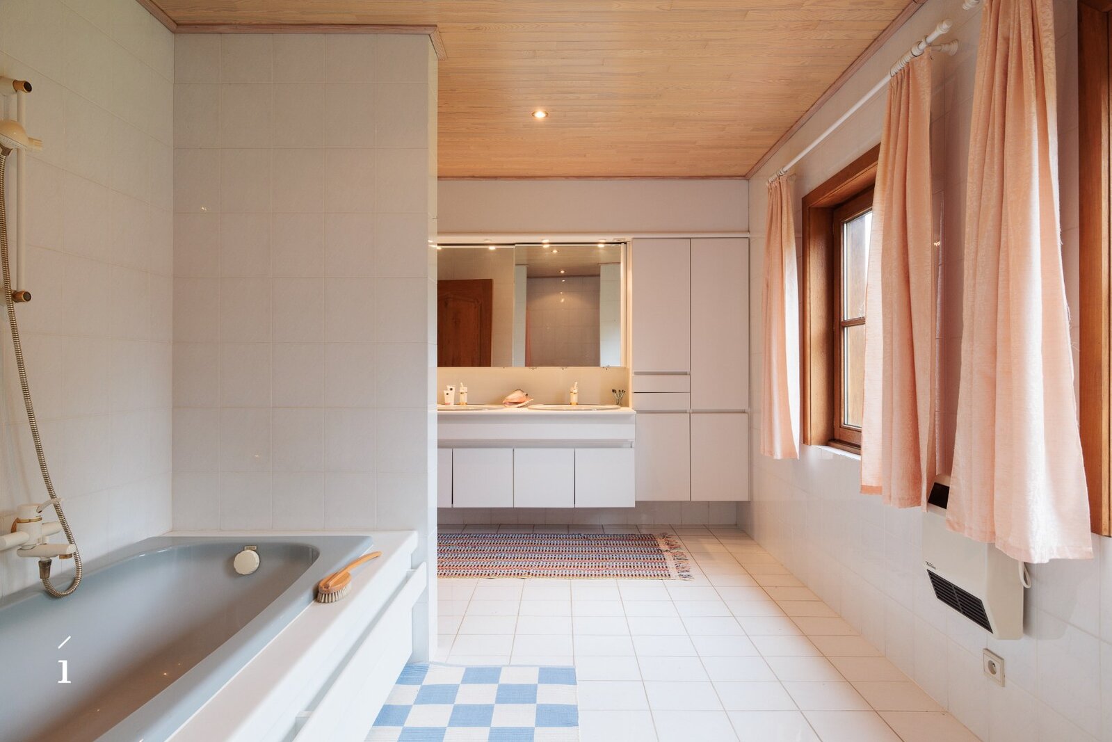De leefruimte met open haard geniet de hele dag door van zon, dankzij de ideale oriëntatie en grote raampartijen. De leefkeuken sluit rechtstreeks aan op een praktische berging en biedt eveneens toegang tot de kelder, ideaal als extra voorraad- of wijnruimte. Op het gelijkvloers bevindt zich verder een ruime inkomhal met vide, een bureel of slaapkamer, een badkamer en een ruime dubbele inpandige garage met directe toegang tot de woning. Deze indeling maakt de woning bijzonder geschikt voor wie gelijkvloers wil wonen of een extra werkruimte nodig heeft.