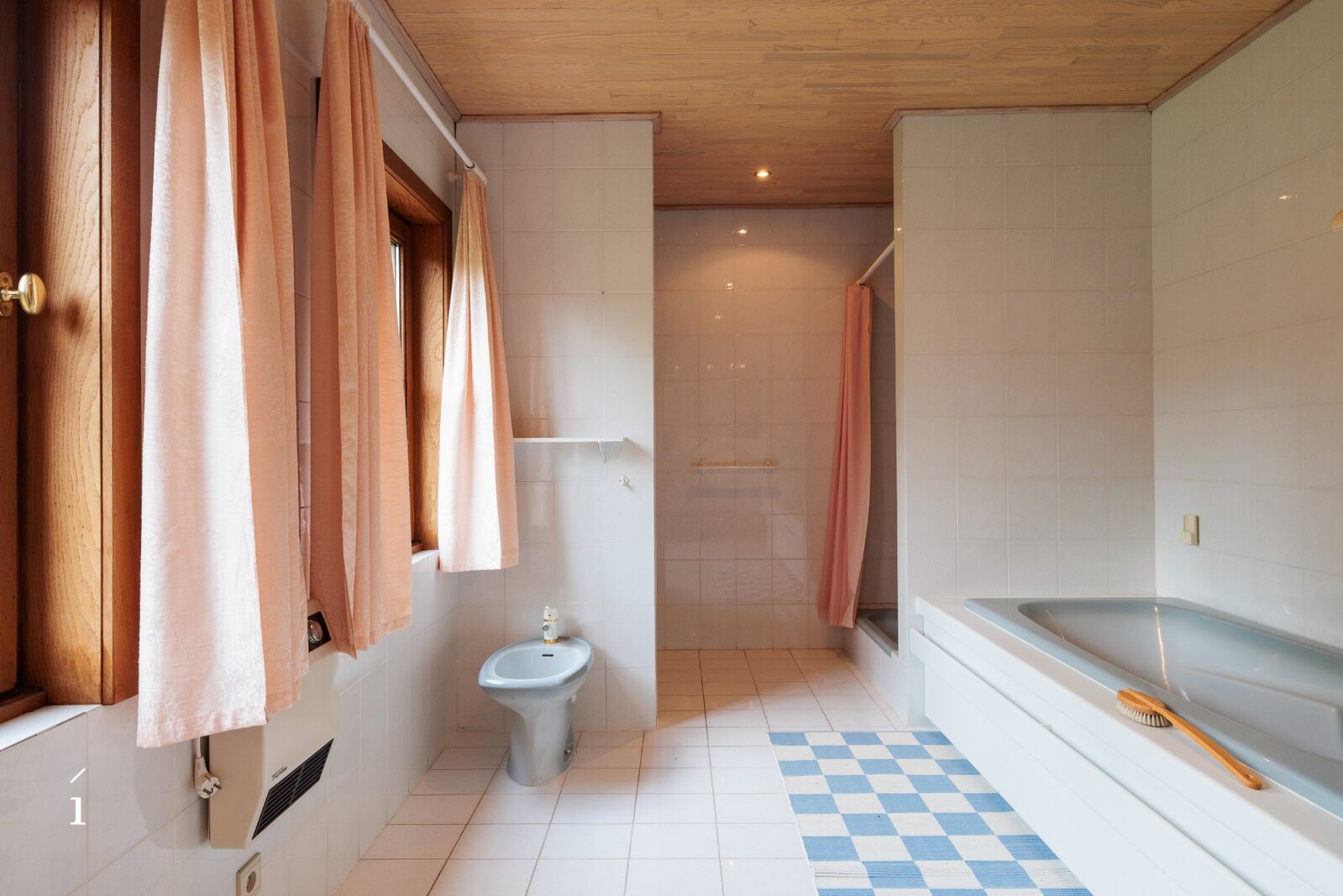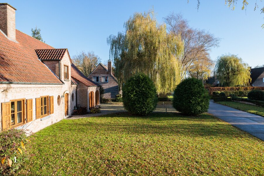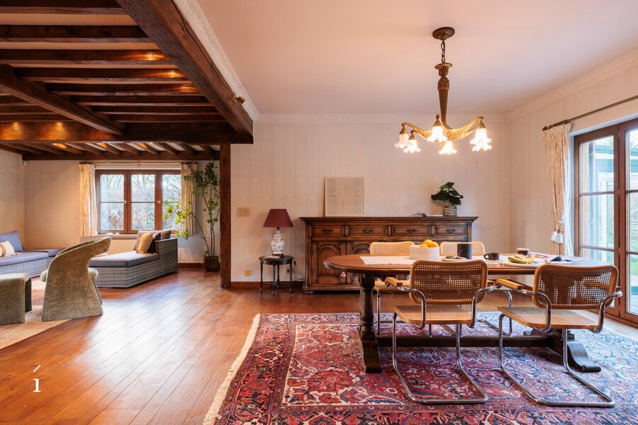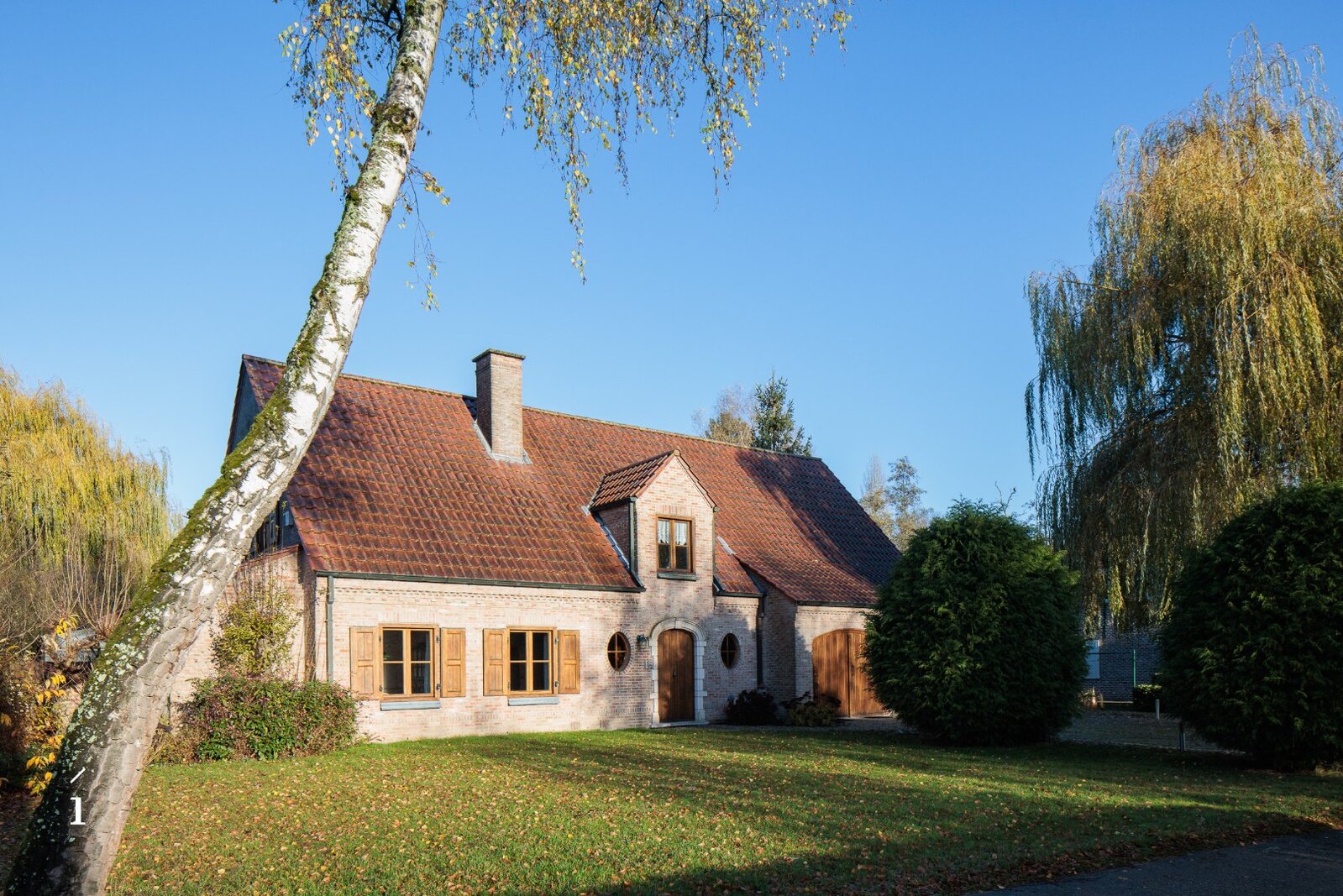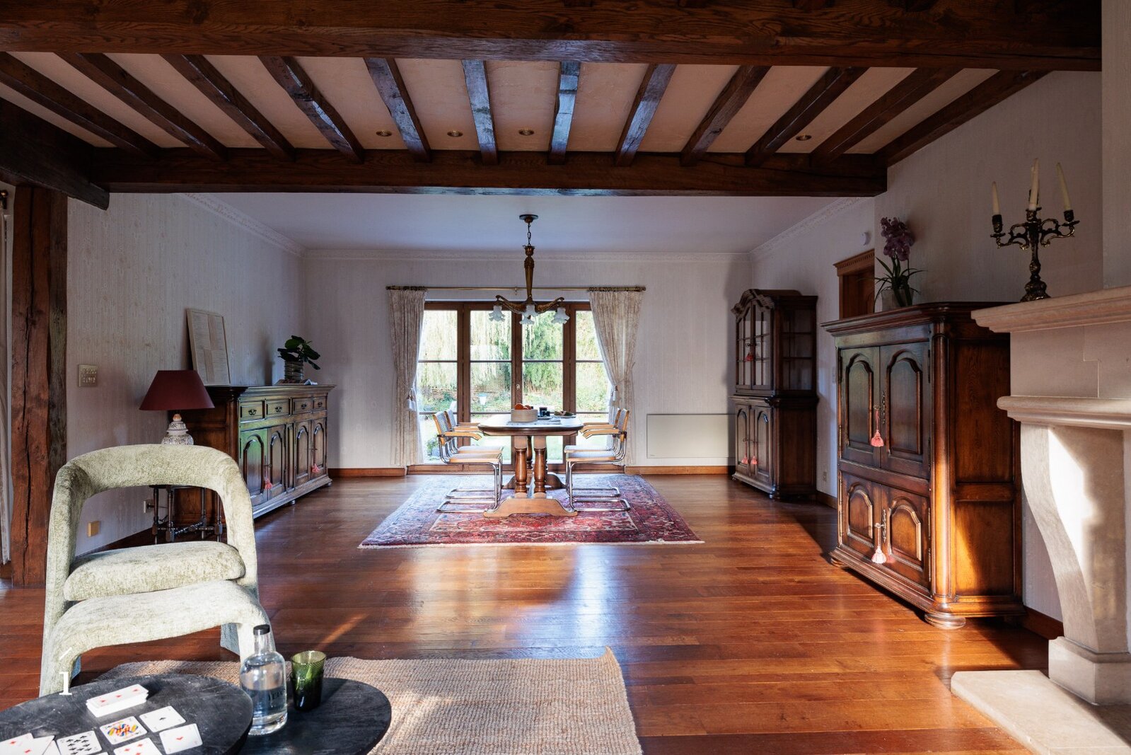 De leefruimte met open haard geniet de hele dag door van zon, dankzij de ideale oriëntatie en grote raampartijen. De leefkeuken sluit rechtstreeks aan op een praktische berging en biedt eveneens toegang tot de kelder, ideaal als extra voorraad- of wijnruimte. Op het gelijkvloers bevindt zich verder een ruime inkomhal met vide, een bureel of slaapkamer, een badkamer en een ruime dubbele inpandige garage met directe toegang tot de woning. Deze indeling maakt de woning bijzonder geschikt voor wie gelijkvloers wil wonen of een extra werkruimte nodig heeft.