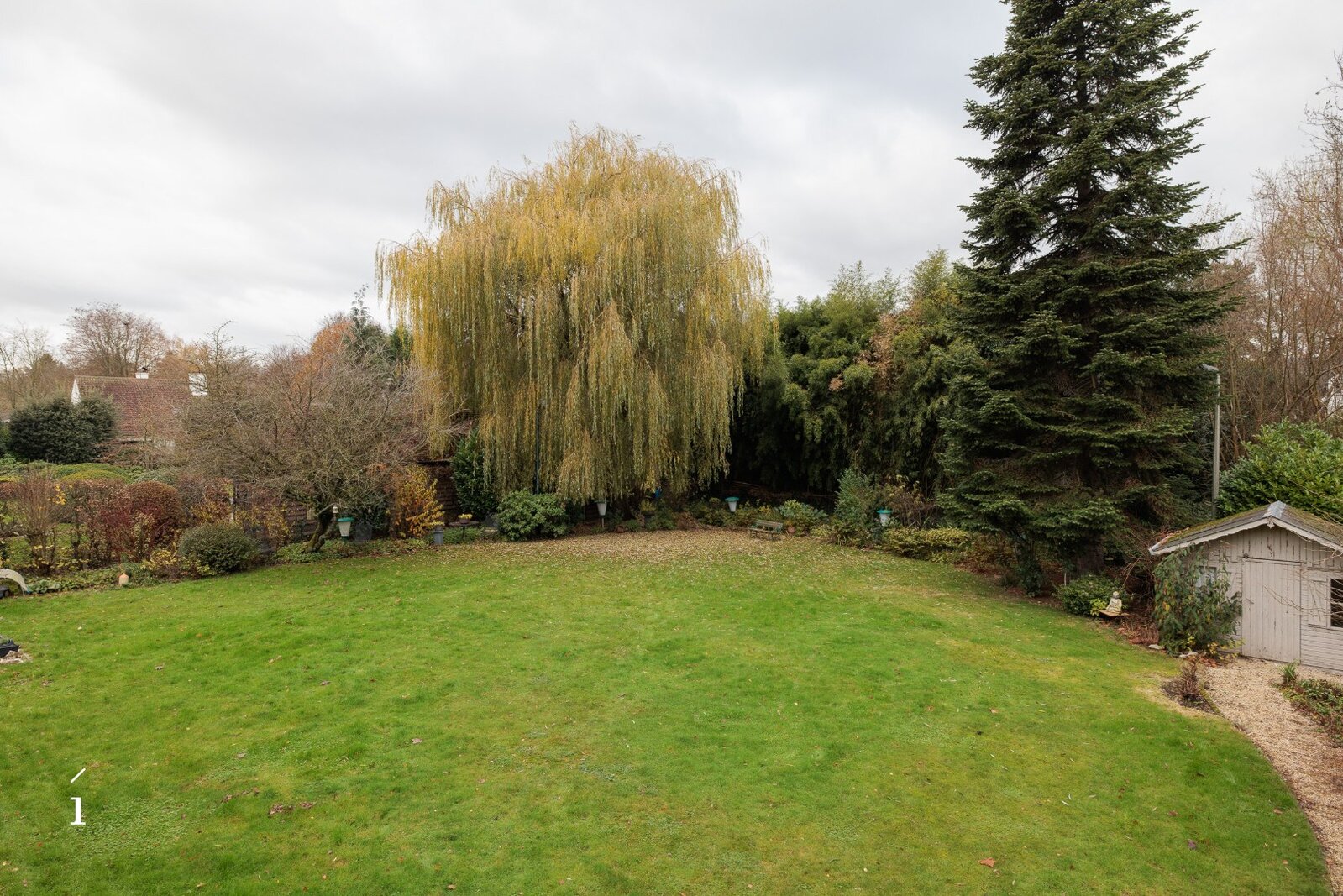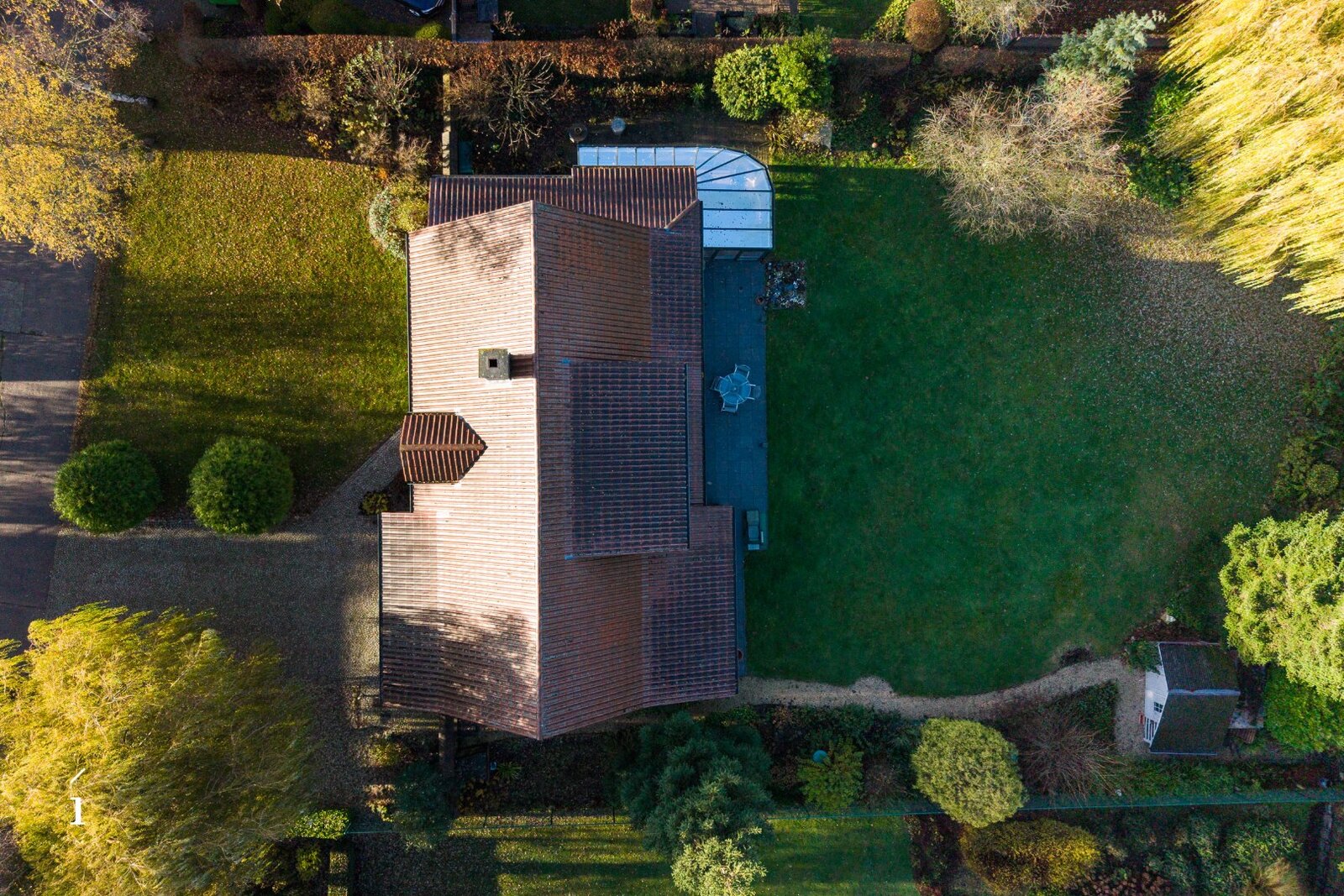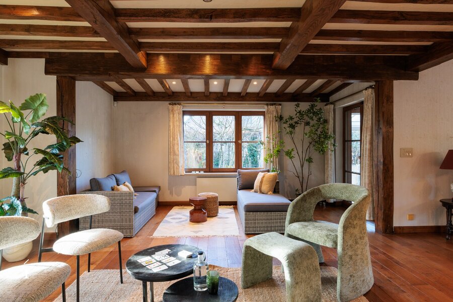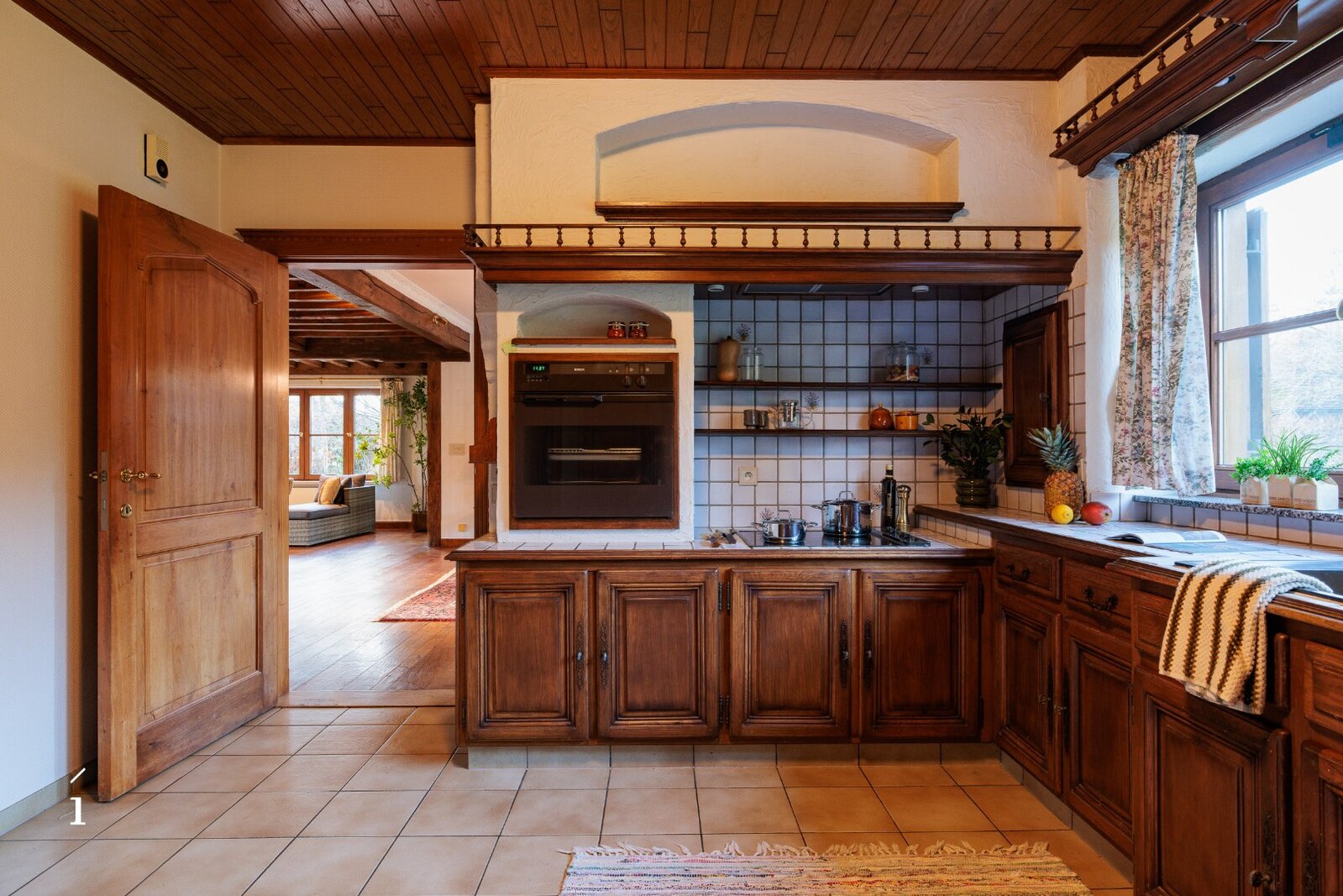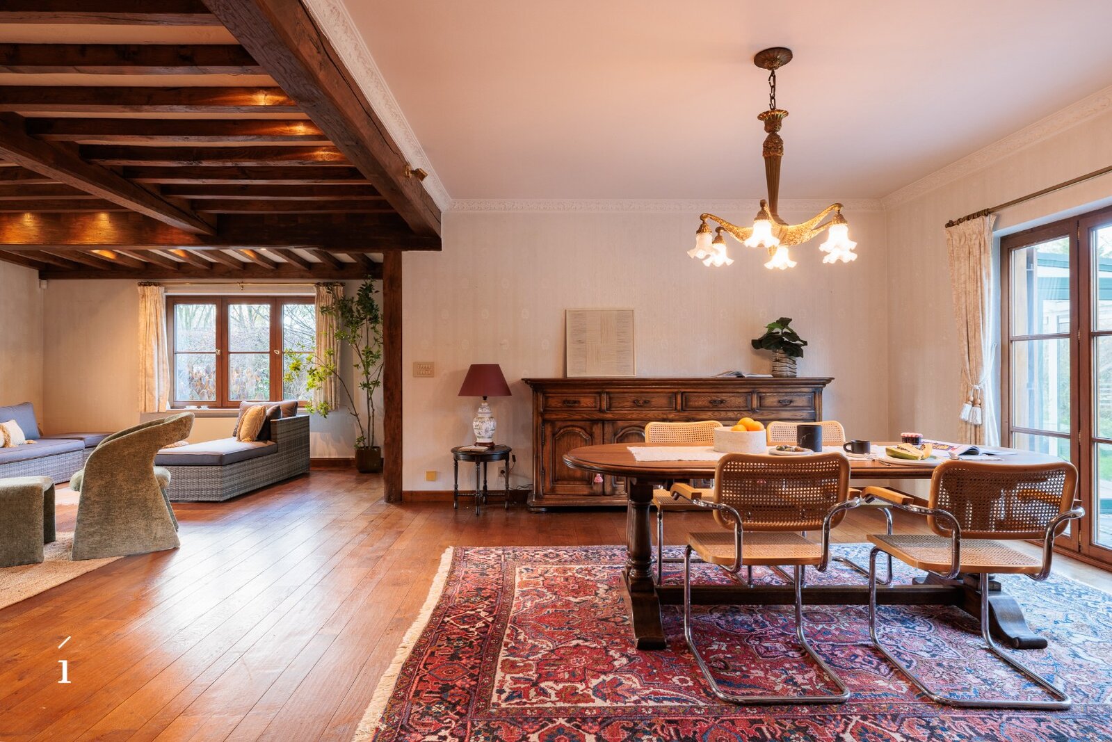 De leefruimte met open haard geniet de hele dag door van zon, dankzij de ideale oriëntatie en grote raampartijen. De leefkeuken sluit rechtstreeks aan op een praktische berging en biedt eveneens toegang tot de kelder, ideaal als extra voorraad- of wijnruimte. Op het gelijkvloers bevindt zich verder een ruime inkomhal met vide, een bureel of slaapkamer, een badkamer en een ruime dubbele inpandige garage met directe toegang tot de woning. Deze indeling maakt de woning bijzonder geschikt voor wie gelijkvloers wil wonen of een extra werkruimte nodig heeft.