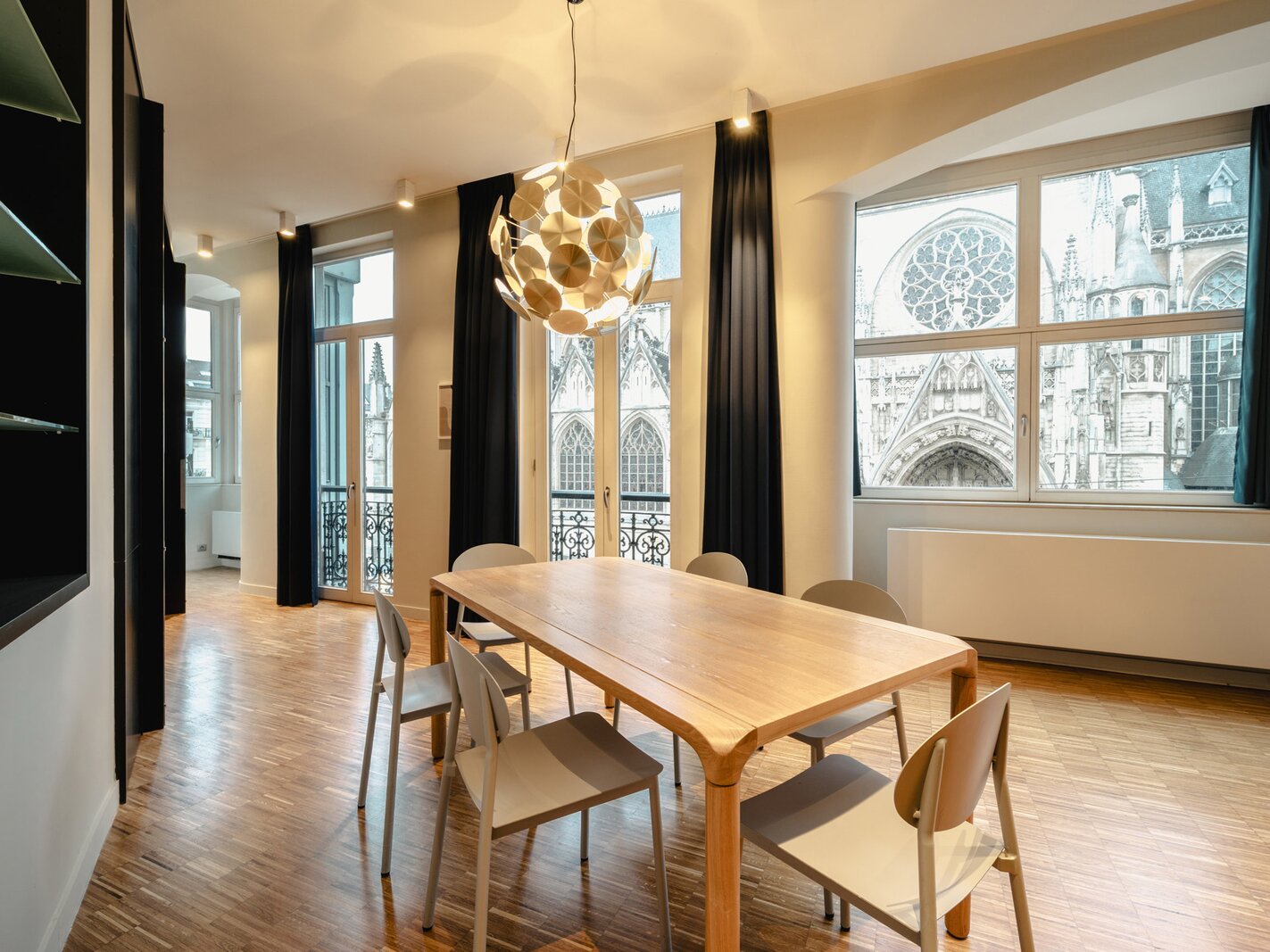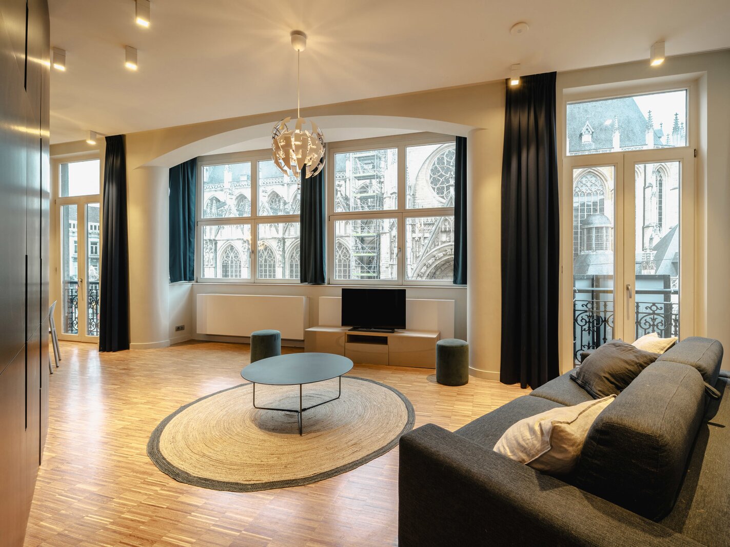 A proximité immédiate de la Place du Sablon, appartement deux chambres d’une superficie brute selon PEB de ± 121 m² offrant une vue dégagée sur Notre-Dame du Sablon.