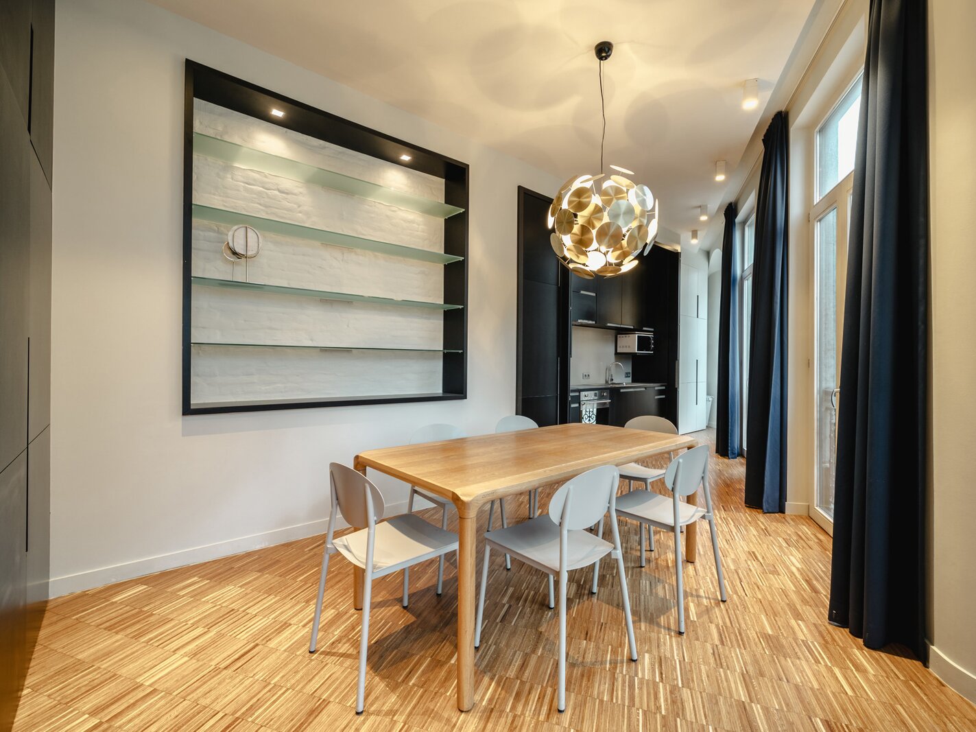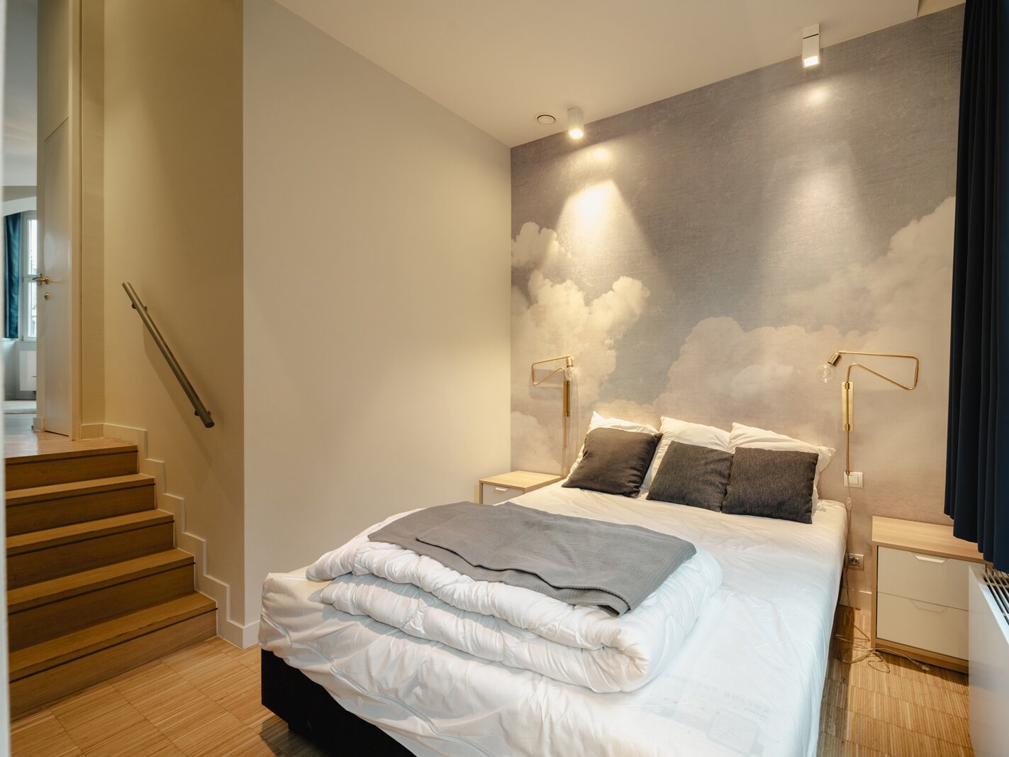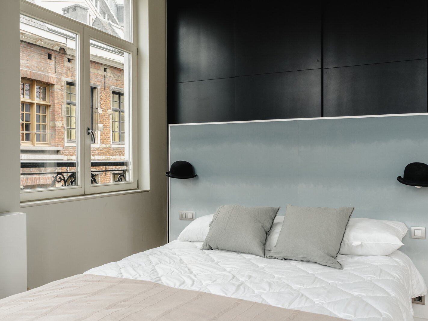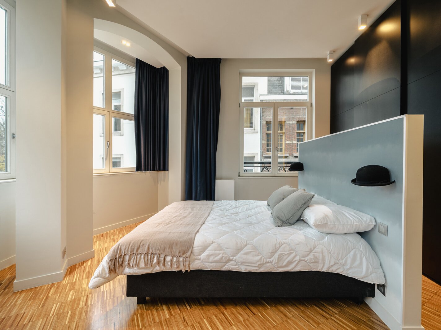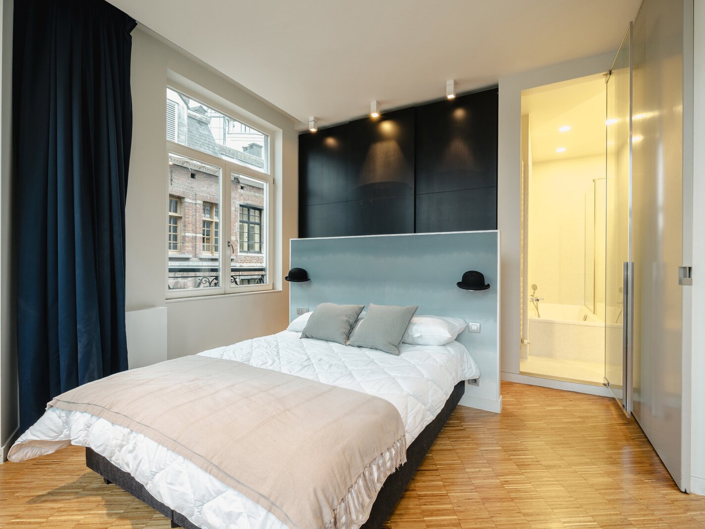 Situé au 1er étage d’un immeuble néo-classique, l’appartement de style loft s’ouvre sur les espaces de vie baignés de lumière grâce aux nombreuses fenêtres faisant face à Notre-Dame du Sablon. Ils se composent d’un espace ouvert comprenant un séjour/salle à manger et une cuisine entièrement équipée prolongée d’un back office. Une chambre de ± 15 m² avec dressing séparé et salle de bain avec douche et baignoire et une seconde chambre de ± 12 m² avec salle de douche privative.