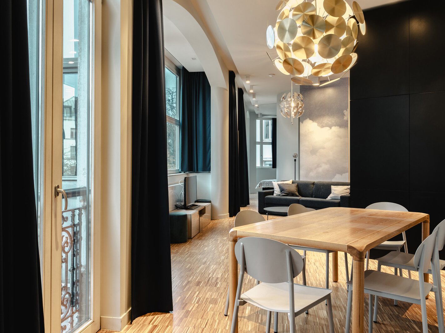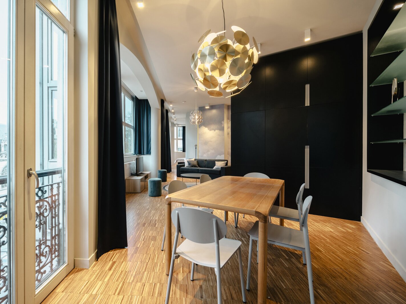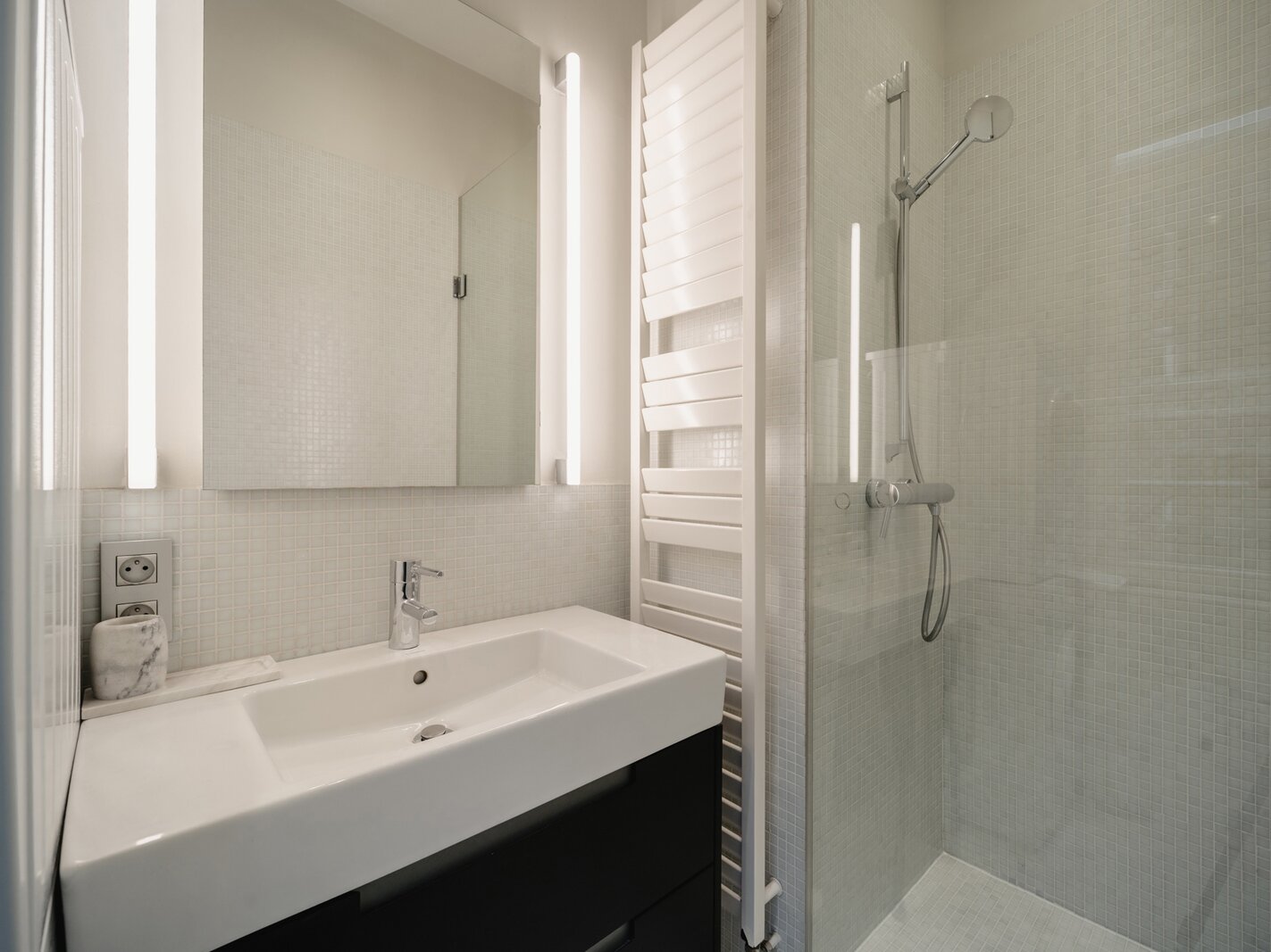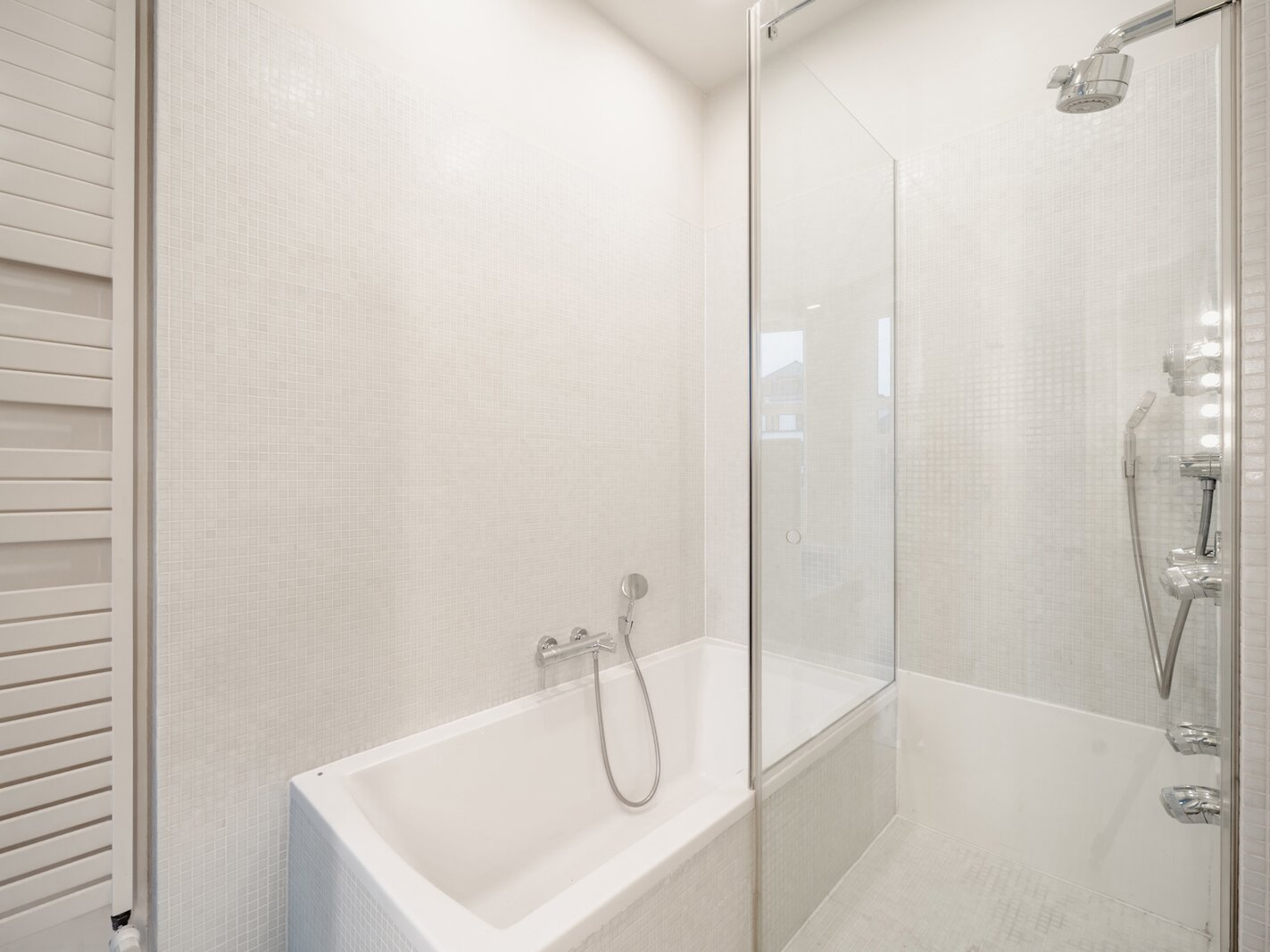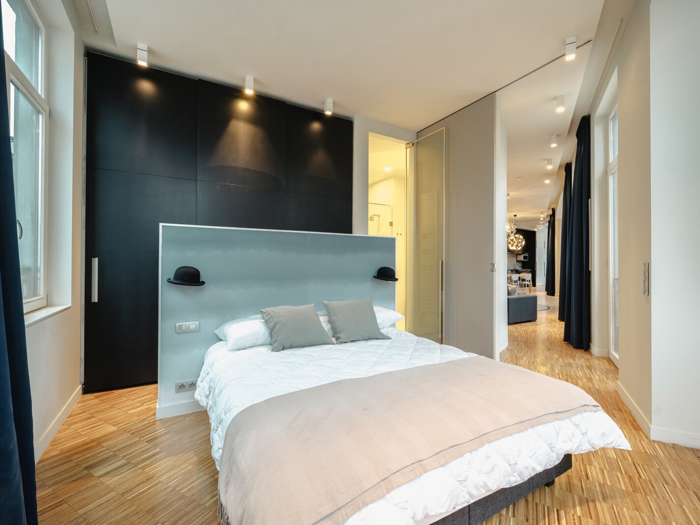 Situé au 1er étage d’un immeuble néo-classique, l’appartement de style loft s’ouvre sur les espaces de vie baignés de lumière grâce aux nombreuses fenêtres faisant face à Notre-Dame du Sablon. Ils se composent d’un espace ouvert comprenant un séjour/salle à manger et une cuisine entièrement équipée prolongée d’un back office. Une chambre de ± 15 m² avec dressing séparé et salle de bain avec douche et baignoire et une seconde chambre de ± 12 m² avec salle de douche privative.