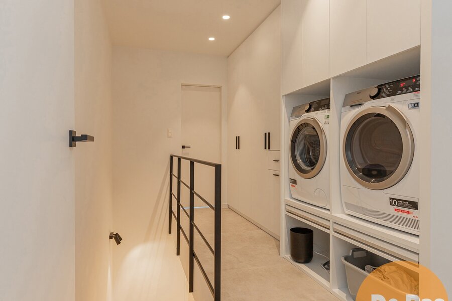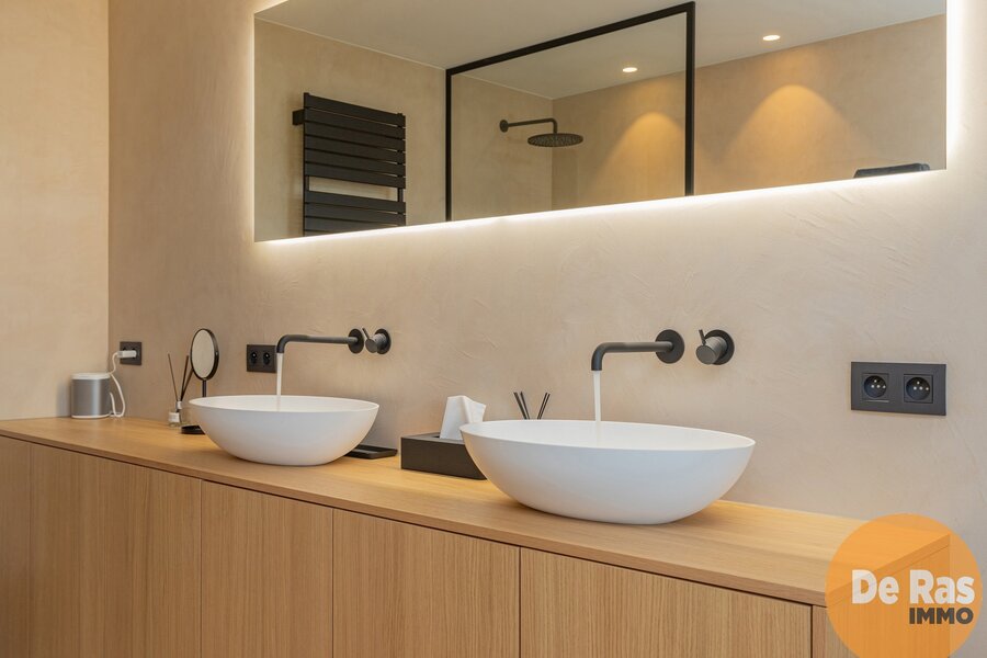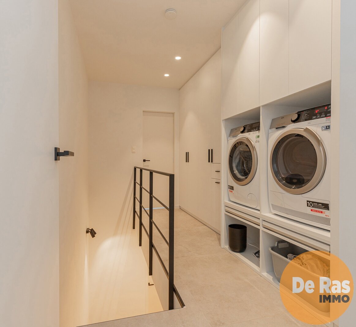 De leefkeuken vormt het hart van de woning: een modern kookeiland met geïntegreerde wijnkoelkast en alle hedendaagse toestellen. Terwijl u kookt geniet u van een prachtig zicht op de tuin – een setting die uitnodigt tot culinair genieten én gezellige momenten met familie of vrienden.