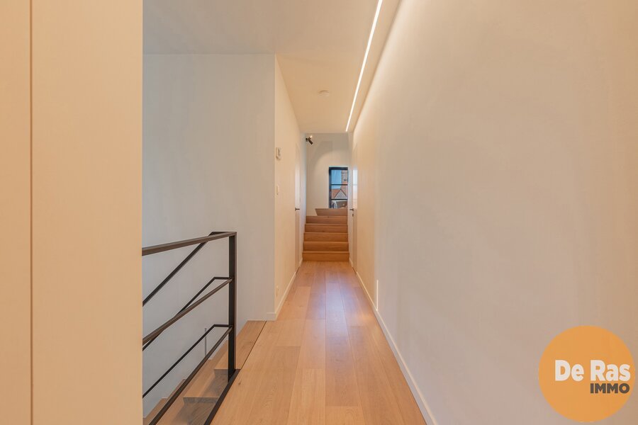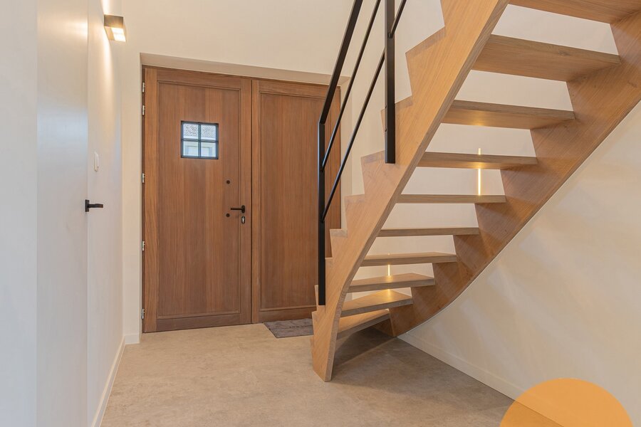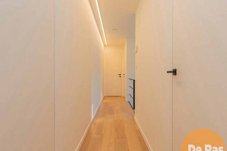 Bij binnenkomst trekt de pivoterende deur meteen de aandacht – een architecturaal statement dat de toon zet voor de rest van de woning. De leefruimte baadt in natuurlijk licht en werd verfijnd afgewerkt met warme parketvloeren, een gezellige gashaard en grote raampartijen. Vloerverwarming zorgt overal voor aangename warmte en ultiem comfort.
