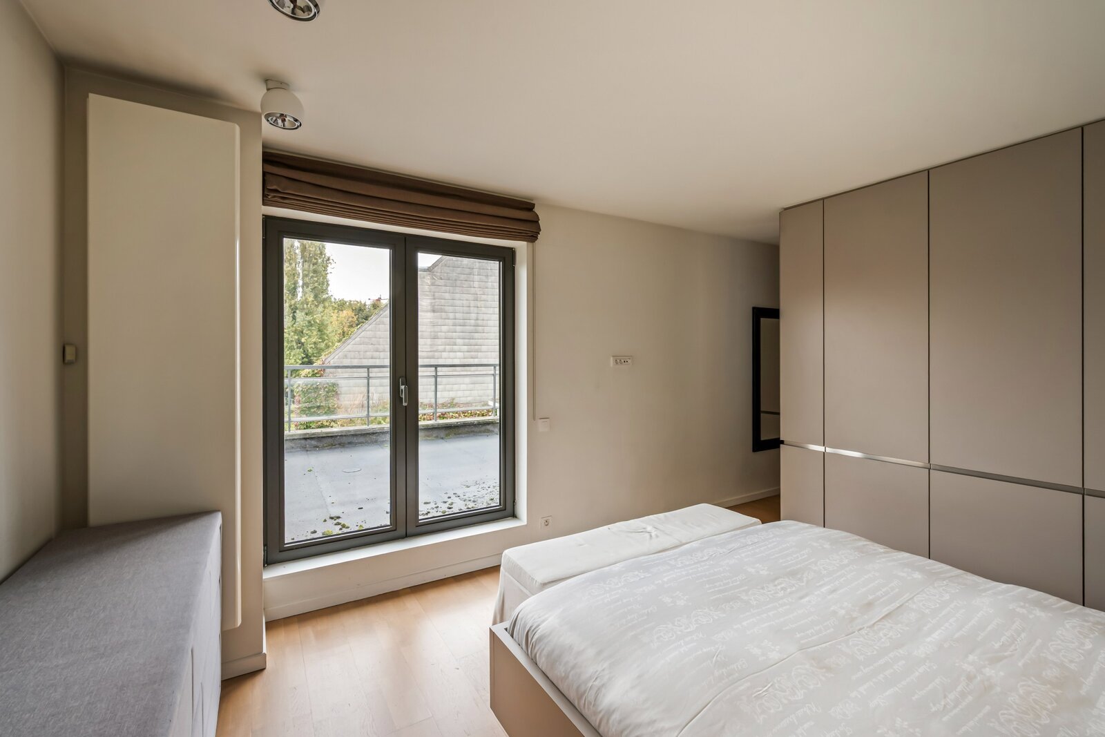 Une troisième chambre avec des placards encastrés, une poutre en béton et une finition en plateau qui apportent une touche industrielle. Il y a également une salle de bains séparée à cet étage.