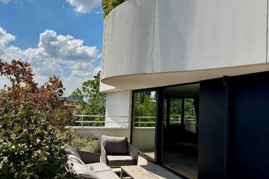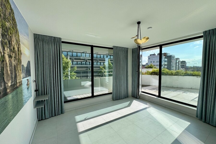 Bij binnenkomst word je verwelkomd door een stijlvolle inkomhal met gastentoilet en praktische berging. Via een elegante glazen deur kom je in de royale leefruimte, die overspoeld wordt door natuurlijk licht dankzij de grote raampartijen. Vanuit de woonkamer stap je direct op de terrassen, perfect georiënteerd op de zon, waar je in alle rust van de stad kunt genieten.