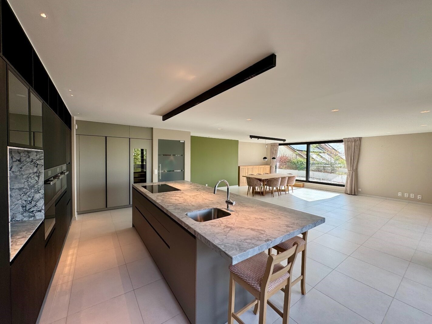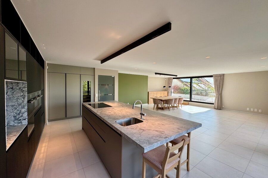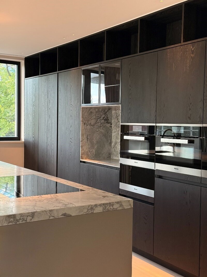 De open designkeuken is een droom voor elke kookliefhebber. Met een centraal kookeiland, verfijnde materialen en een volledige Miele-uitrusting – van oven en stoomoven tot wijnkoeler, vaatwasmachine, koelkast, diepvriezer, inductiekookplaat en warmhoudlade – vormt deze keuken het kloppend hart van het appartement.