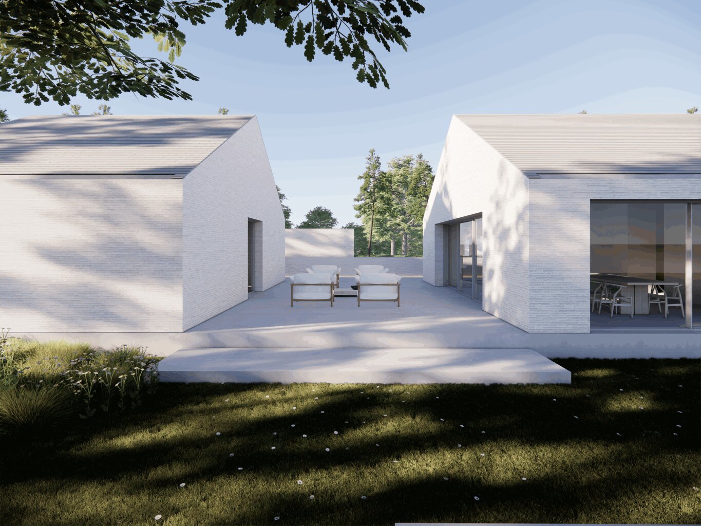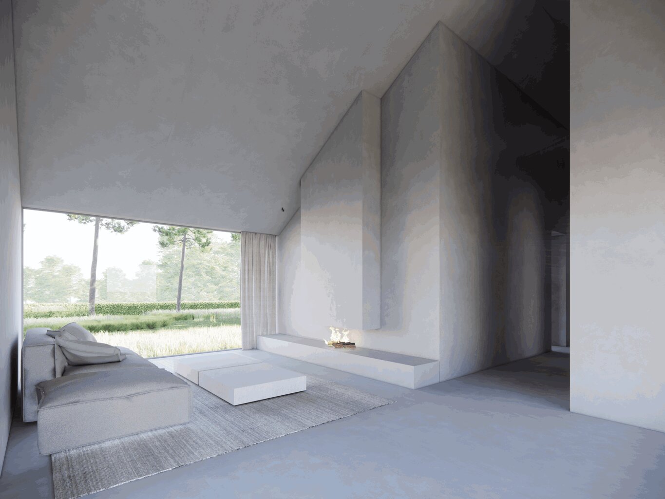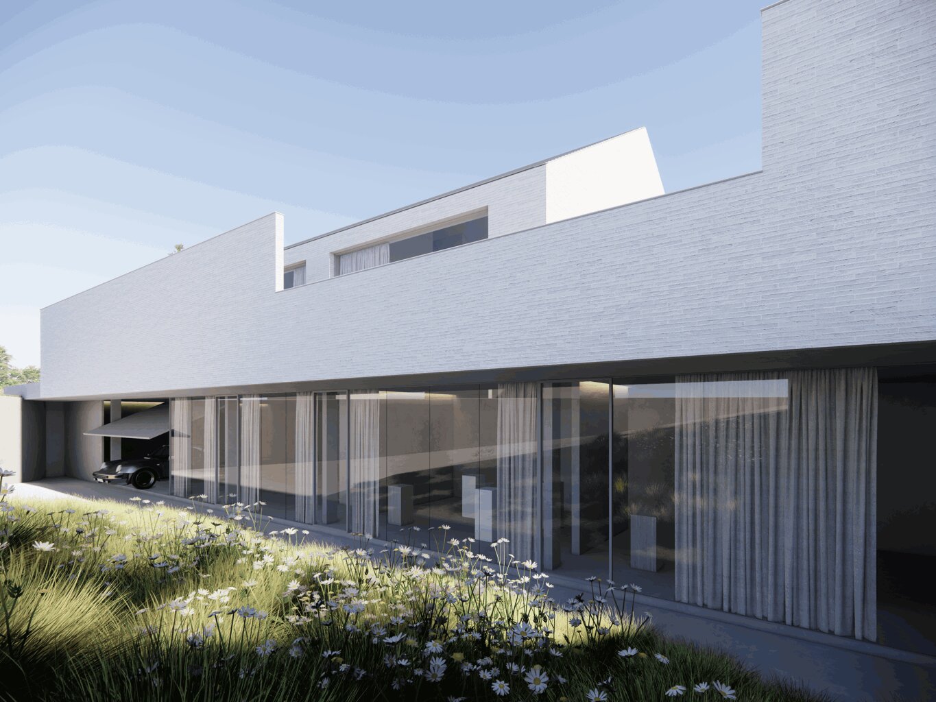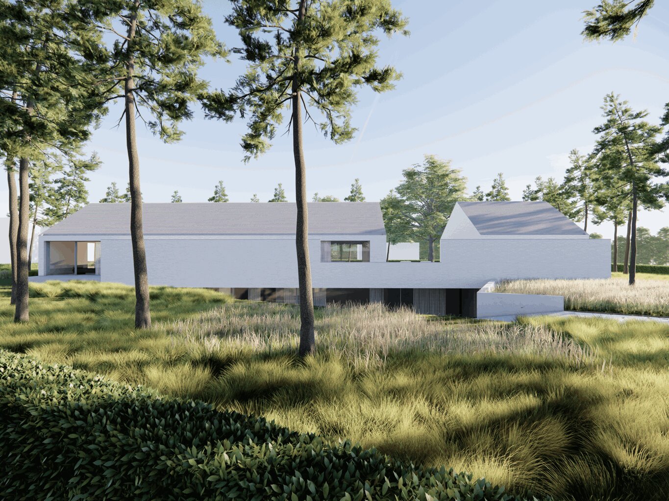 Pour ce terrain unique, le permis de construire et le projet sont déjà disponibles, mais vous êtes libre d’y apporter votre propre vision. Le permis concerne une villa de plain-pied avec bassin de nage, conçue par l’architecte Sofie Ooms. En quête d’un équilibre idéal entre vie et travail, elle a imaginé cette maison de plain-pied composée de deux volumes asymétriques, harmonieusement reliés par un patio et une terrasse ouverte. Un espace de vie et de travail confortable, baigné de lumière naturelle dans toutes les pièces. Des espaces supplémentaires en sous-sol accueillent les installations techniques, un garage et un atelier offrant une vue apaisante et inspirante sur le jardin en pente à l’anglaise, les cimes des arbres et l’immensité du ciel.