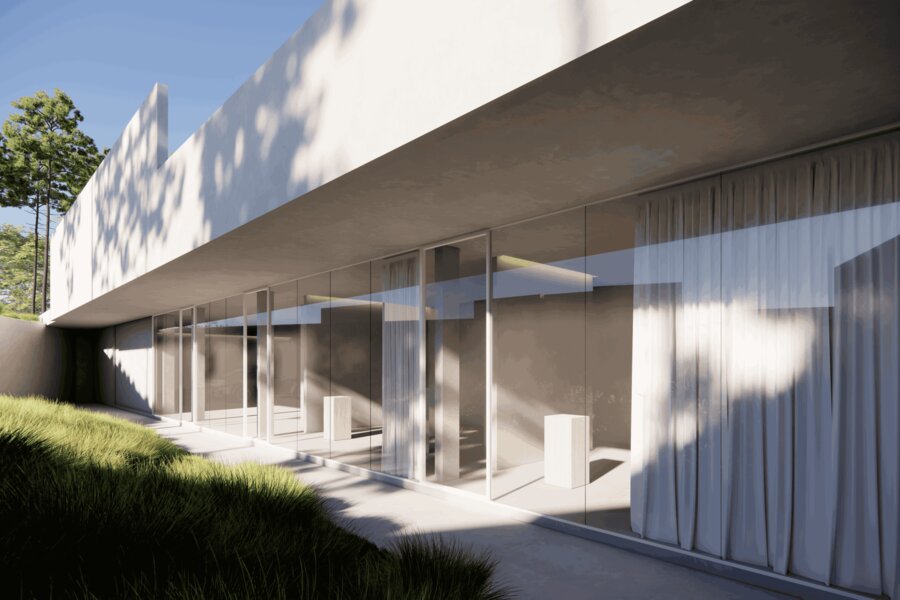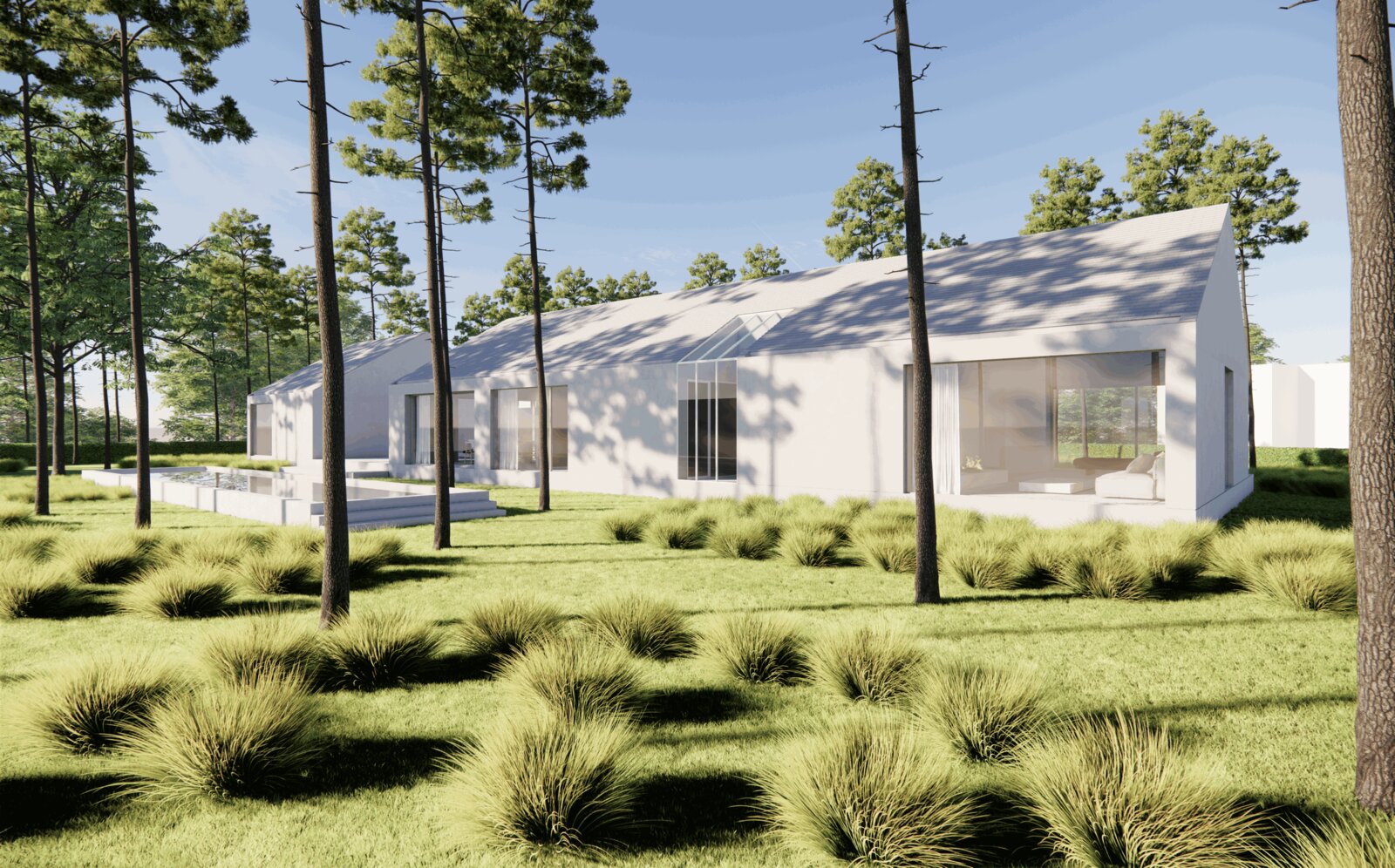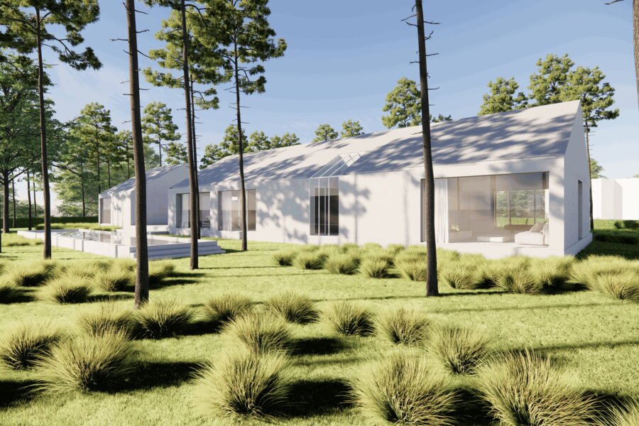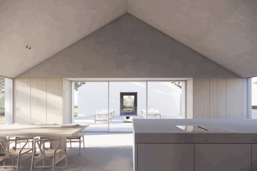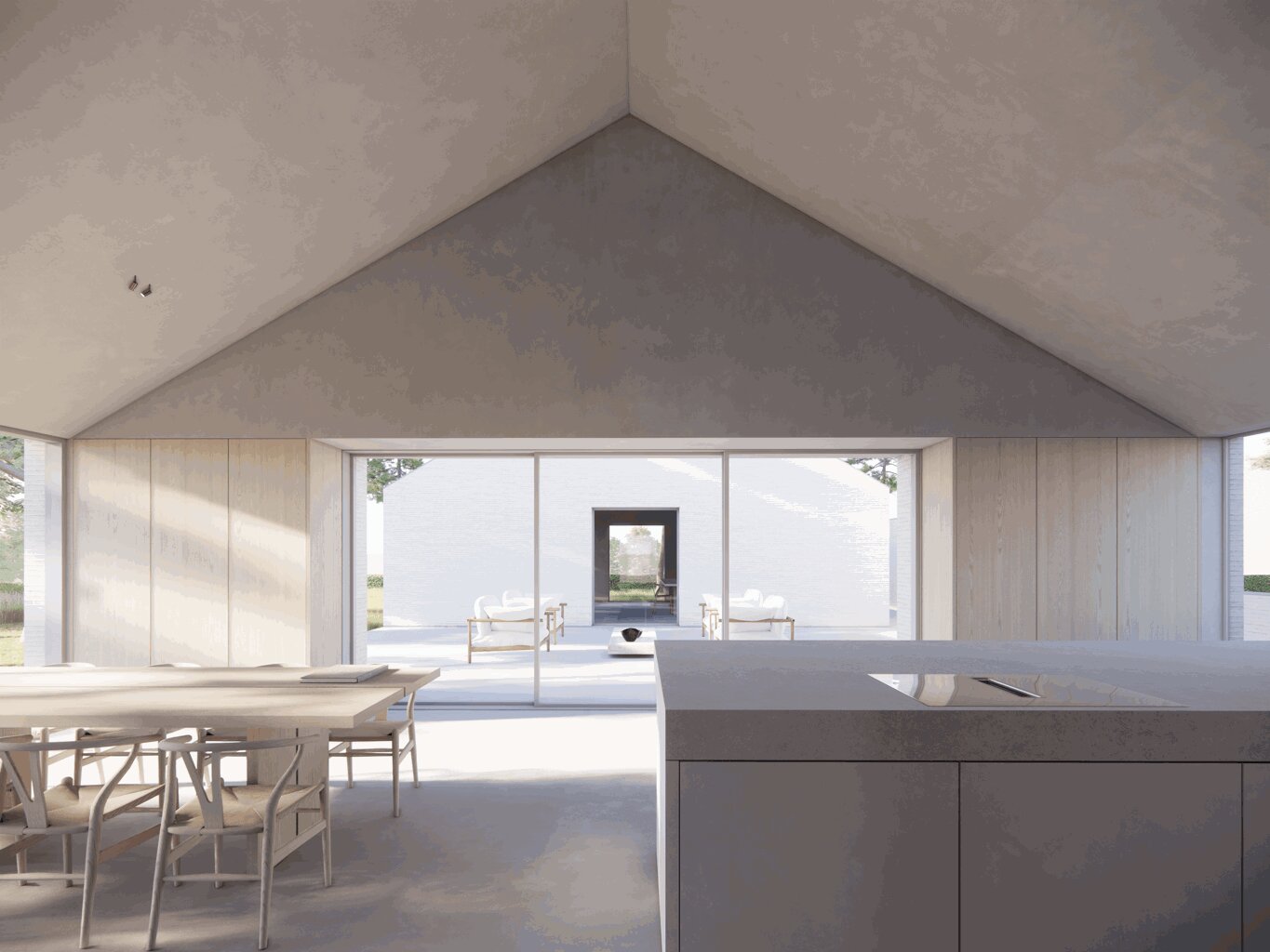 Pour ce terrain unique, le permis de construire et le projet sont déjà disponibles, mais vous êtes libre d’y apporter votre propre vision. Le permis concerne une villa de plain-pied avec bassin de nage, conçue par l’architecte Sofie Ooms. En quête d’un équilibre idéal entre vie et travail, elle a imaginé cette maison de plain-pied composée de deux volumes asymétriques, harmonieusement reliés par un patio et une terrasse ouverte. Un espace de vie et de travail confortable, baigné de lumière naturelle dans toutes les pièces. Des espaces supplémentaires en sous-sol accueillent les installations techniques, un garage et un atelier offrant une vue apaisante et inspirante sur le jardin en pente à l’anglaise, les cimes des arbres et l’immensité du ciel.